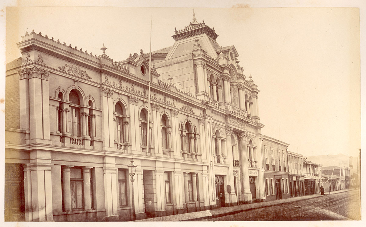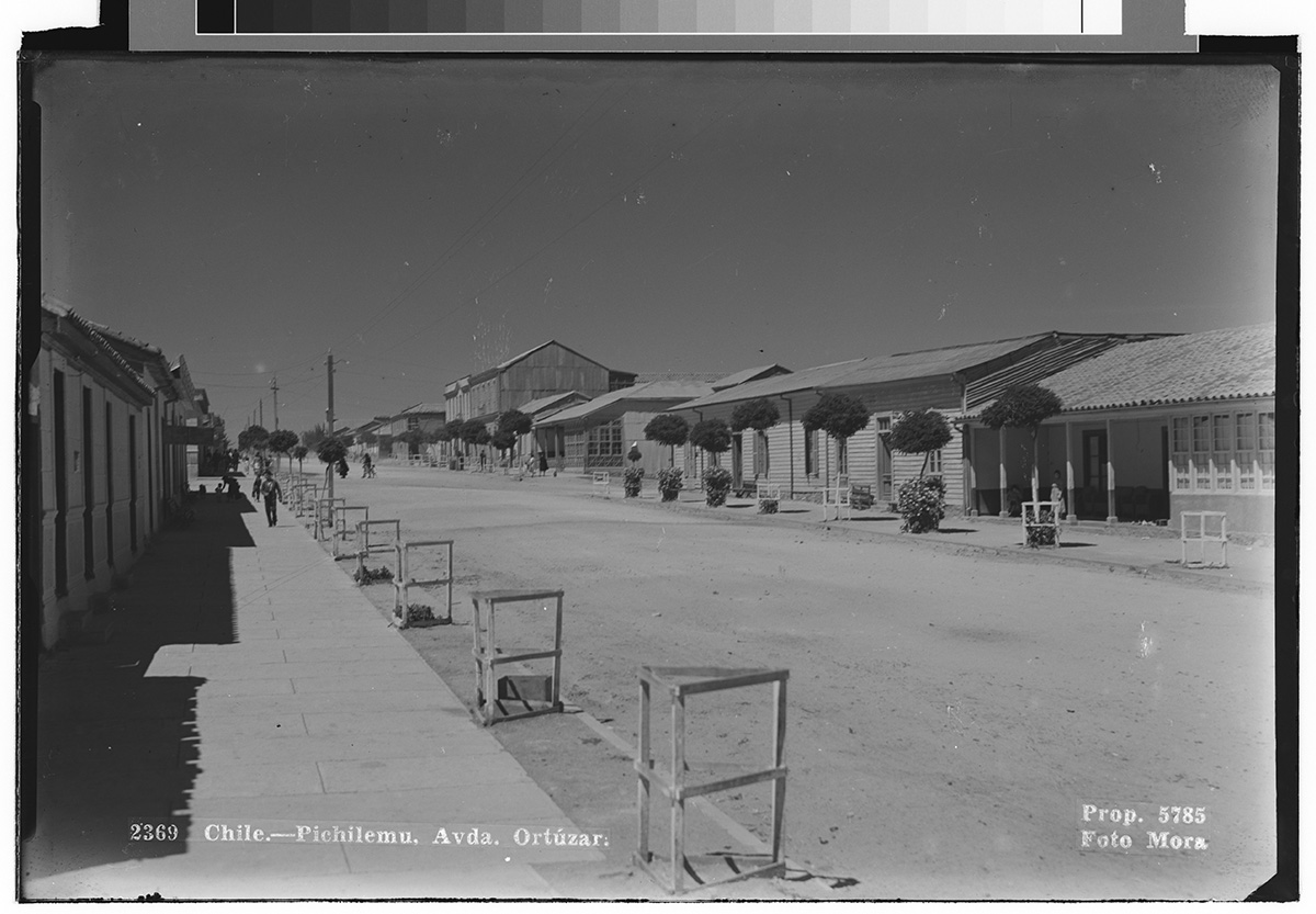 Vista de una calle ancha con rieles de tramway en su centro y casas a los costados. En el fondo se ve una iglesia.