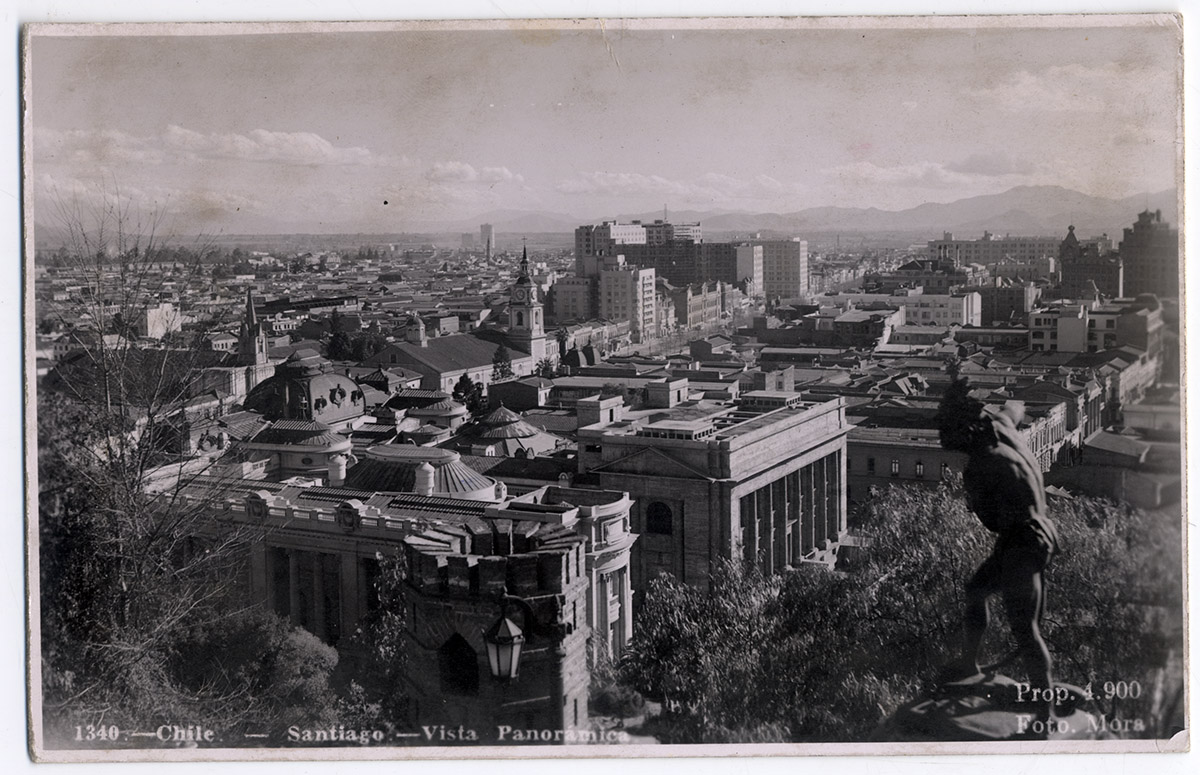Vista desde lo alto de un camino en medio de la cordillera. Se ven varias montañas, un río al costado del camino y se alcanza a ver una pequeña construcción.