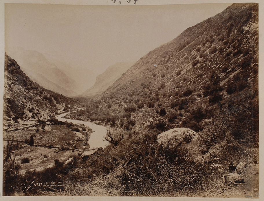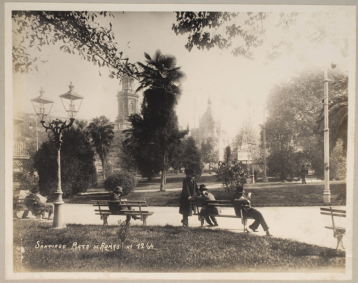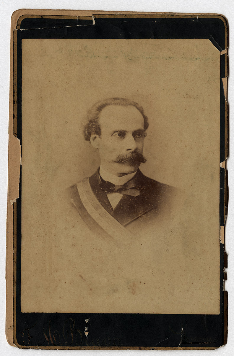 Retrato de pie de un hombre con barba, pantalón blanco y abrigo negro largo. Lleva un bastón en la mano y se apoya sobre un sillón de cuero.