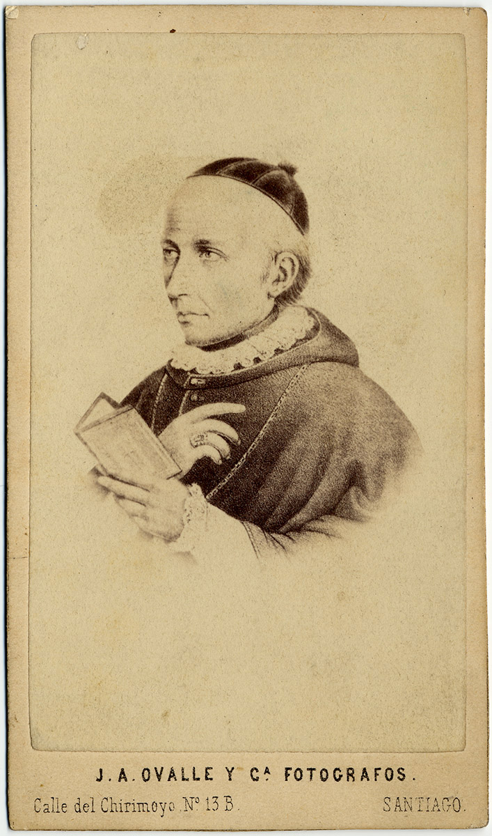 Retrato de perfil de un hombre con barba y bigote. Viste un terno negro con camisa blanca.