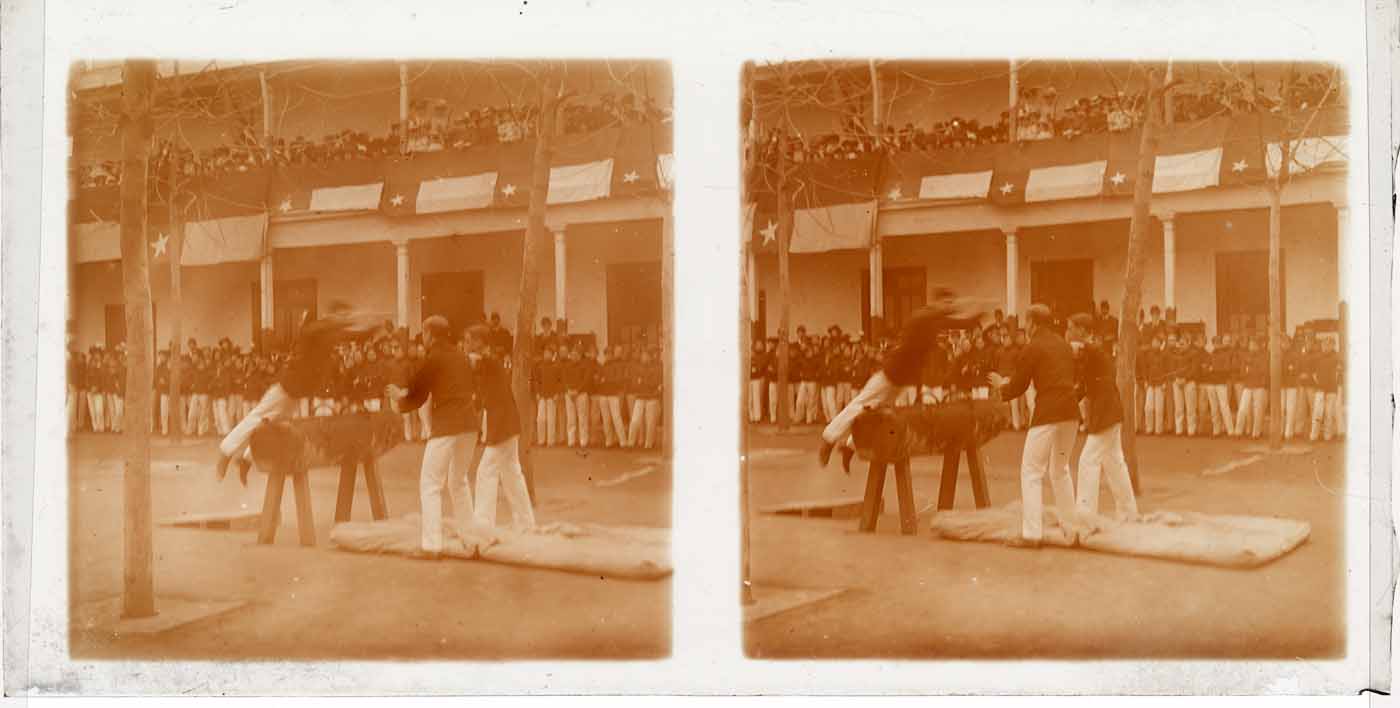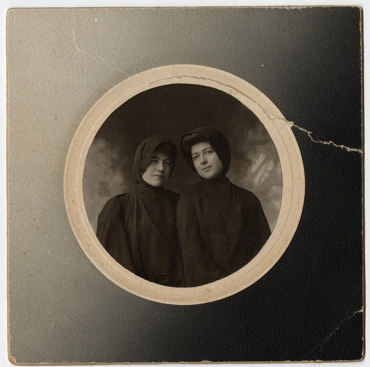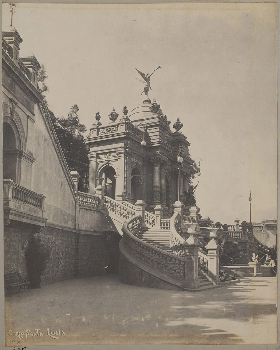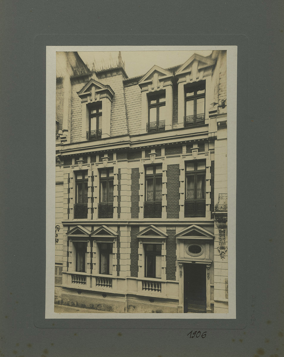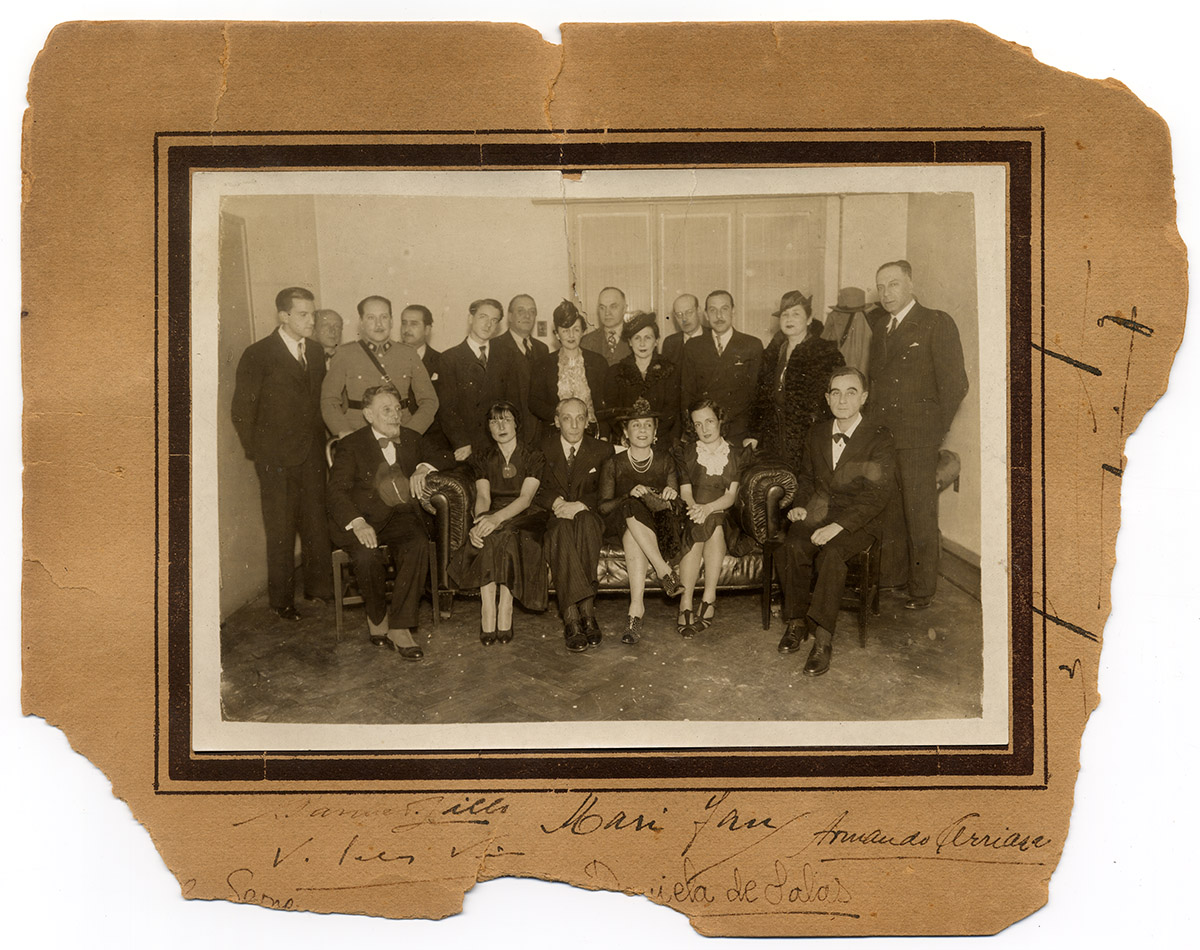 Retrato de una familia compuesta por un hombre mayor con terno negro y sentado sobre una silla. Atrás suyo se encuentran un hombre y una mujer parados y a sus lados dos niños con vestidos blancos cortos.