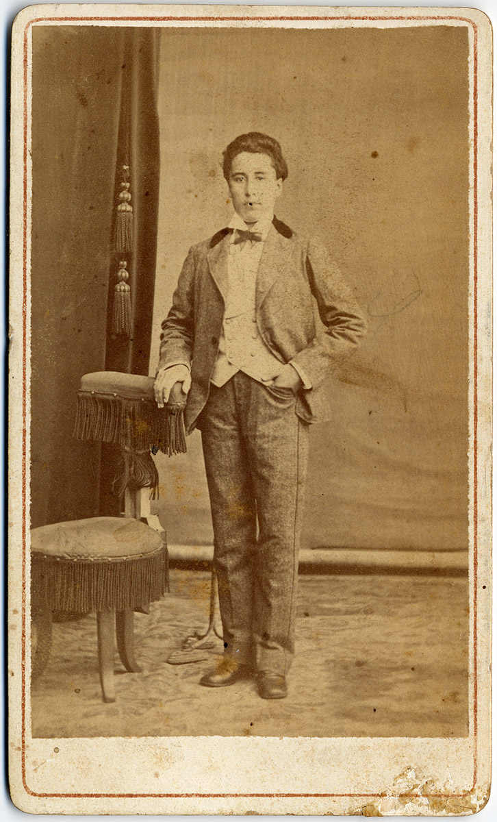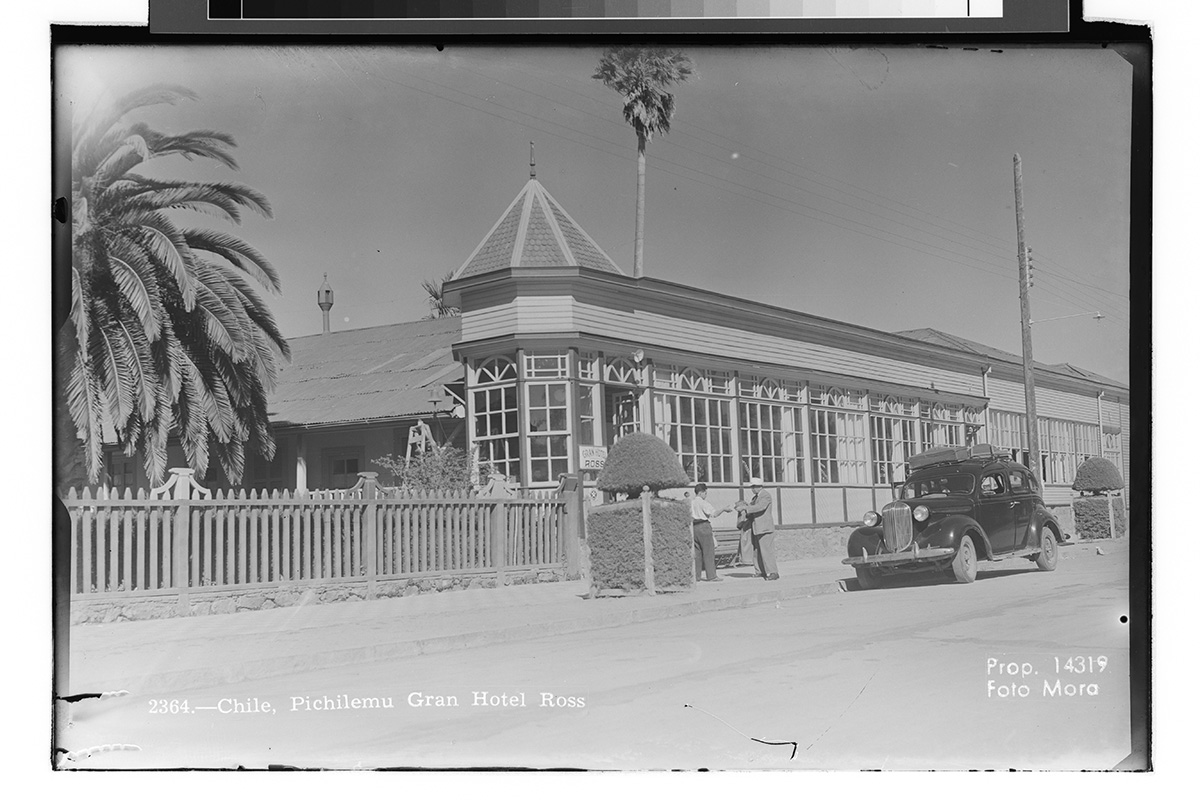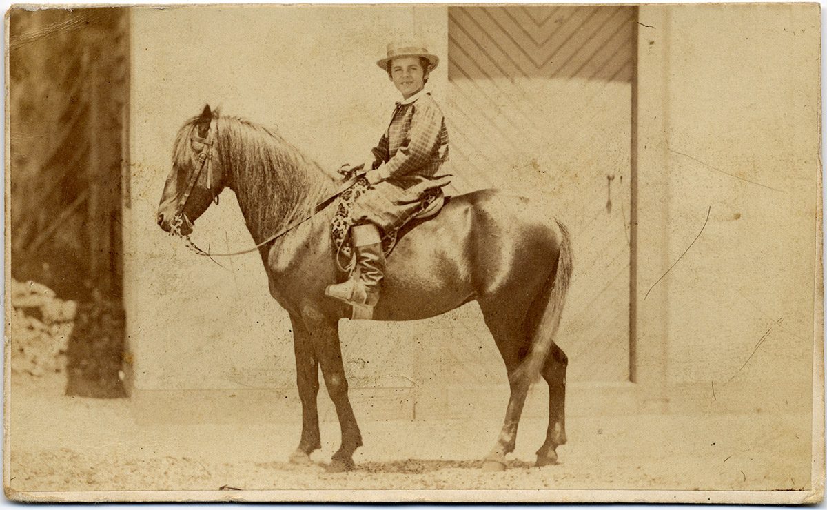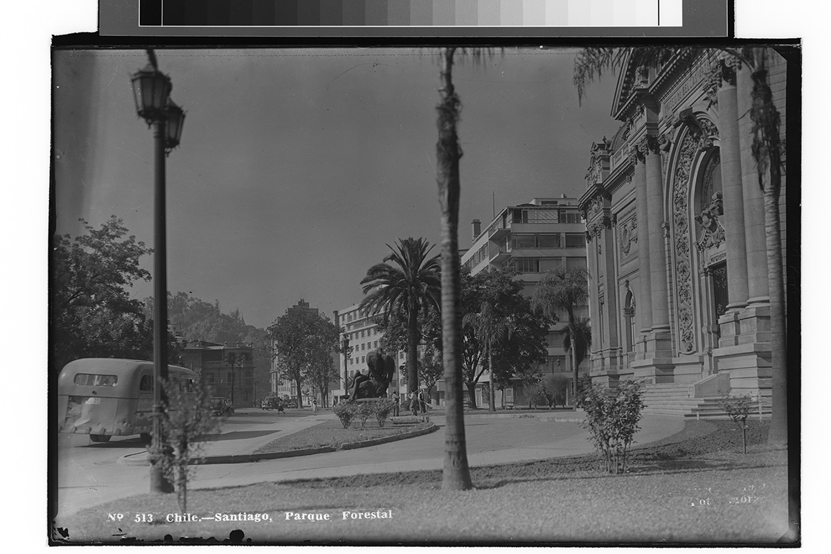 Vista de unas cascadas con rocas con una pequeña isla en el centro. Al borde del río se ven dos hombres y un perro parados.