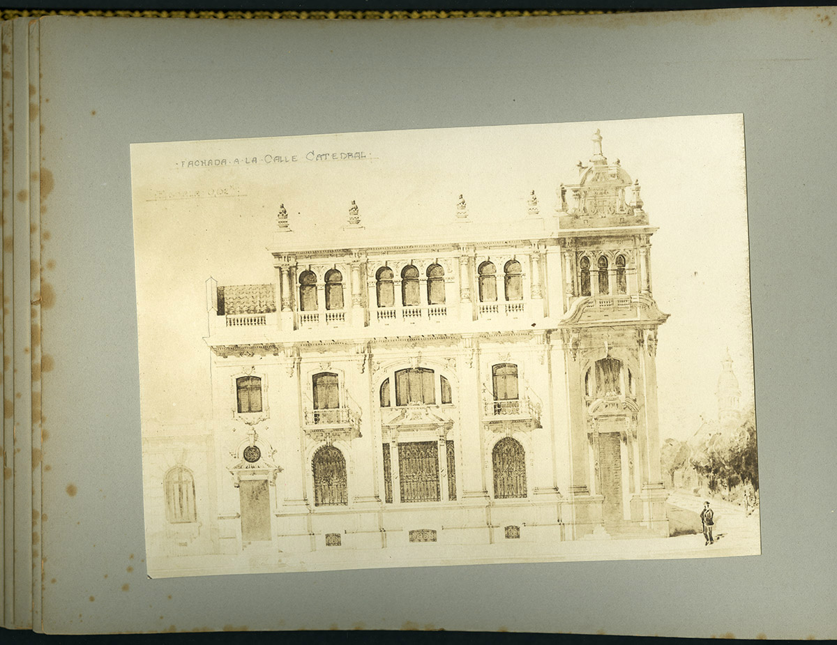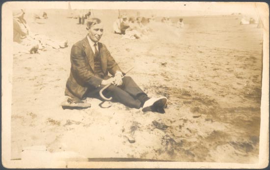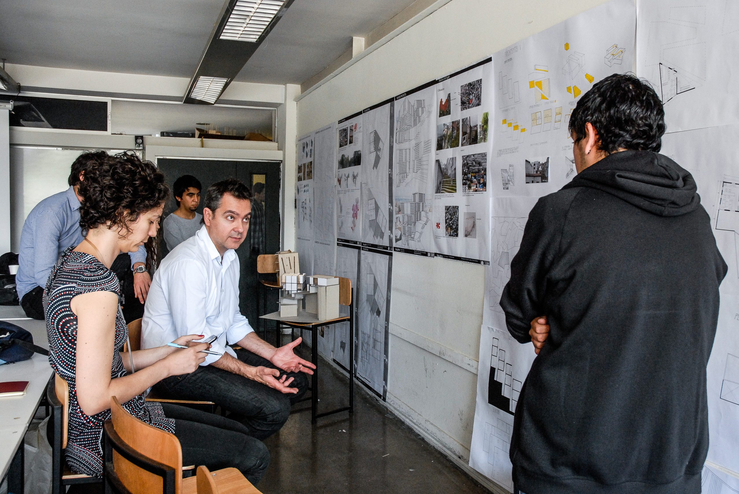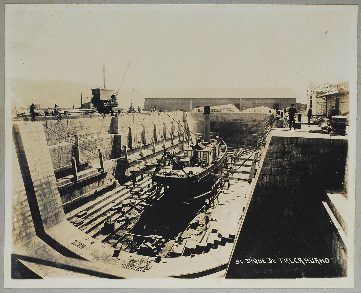 Vista de unas cascadas con rocas con una pequeña isla en el centro. Al borde del río se ven dos hombres y un perro parados.