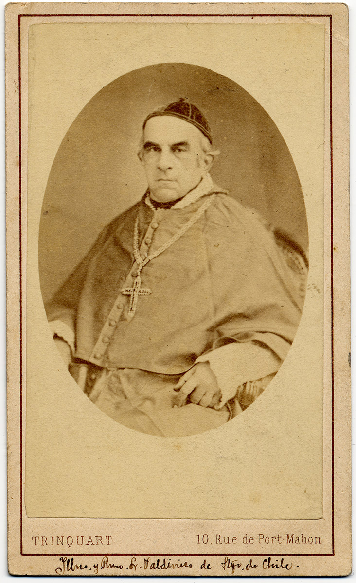 Retrato de forma ovalada y de busto de un hombre con barba y bigote. Viste un terno negro con camisa blanca y nudo negro.