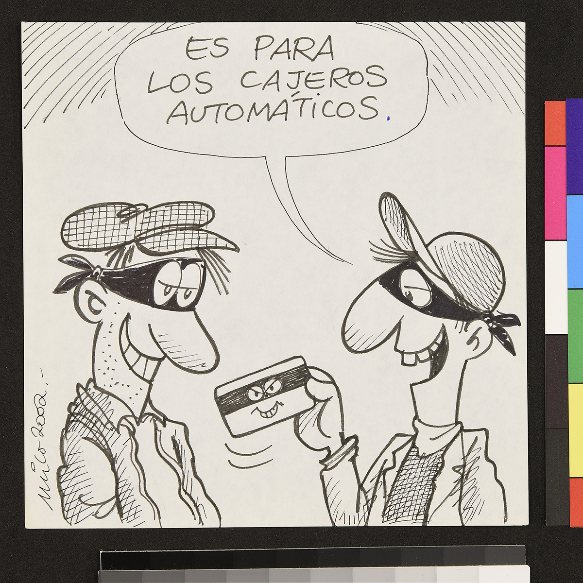 Dibujo de un hombre que mira una moneda que está de sobre la mesa, junto a un lápiz. Una mujer al costado derecho de la caricatura se asoma por la puerta para hablar.