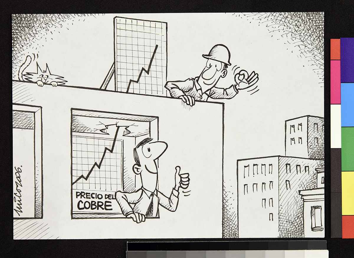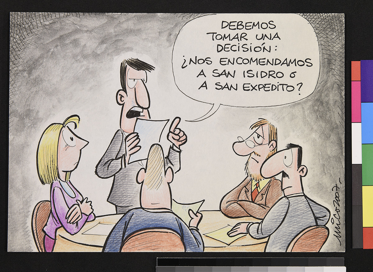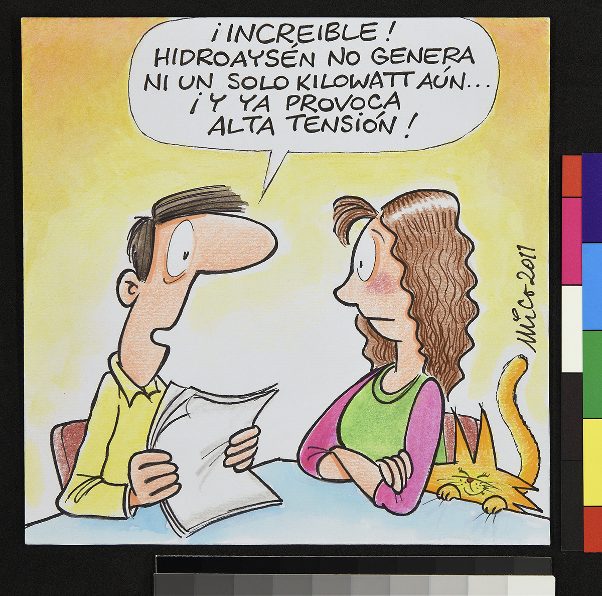 Dibujo de un hombre, una mujer y un gato frente a una mesa, mientras el hombre sostiene unos papeles en sus manos.