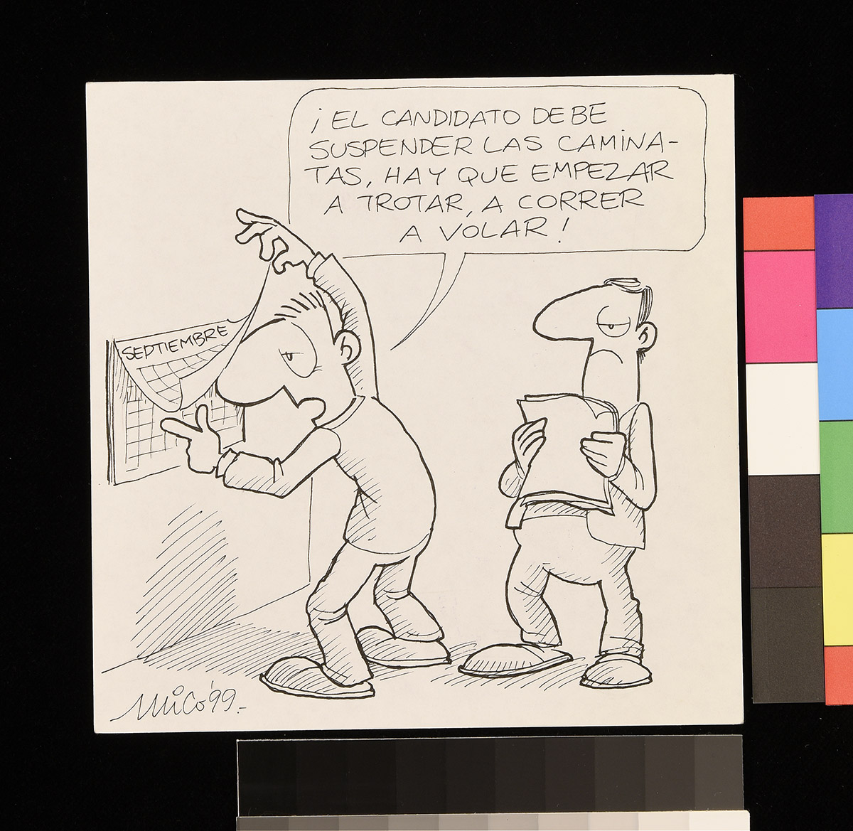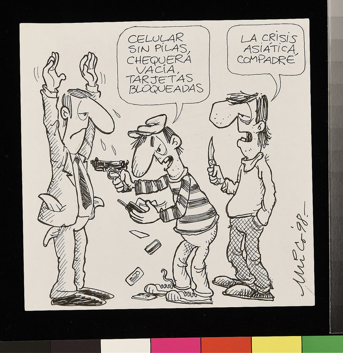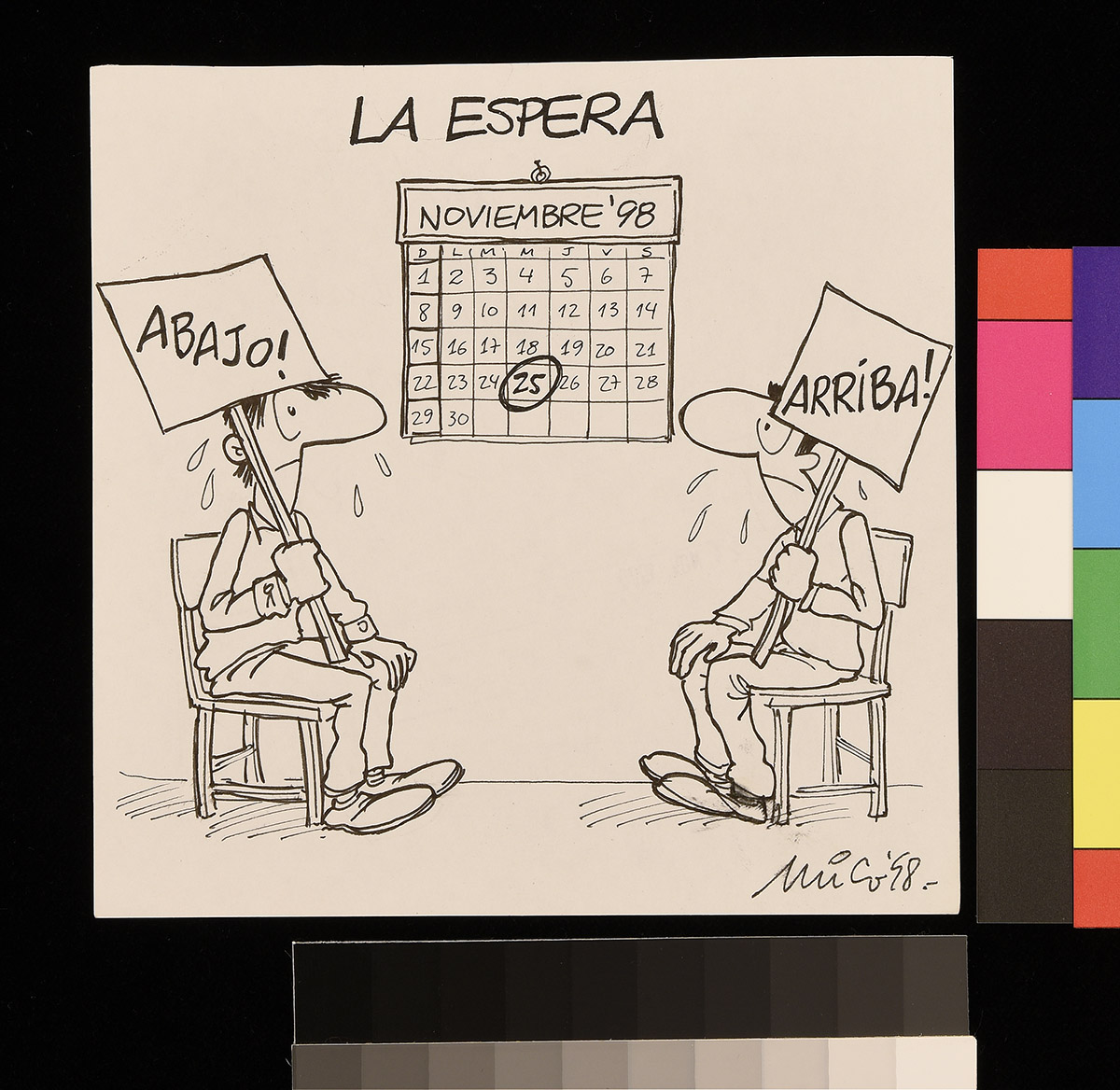 Dibujo de un hombre, una mujer y un gato frente a una mesa, mientras el hombre sostiene unos papeles en sus manos.