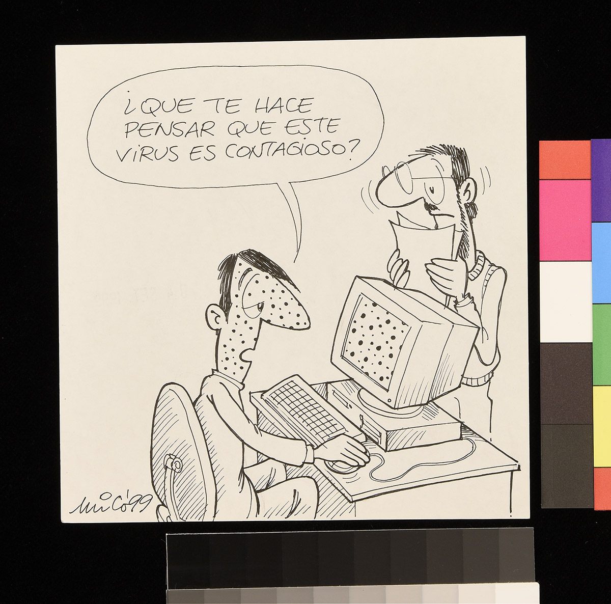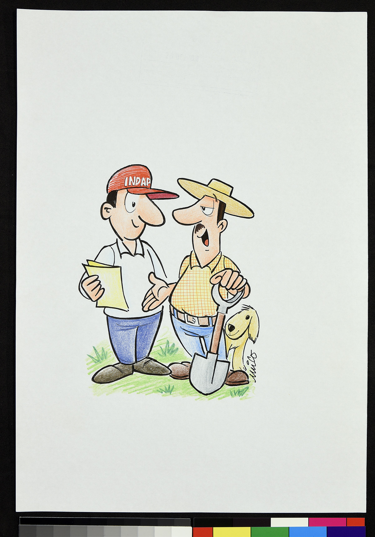 Dibujo de un hombre se encuentra sentado detrás de un escritorio donde se puede leer “Generadora eléctrica Eléctroshock S.A. “. El hombre se encuentra atendiendo dos teléfonos uno de forma enojada y otro de forma calmada.
