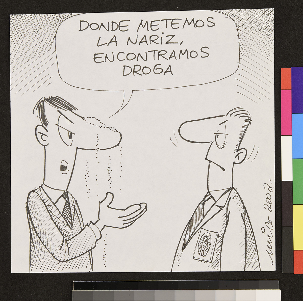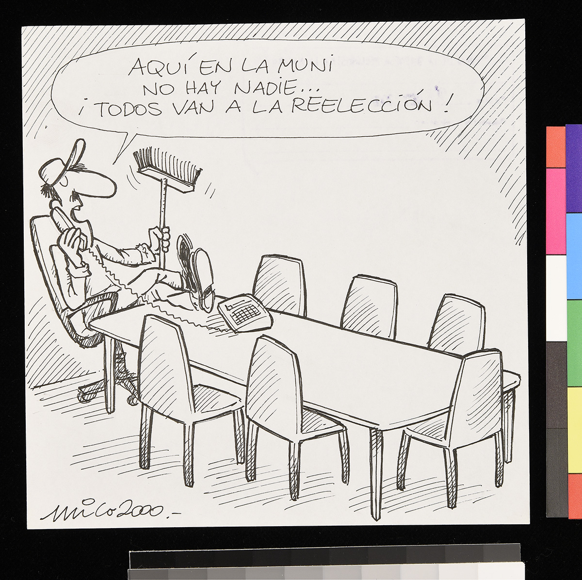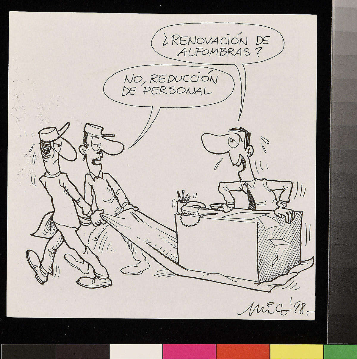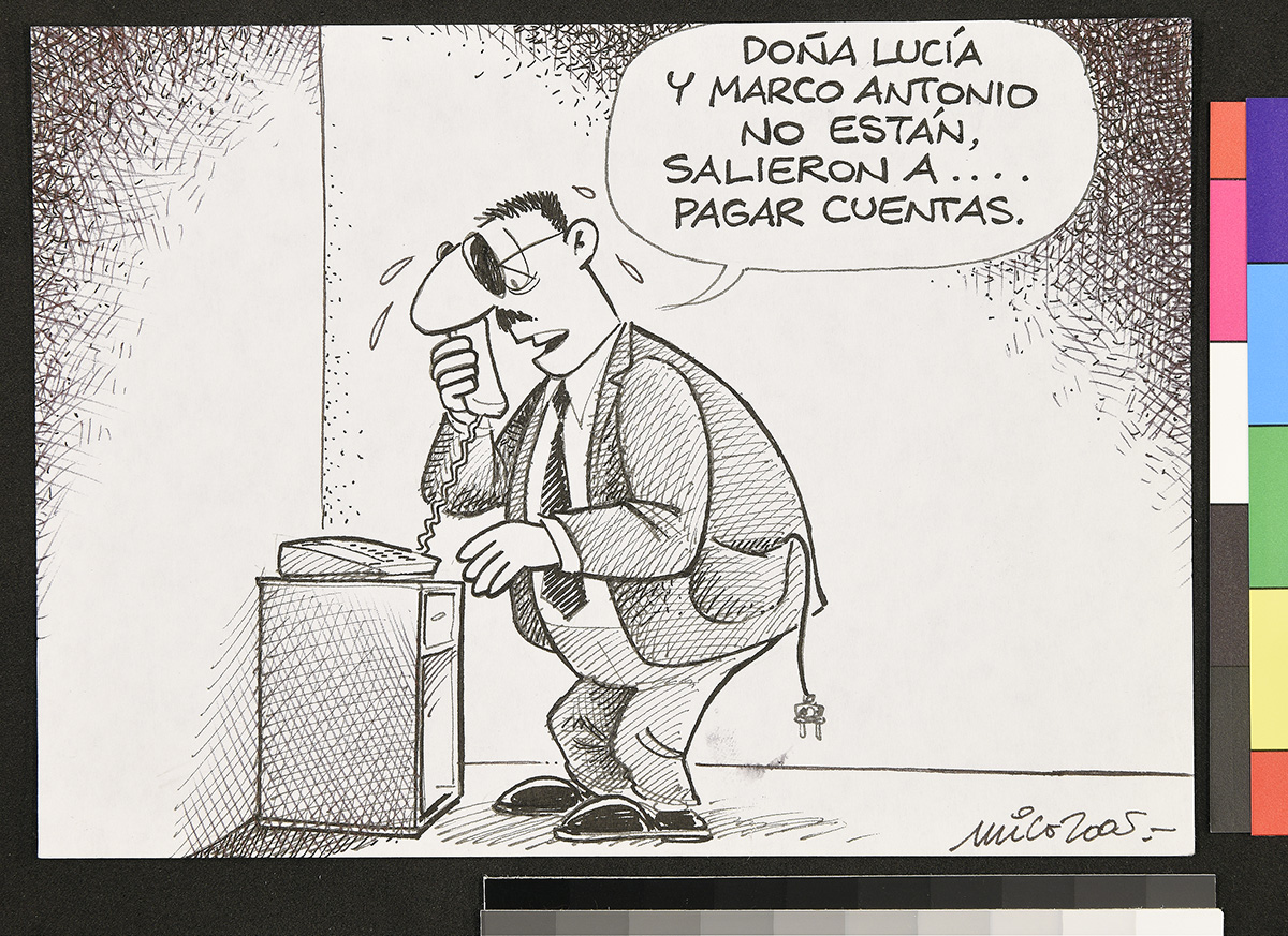 Dibujo de dos hombres que están conversando sentados frente a una mesa. Uno de ellos lee un papel que sostiene un papel en una de sus manos, y en el otro sostiene un periódico. Al costado izquierdo de la caricatura se ven varios cuadros colgados en la pared.