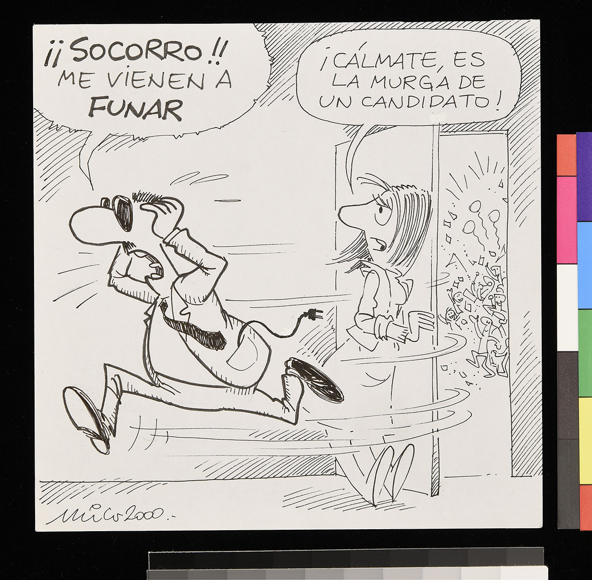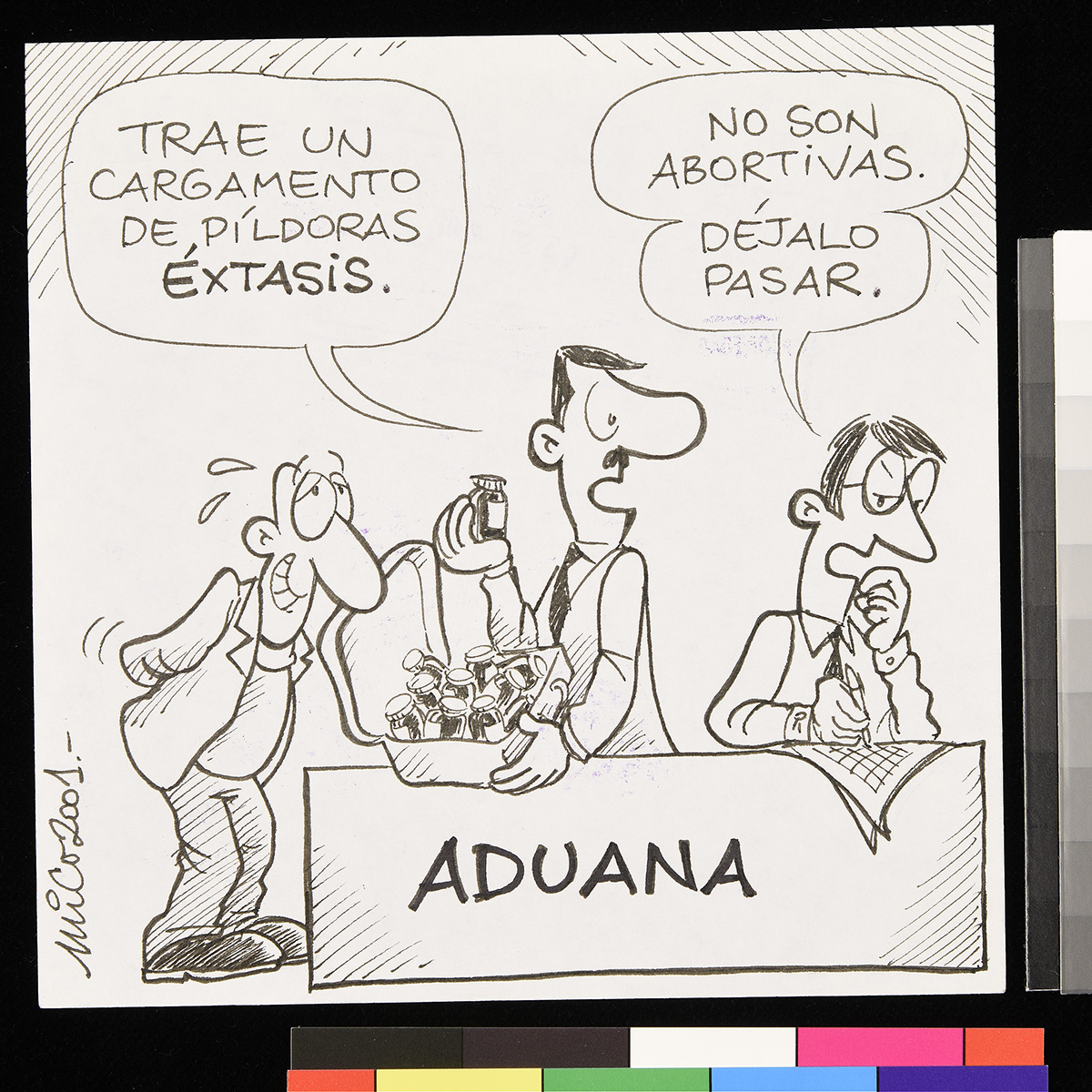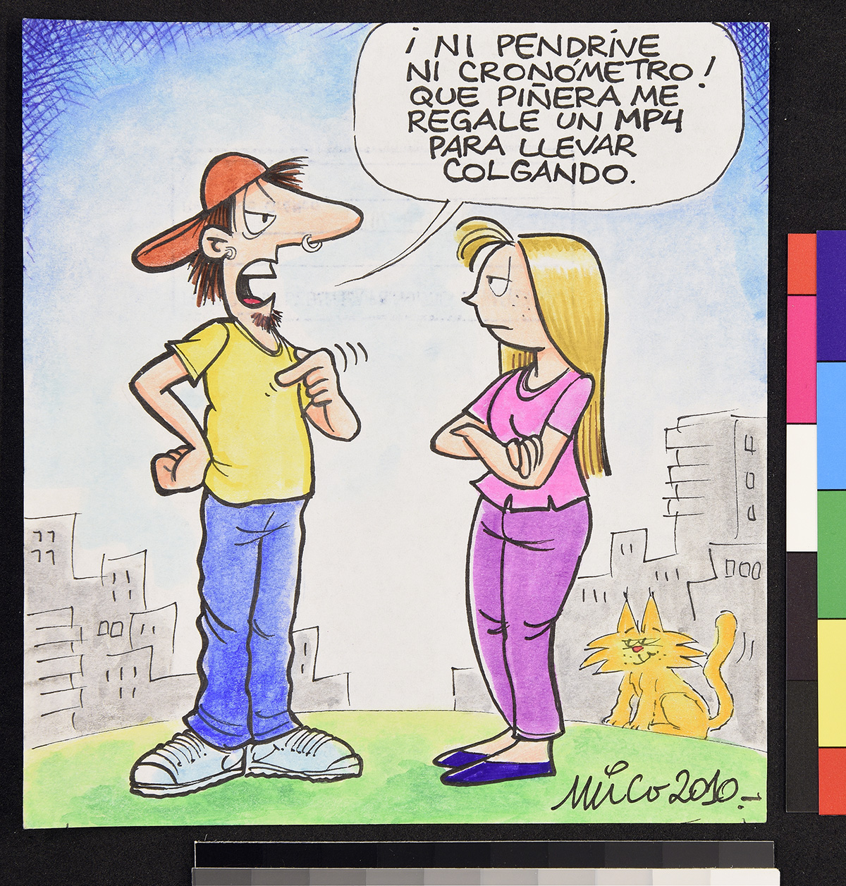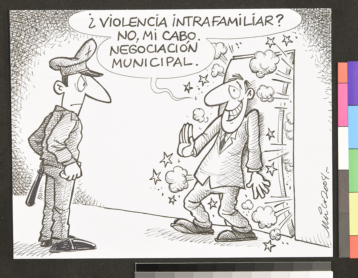 Dibujo de dos hombres que están conversando sentados frente a una mesa. Uno de ellos lee un papel que sostiene un papel en una de sus manos, y en el otro sostiene un periódico. Al costado izquierdo de la caricatura se ven varios cuadros colgados en la pared.