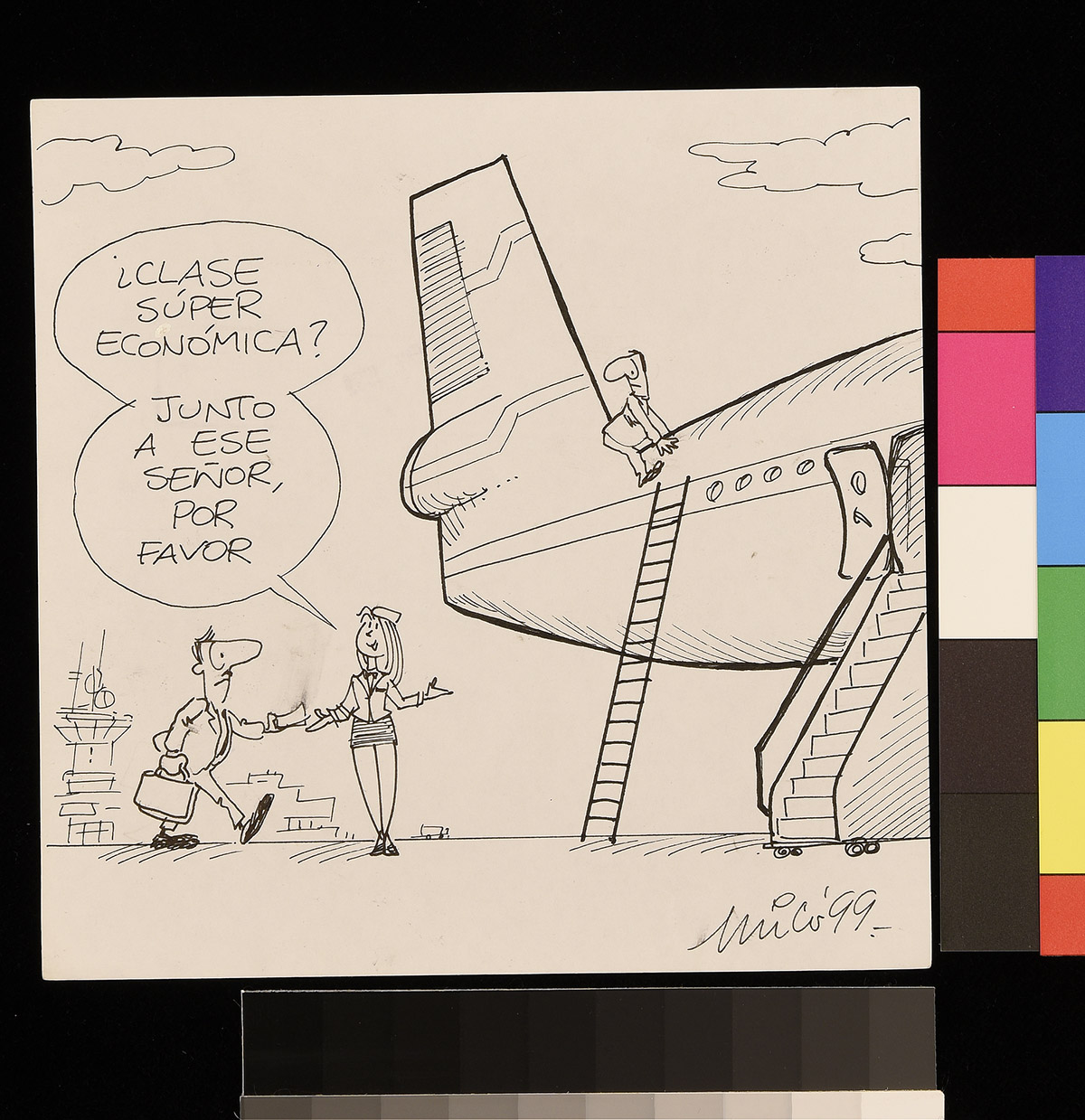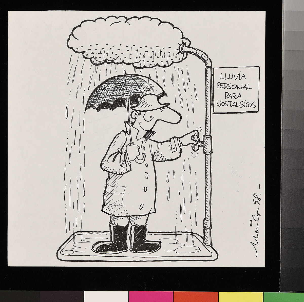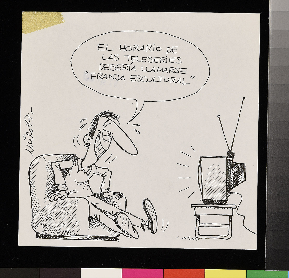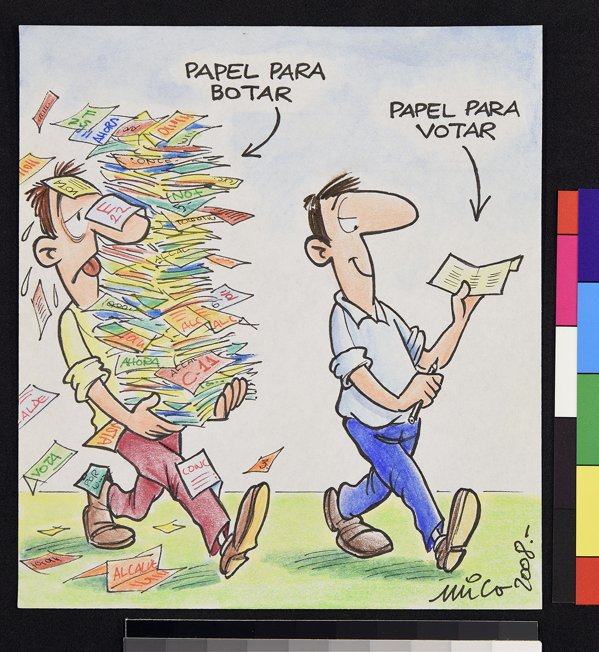 Dibujo de dos hombres que están conversando sentados frente a una mesa. Uno de ellos lee un papel que sostiene un papel en una de sus manos, y en el otro sostiene un periódico. Al costado izquierdo de la caricatura se ven varios cuadros colgados en la pared.