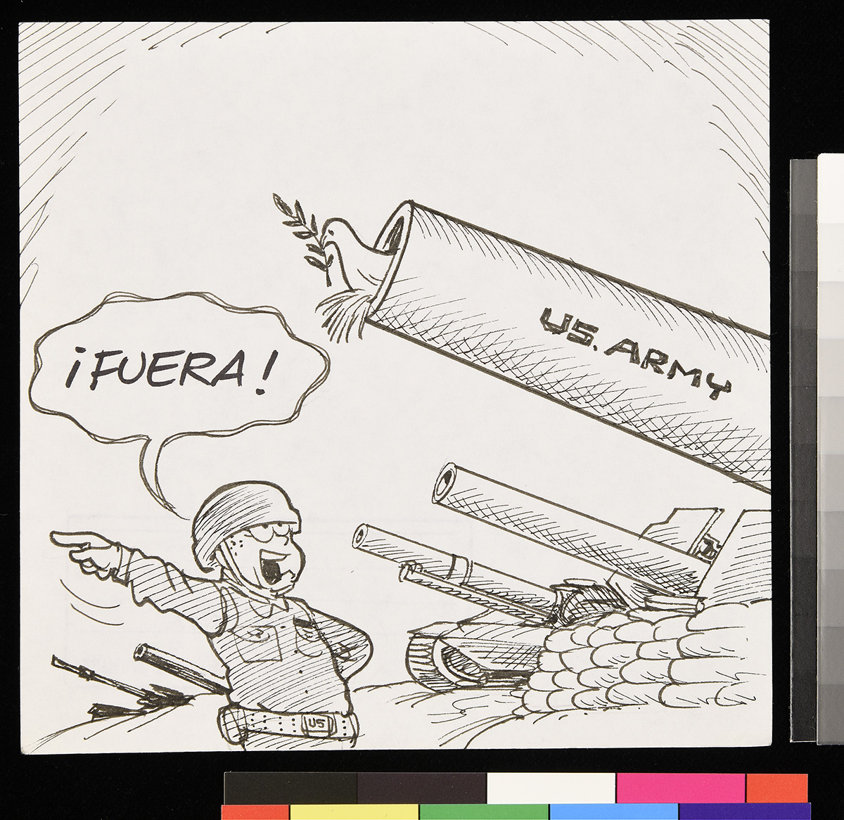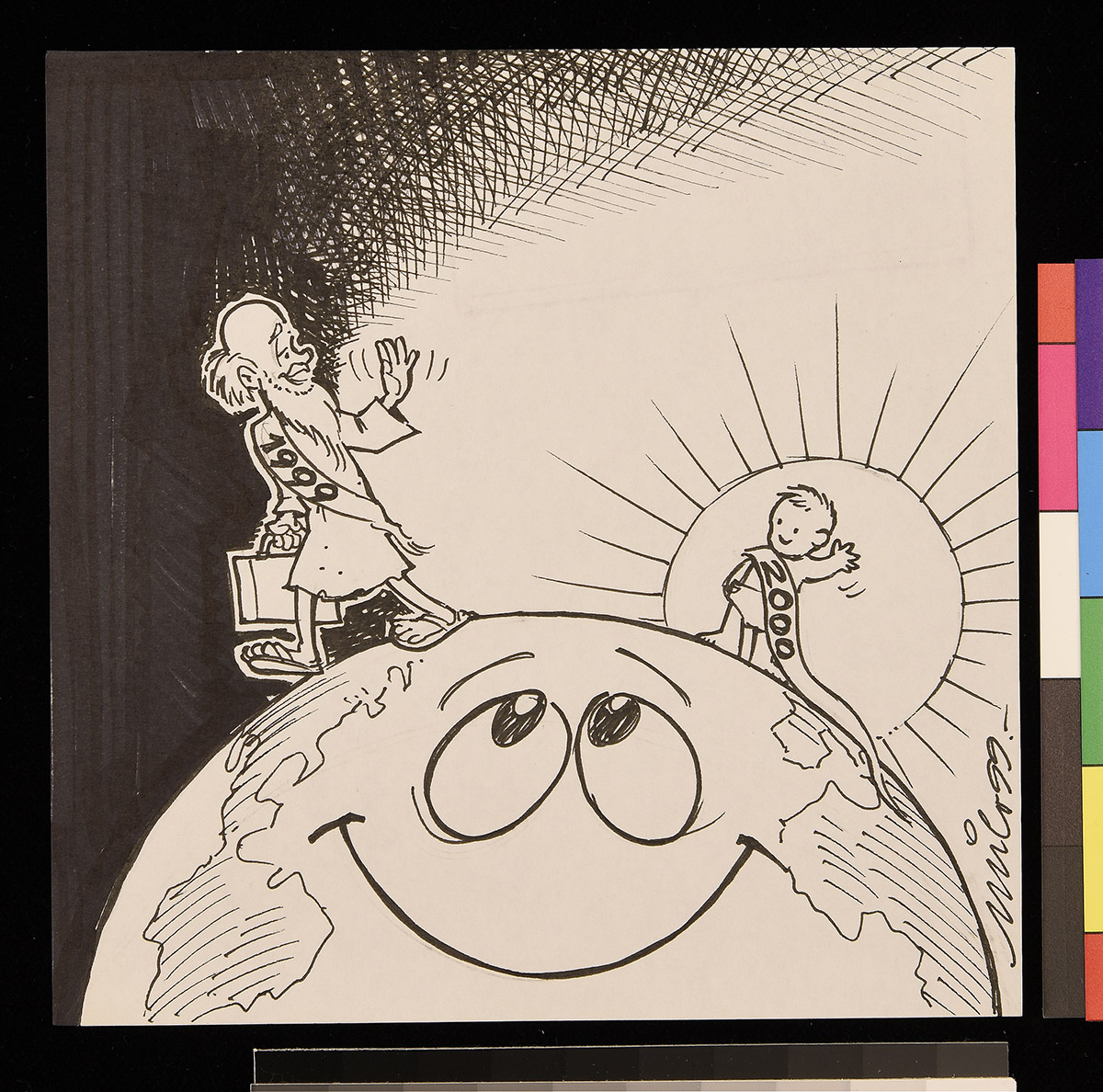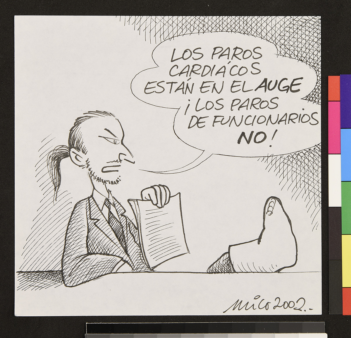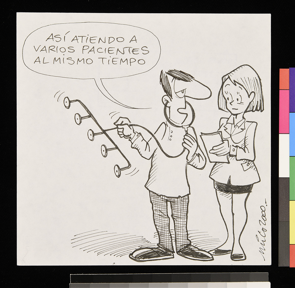 Dibujo de dos hombres que caminan juntos mientras miran una carpeta con un cinturón en su interior.
