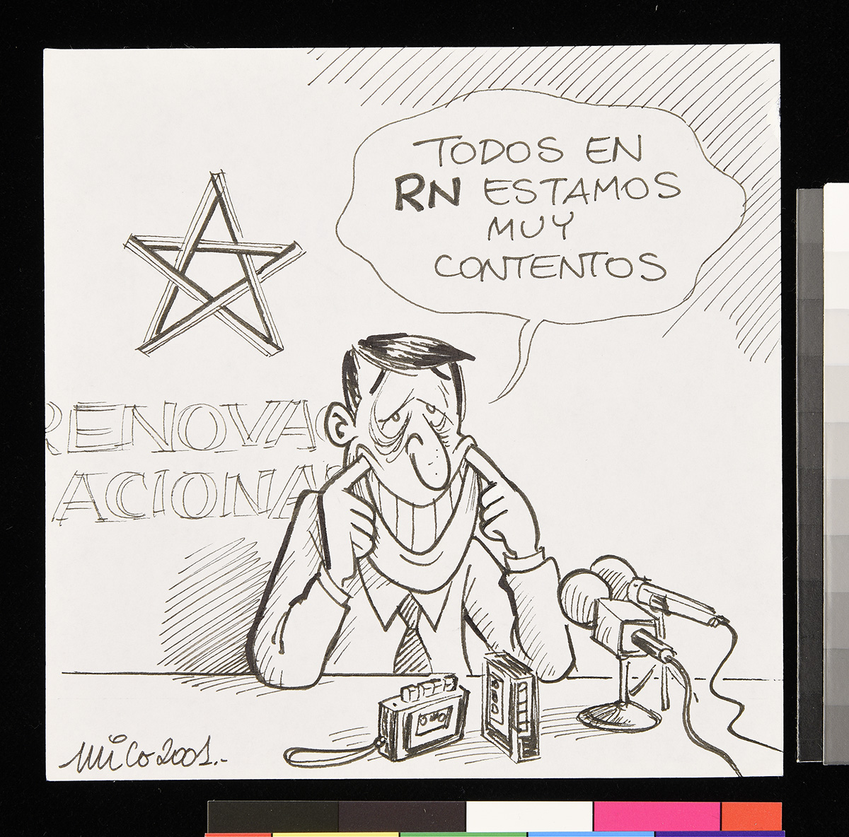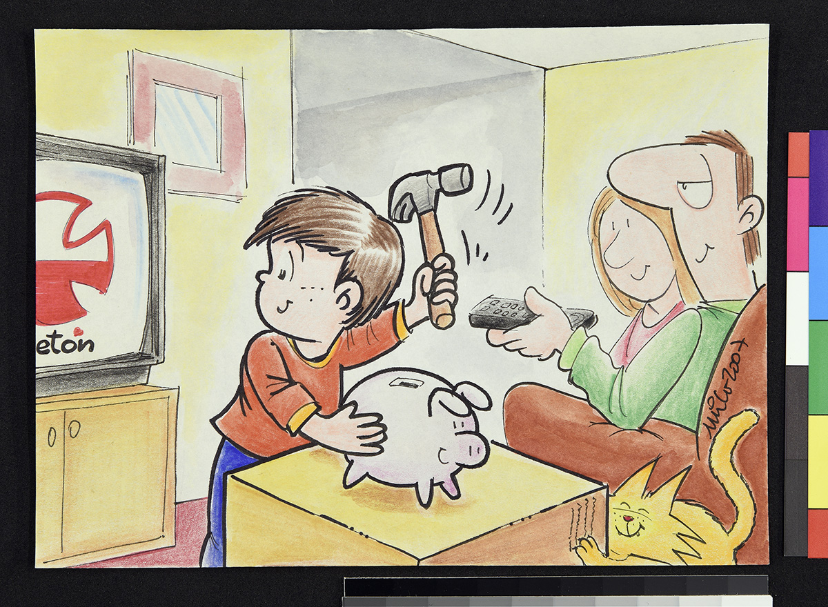Dibujo de un hombre que consuela a un hombre mientras coloca un papel que dice “patéame” en la espalda.
