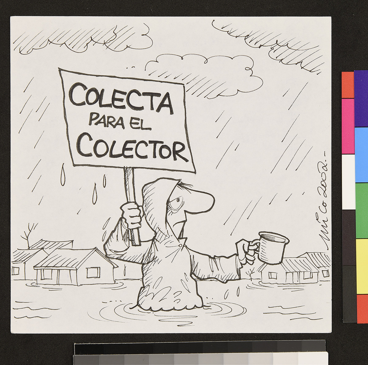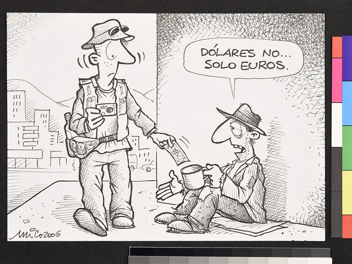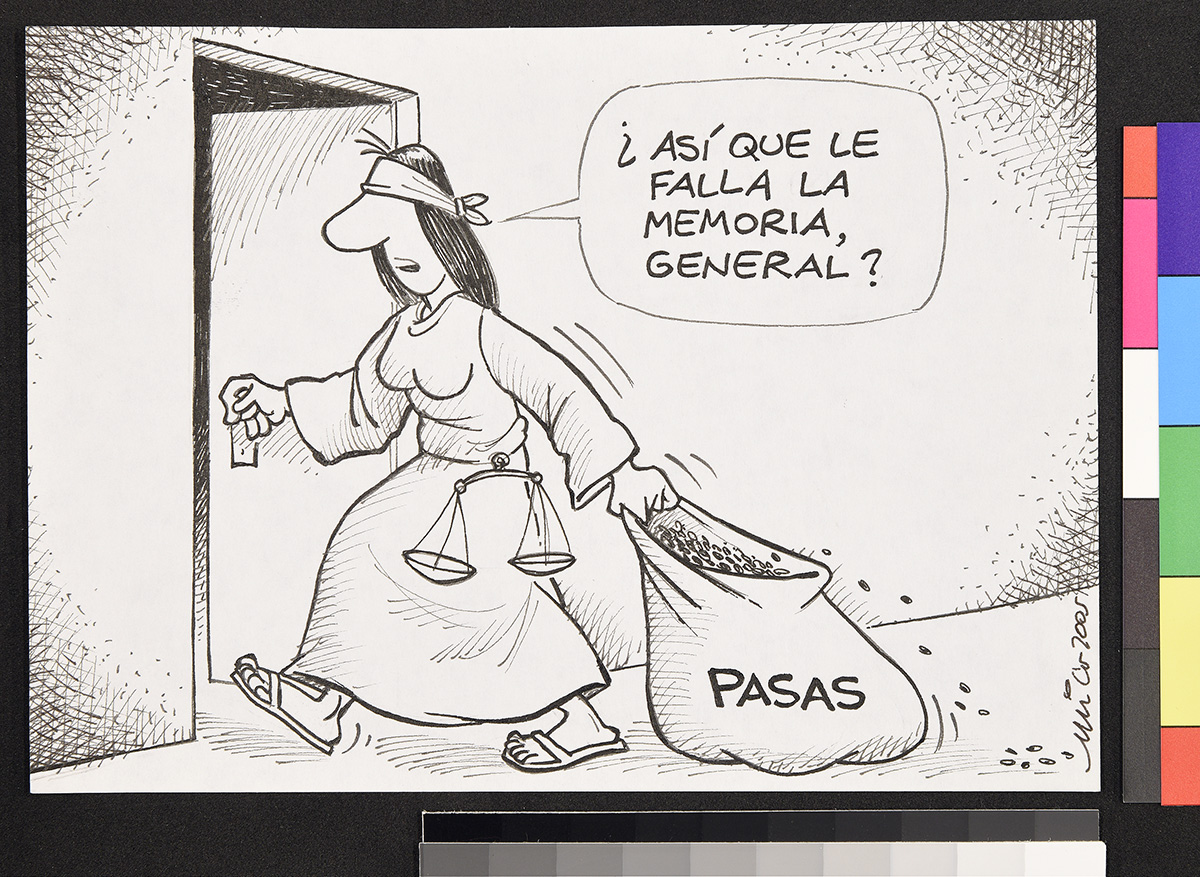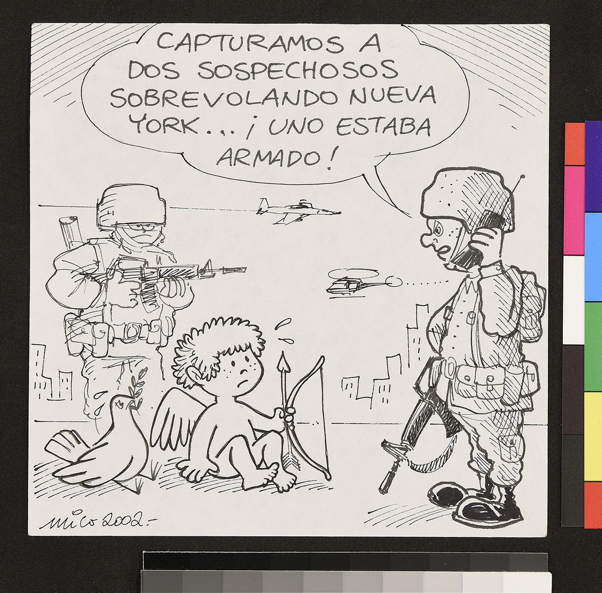 Dibujo de un soldado en un tanque afuera de una casa, donde una mujer apoya sus brazos en la puerta de entrada.