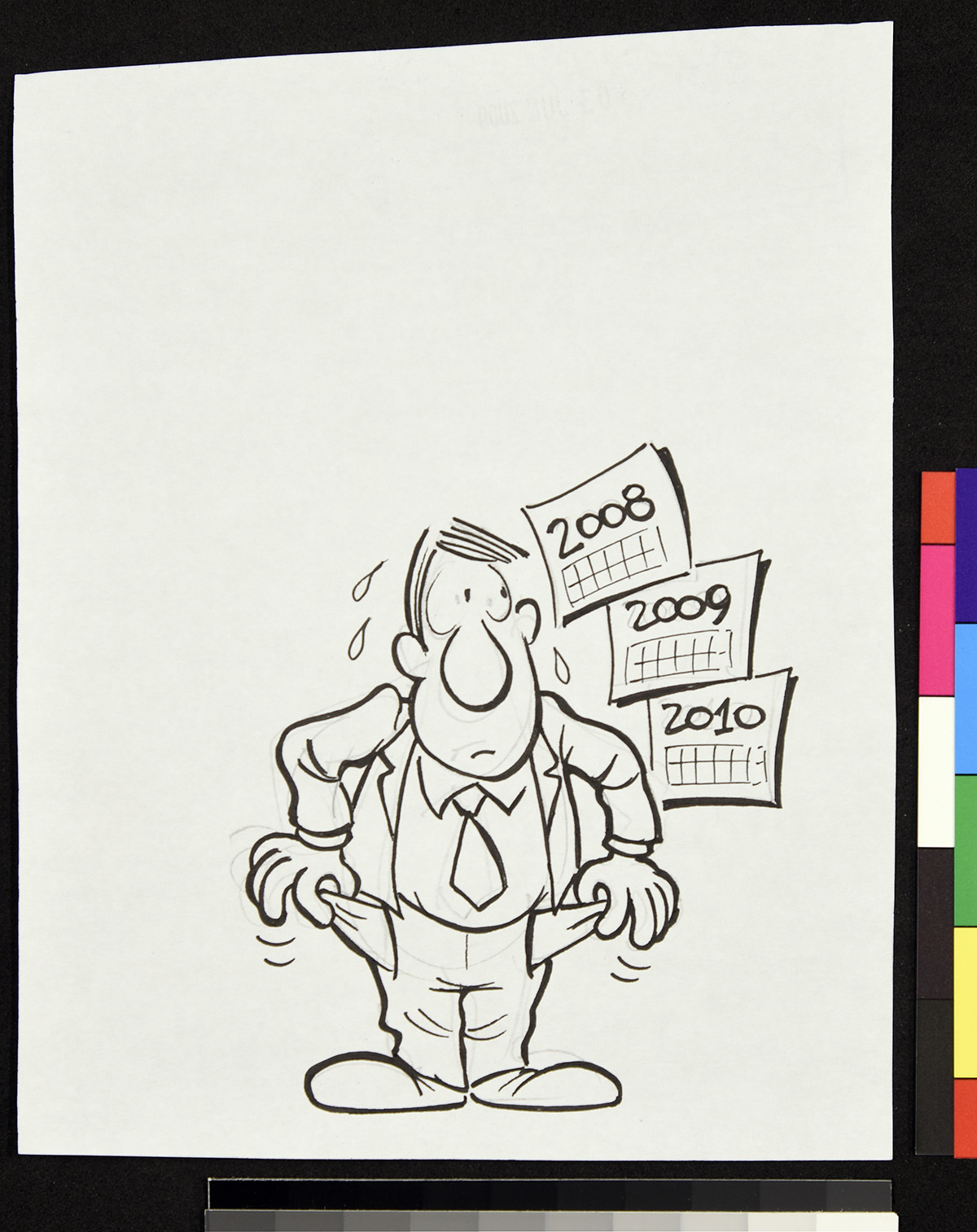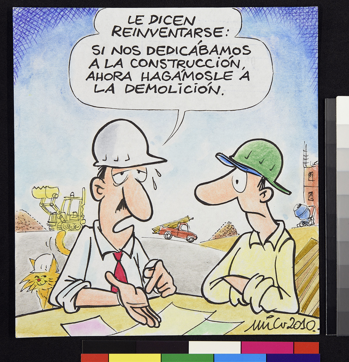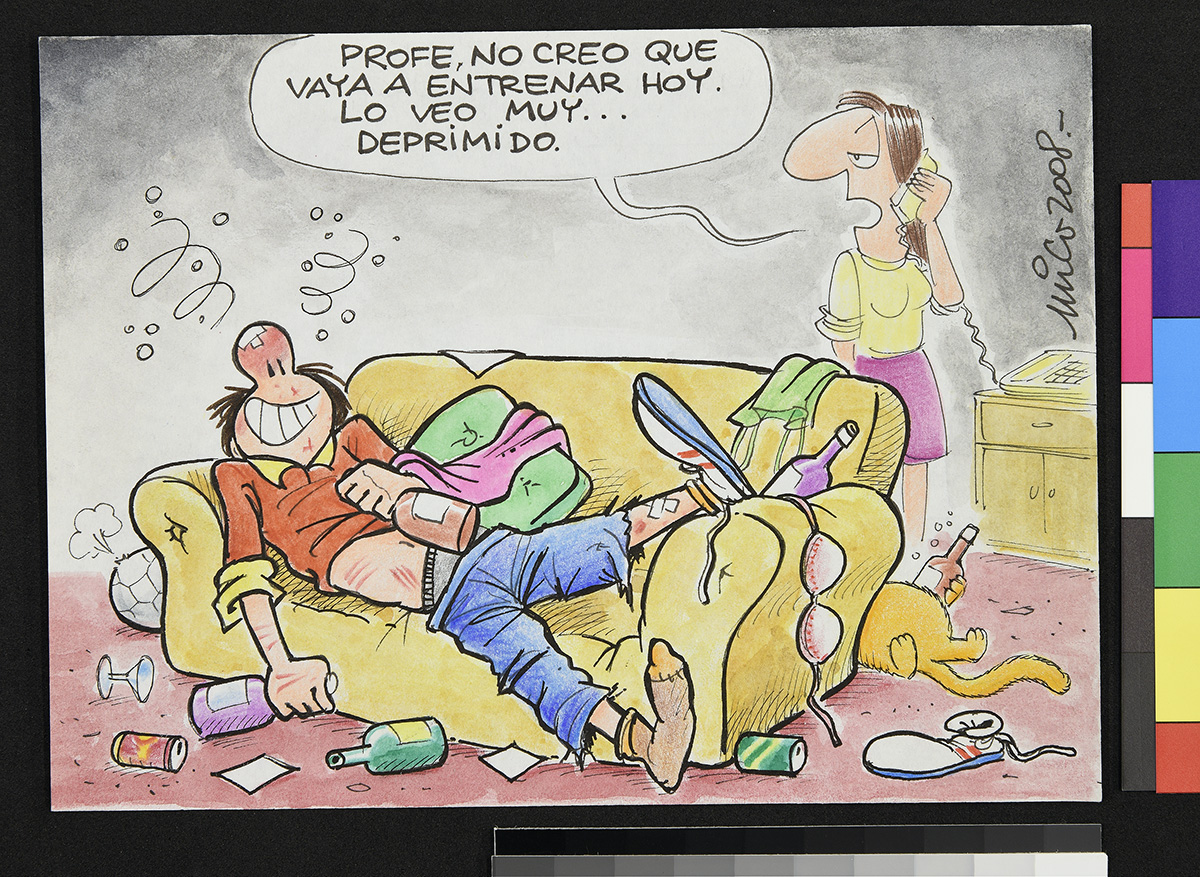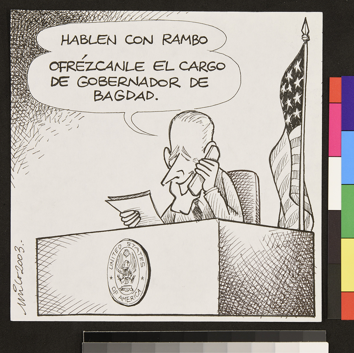 Dibujo de un soldado en un tanque afuera de una casa, donde una mujer apoya sus brazos en la puerta de entrada.