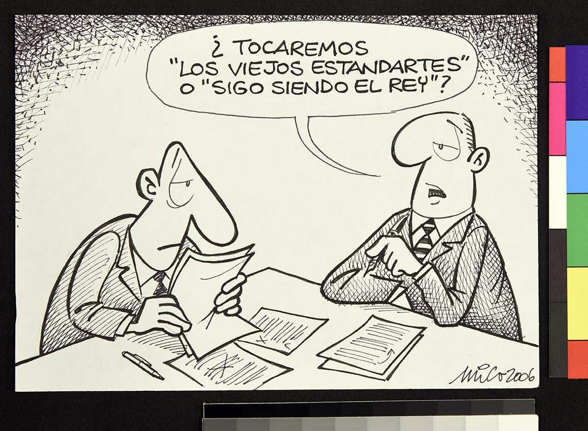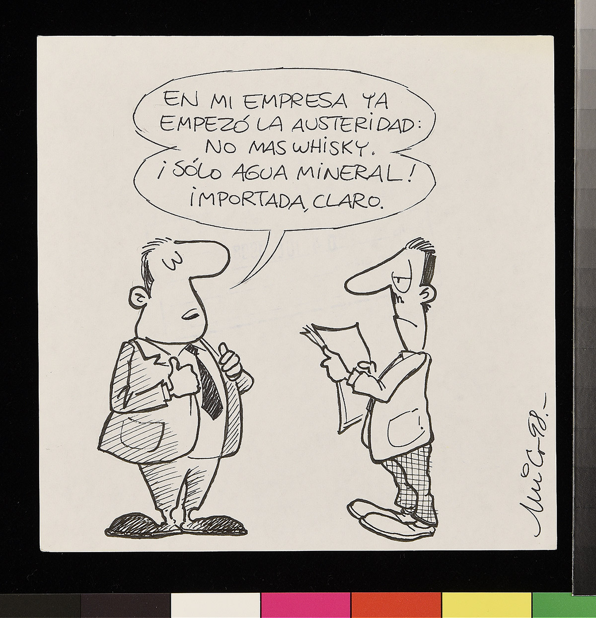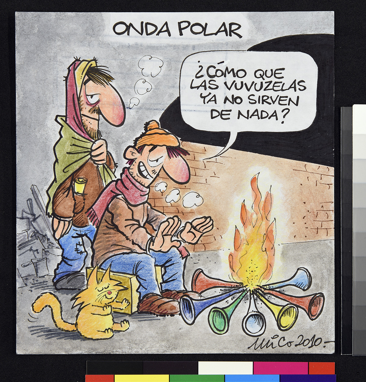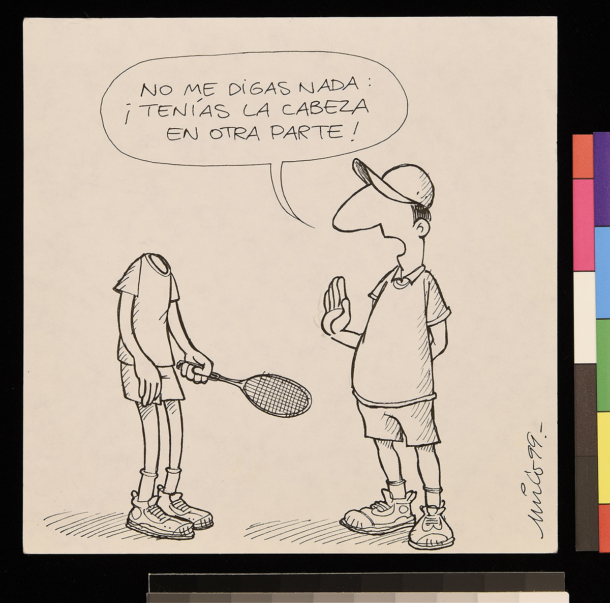 Dibujo de un hombre que se encuentra de pie, vestido con ropa deportiva y sosteniendo deshumano una raqueta pero sin cabeza. Otro hombre conversa con el vestido de la misma forma.