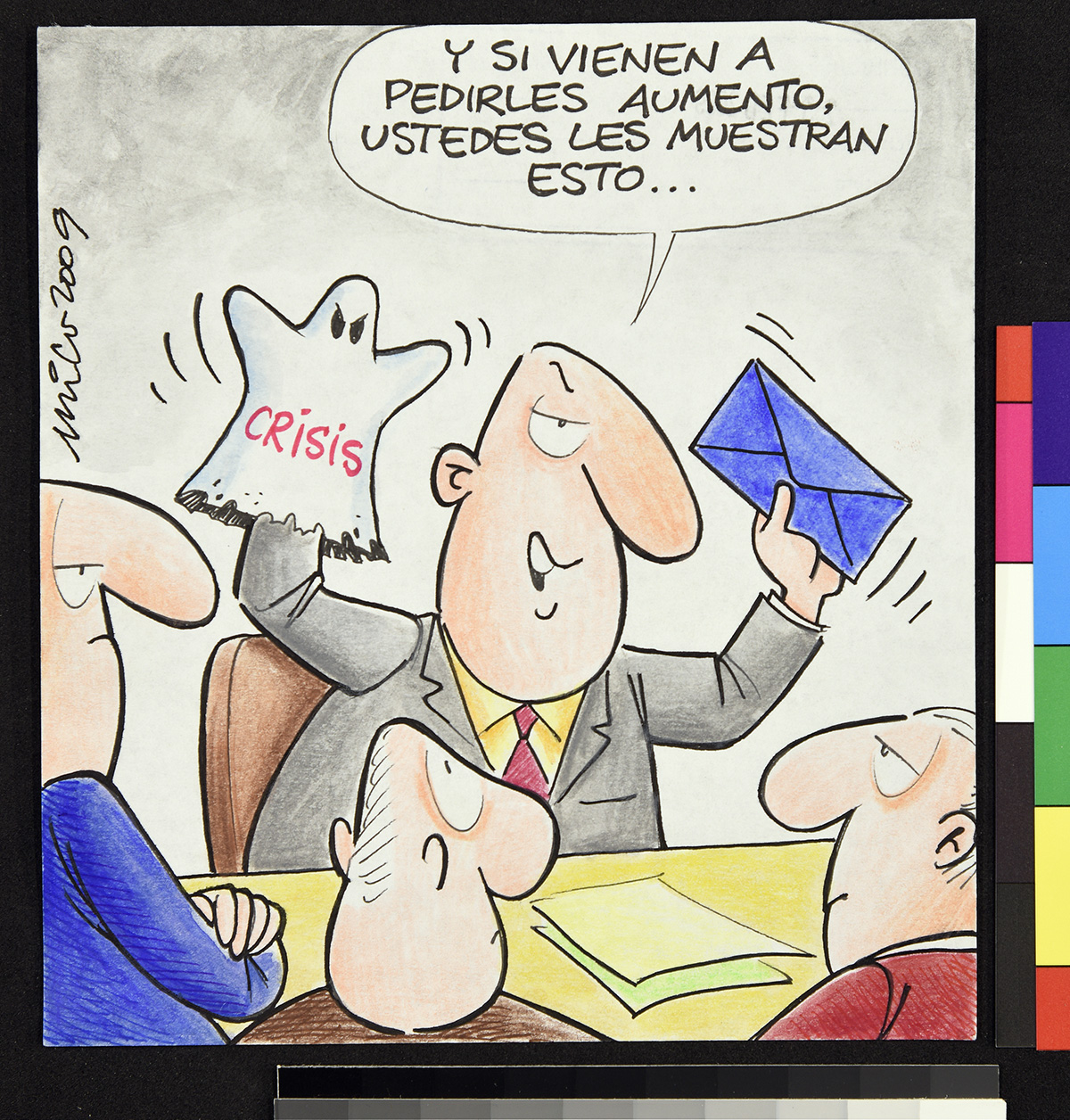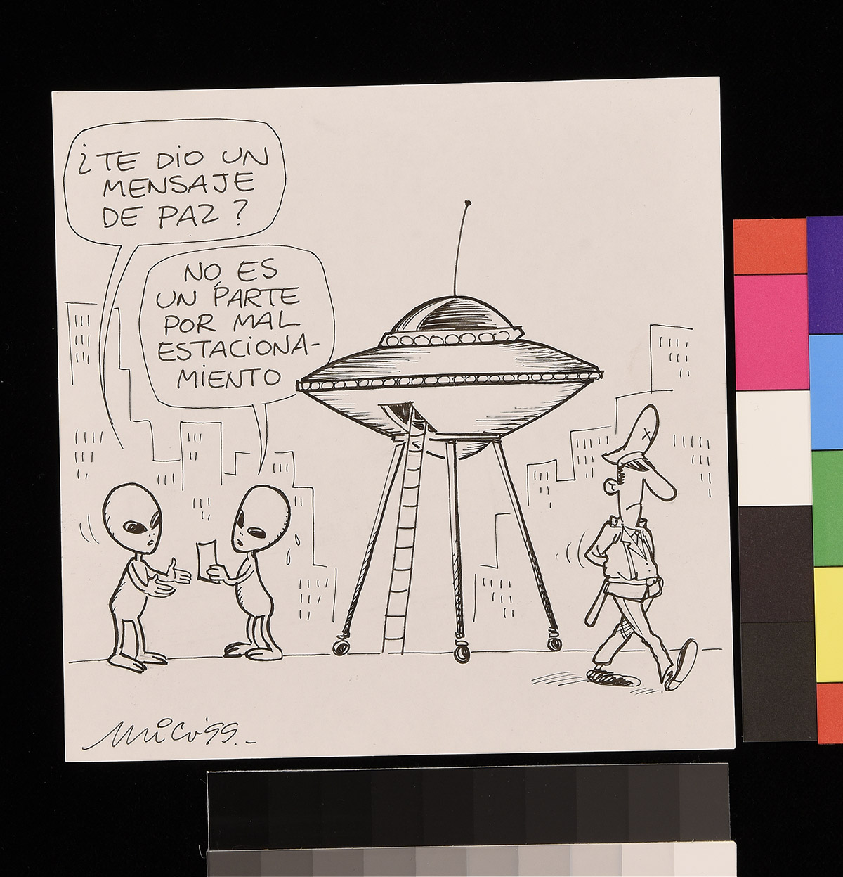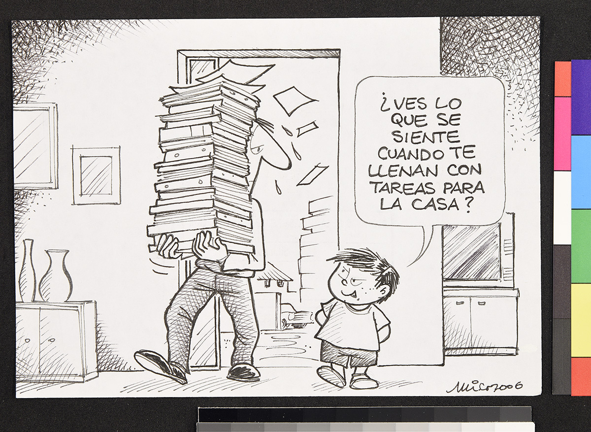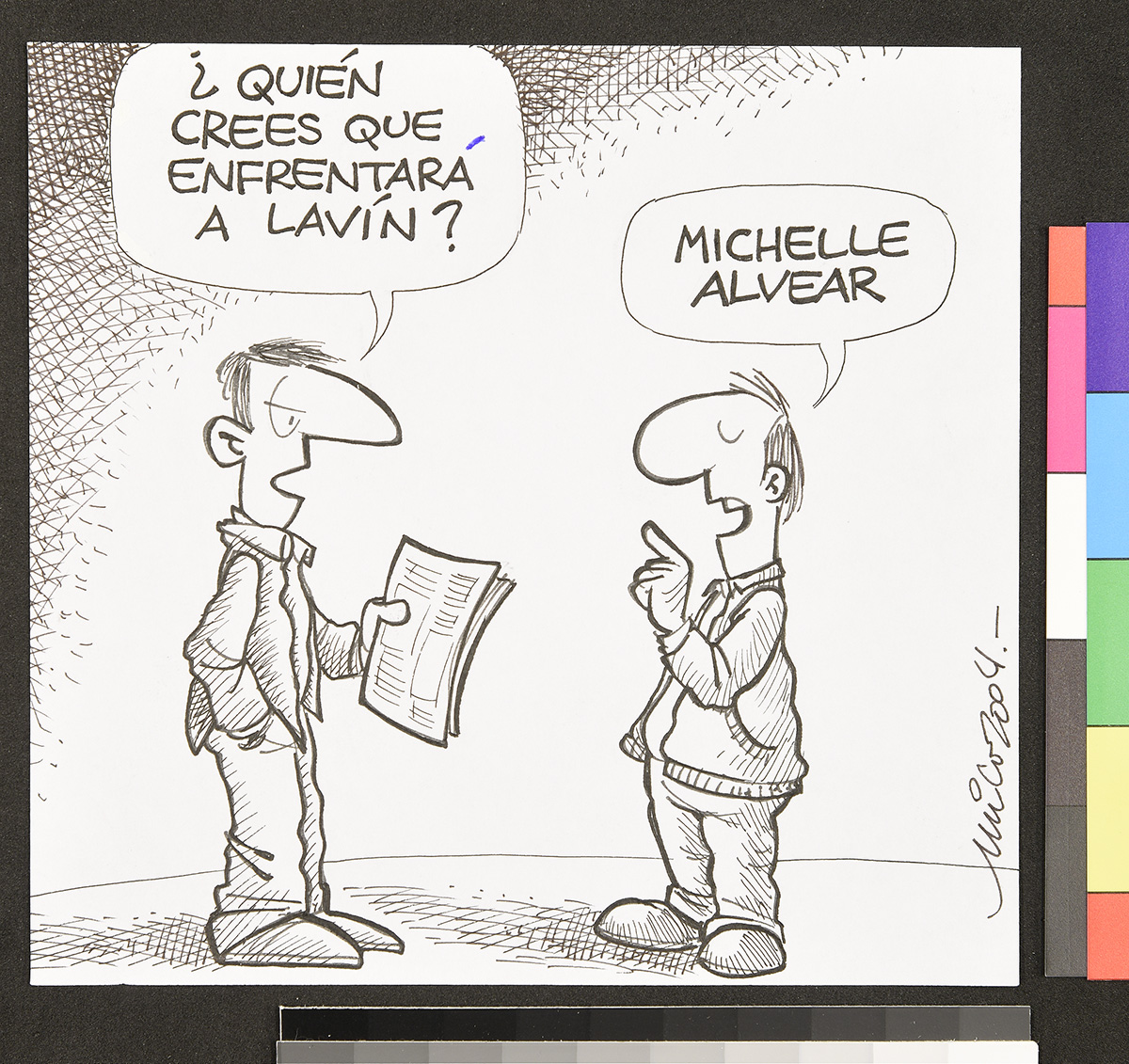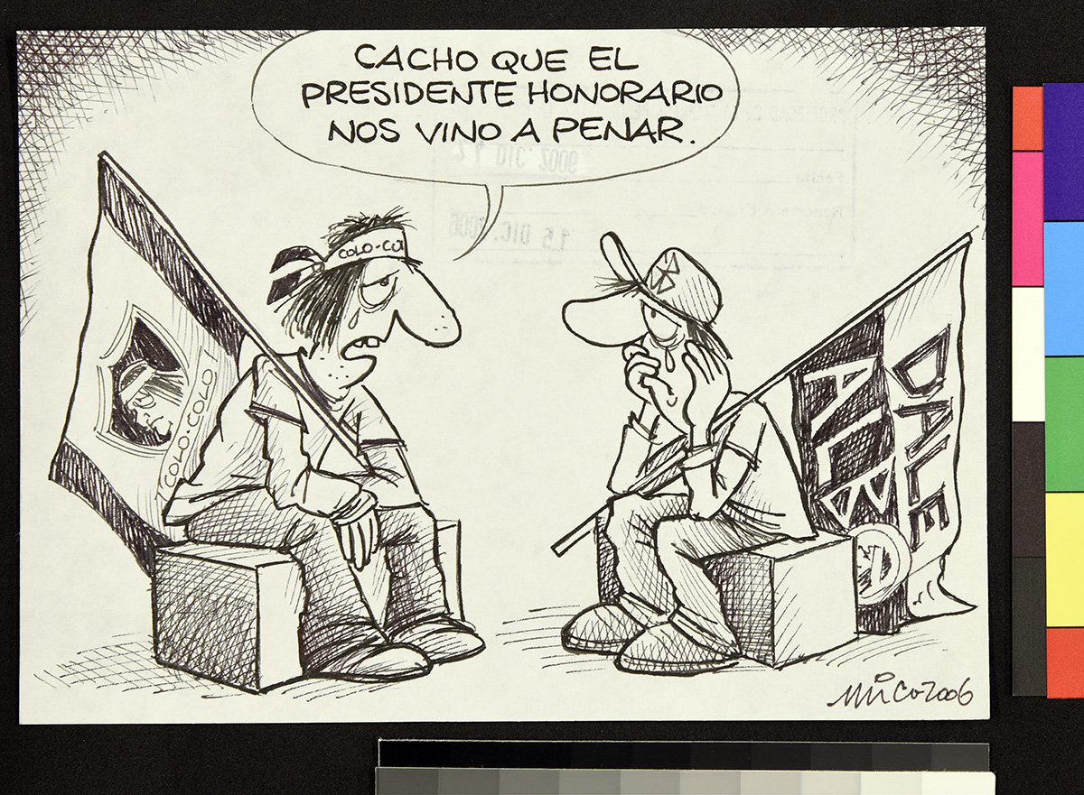 Dibujo de un hombre que se encuentra de pie, vestido con ropa deportiva y sosteniendo deshumano una raqueta pero sin cabeza. Otro hombre conversa con el vestido de la misma forma.