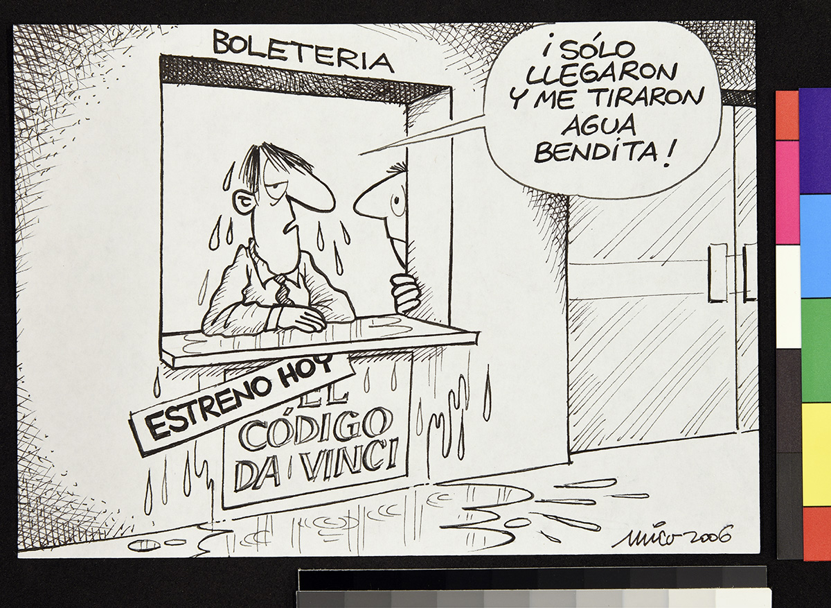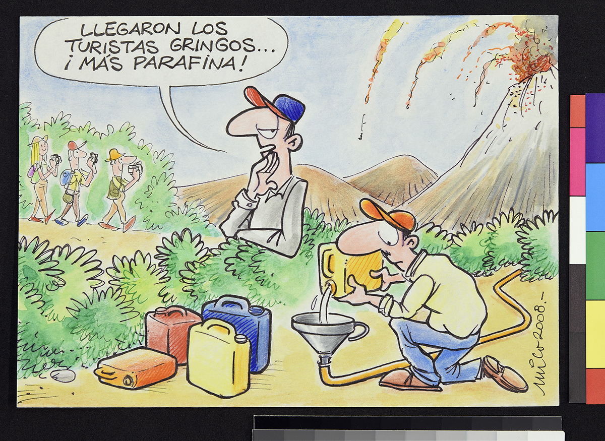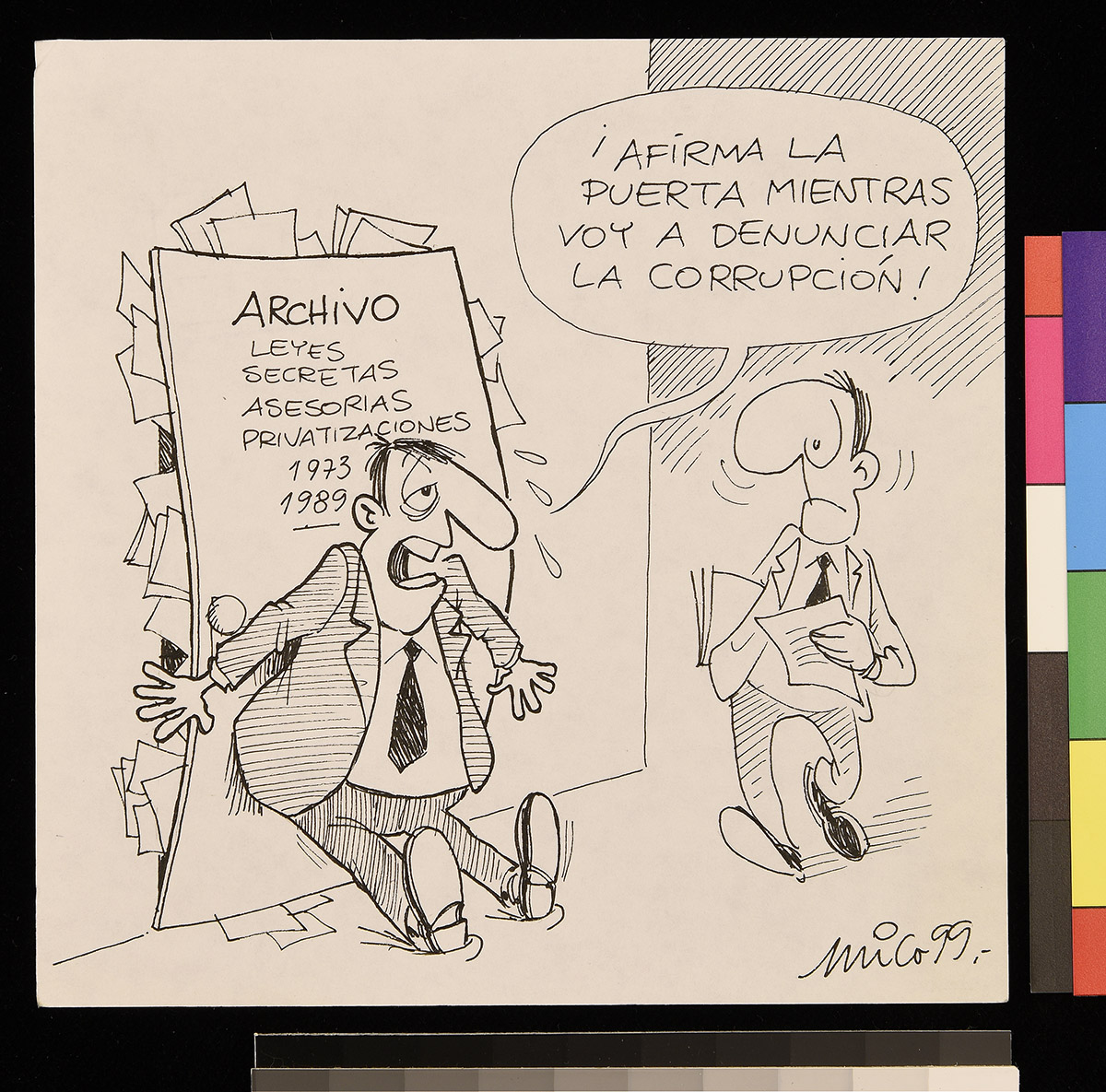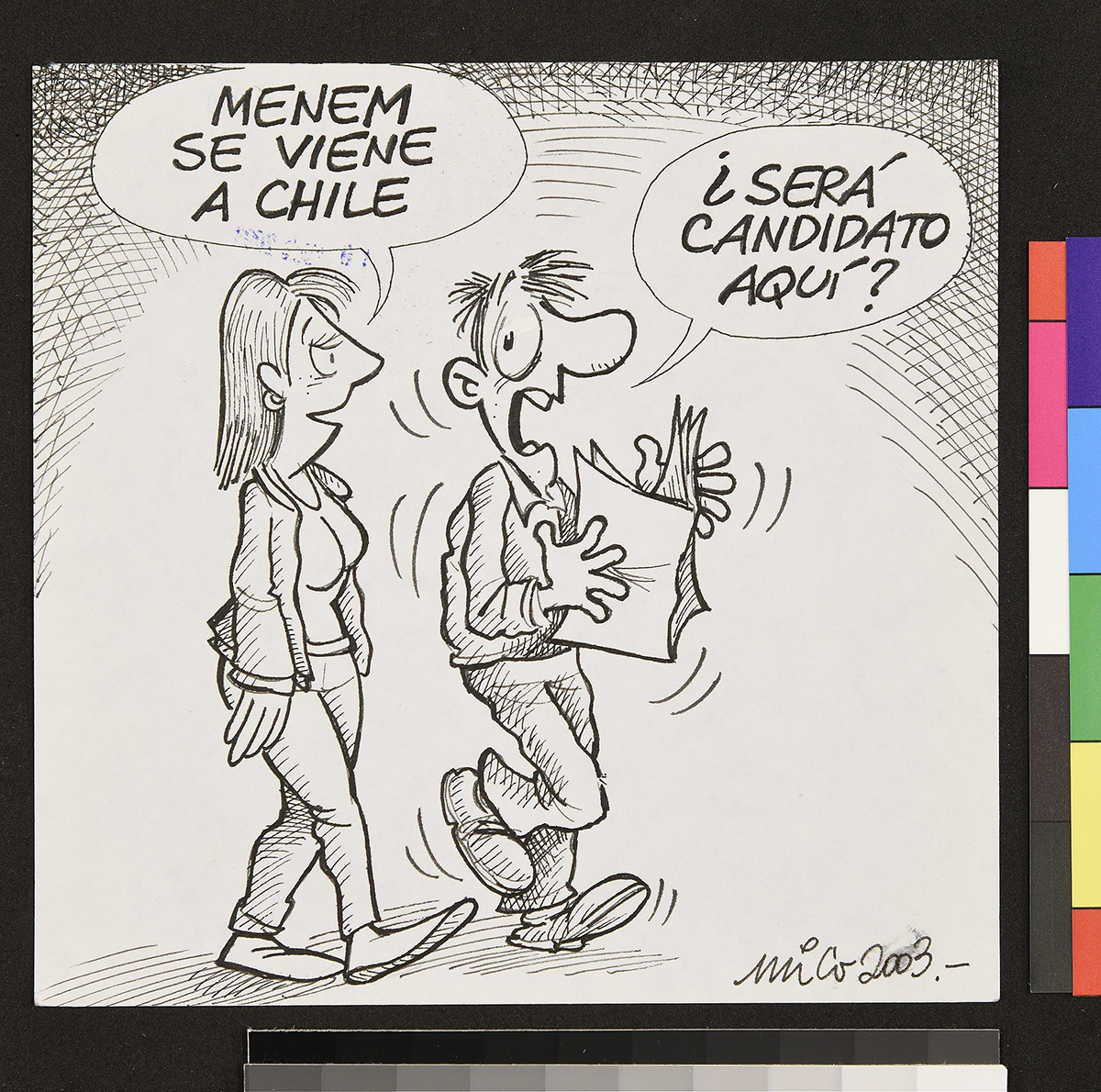 Dibujo de un hombre que se encuentra de pie, vestido con ropa deportiva y sosteniendo deshumano una raqueta pero sin cabeza. Otro hombre conversa con el vestido de la misma forma.