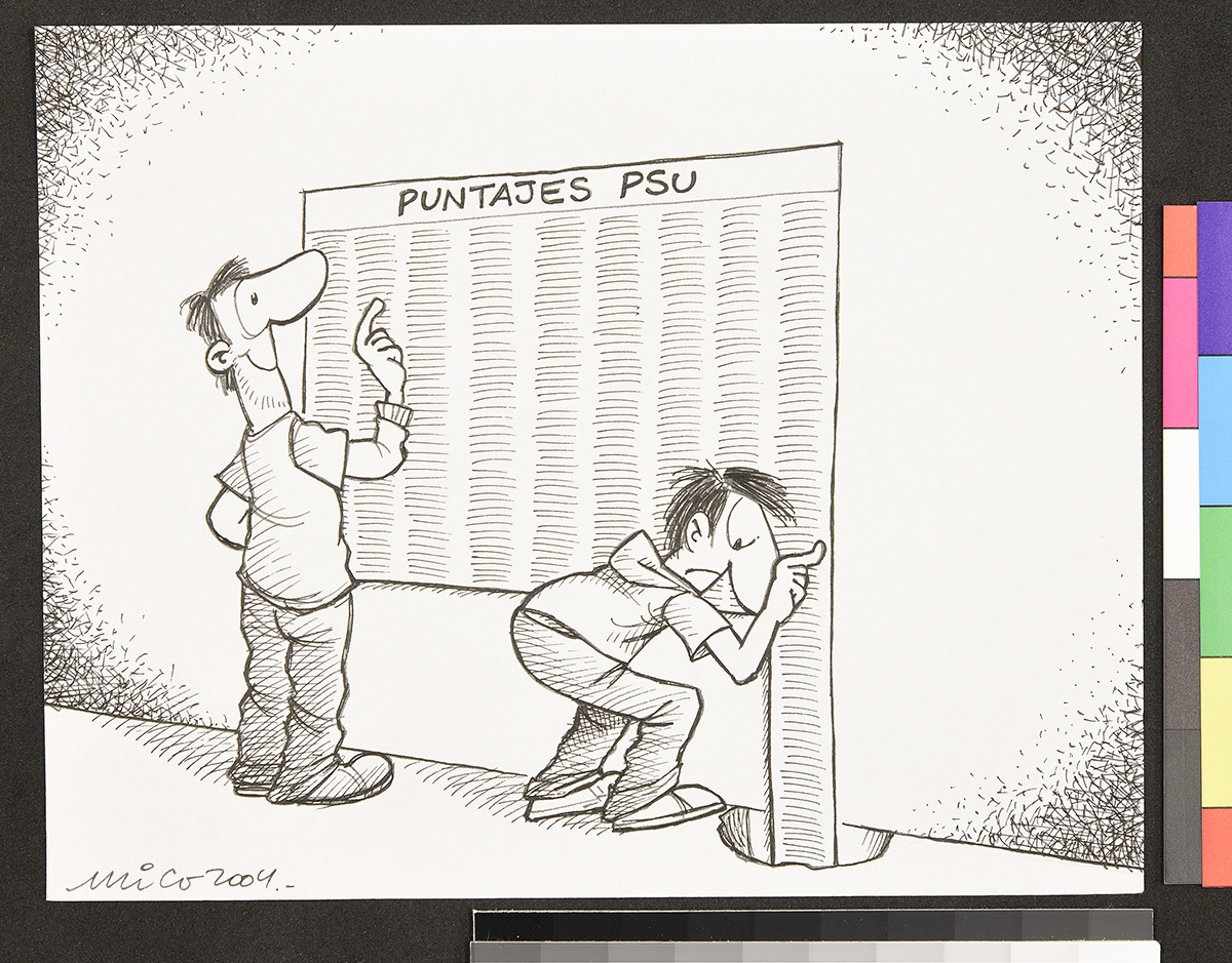 Dibujo de un guardia que arrastra por la ropa a una mujer por la calle y hablando a la vez por radio.