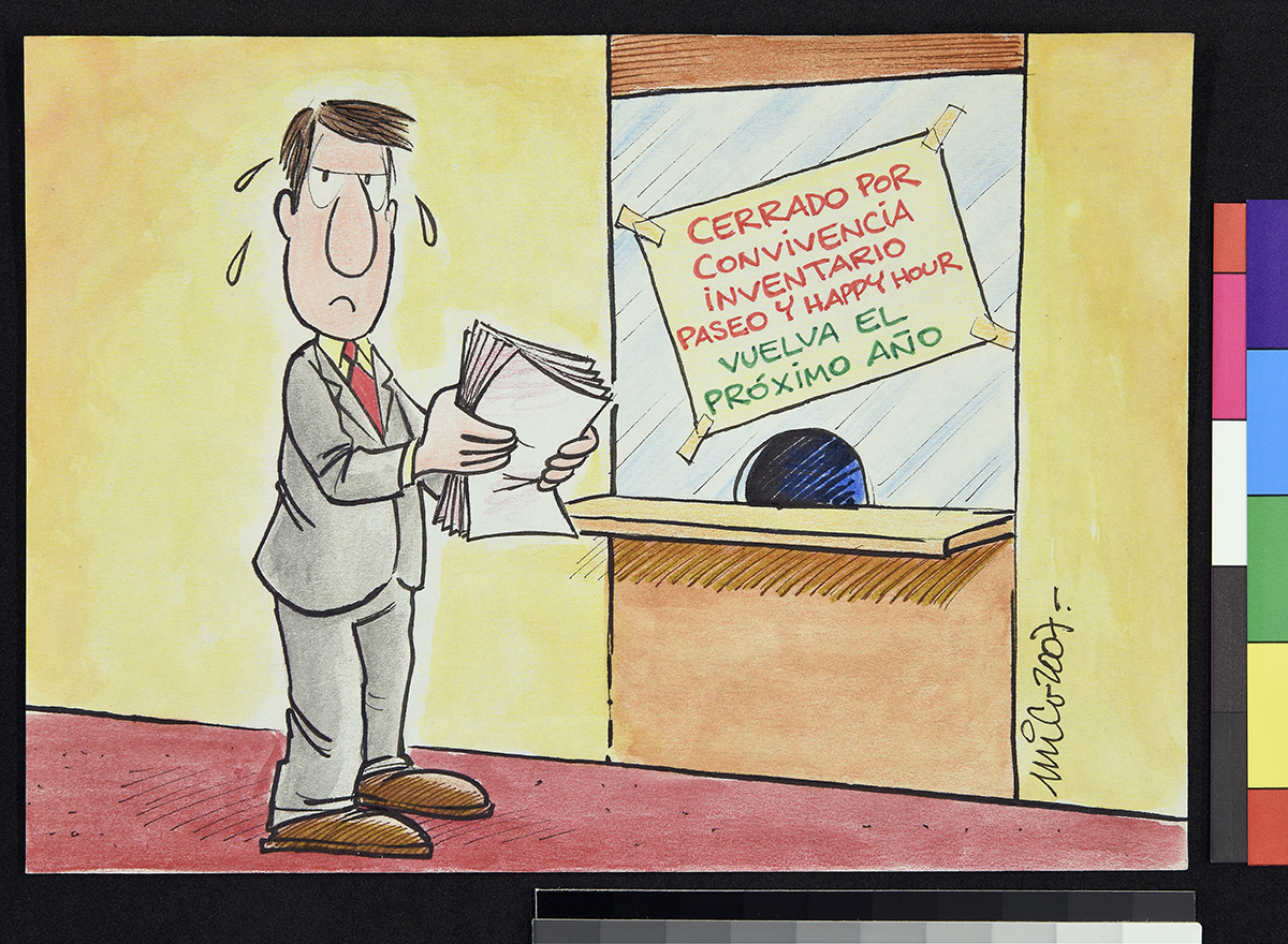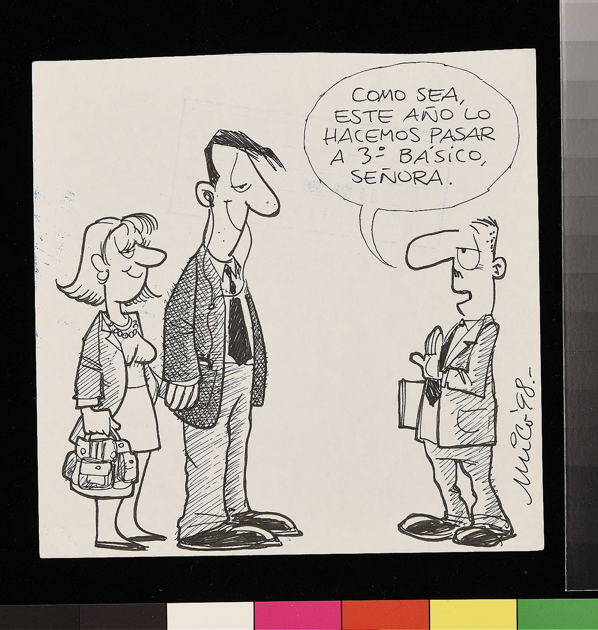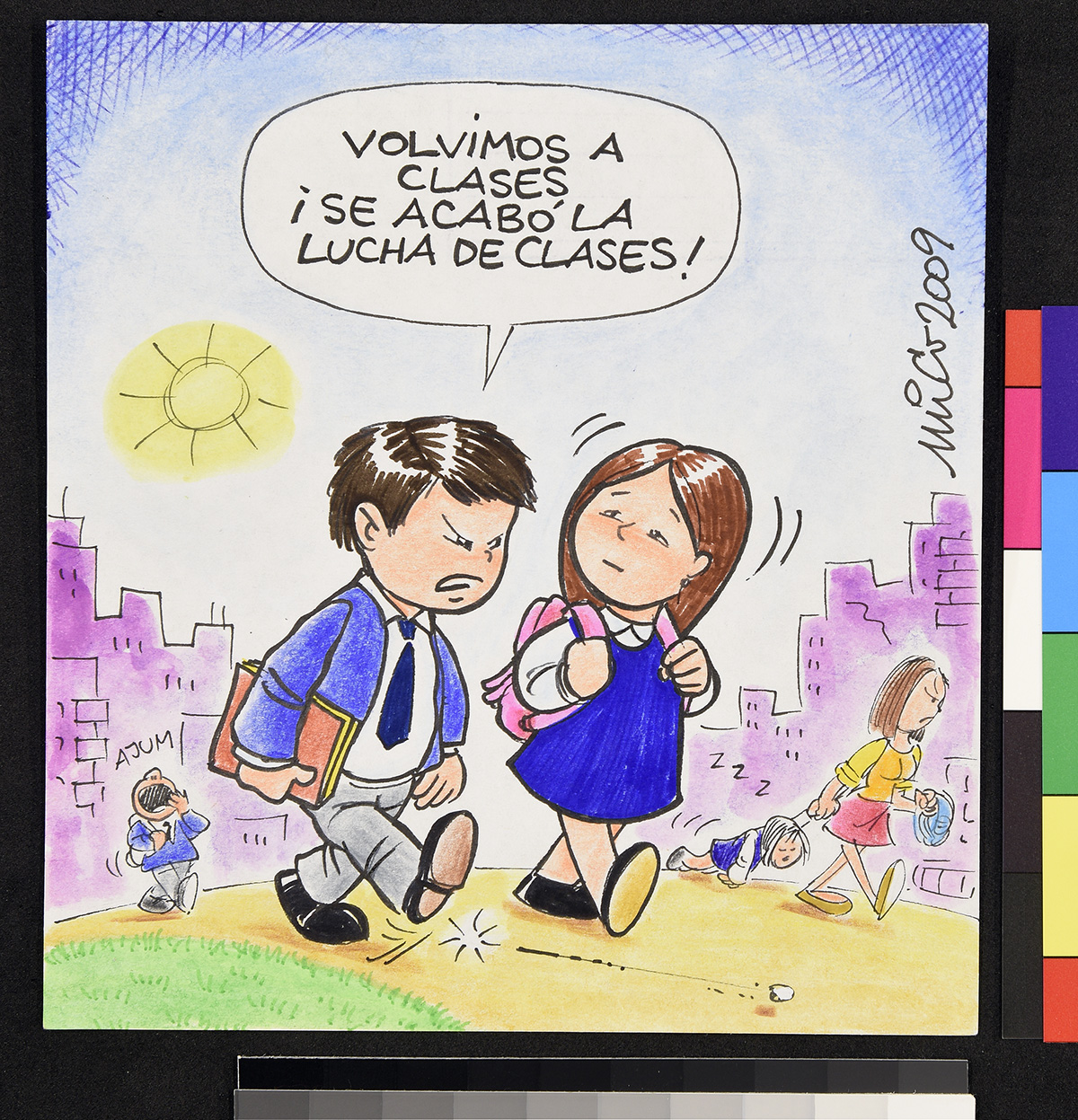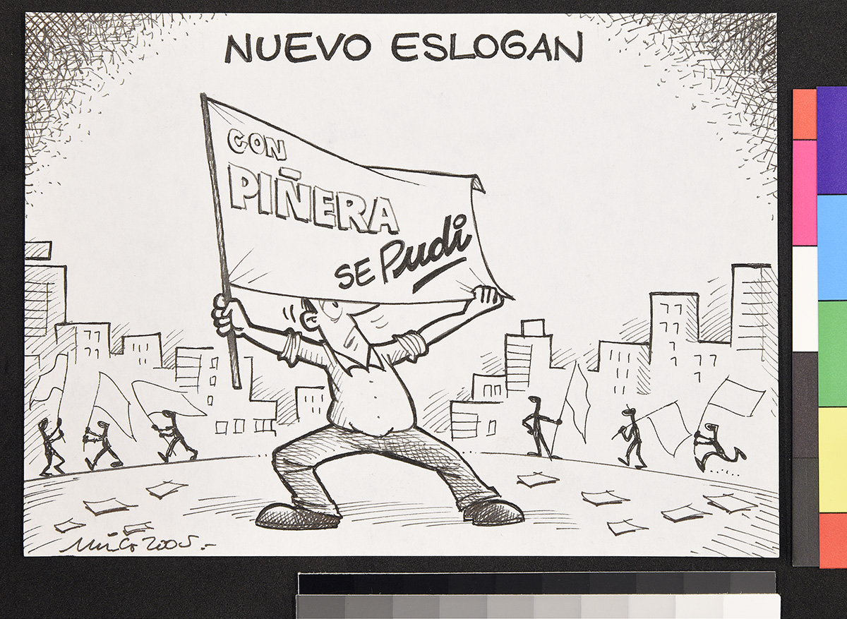 Dibujo de varias personas que están celebrando con banderas de Chile y calculadoras en sus manos. Todos se encuentran en un espacio urbano, junto a un monumento.