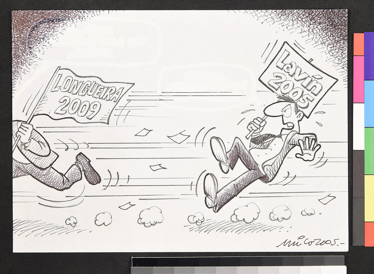 Dibujo de un hombre que corre con una bandera que dice “Longueira 2009”, que sobrepasa a otro que pierde el equilibrio y que lleva otra bandera que dice “Lavín 2005”.