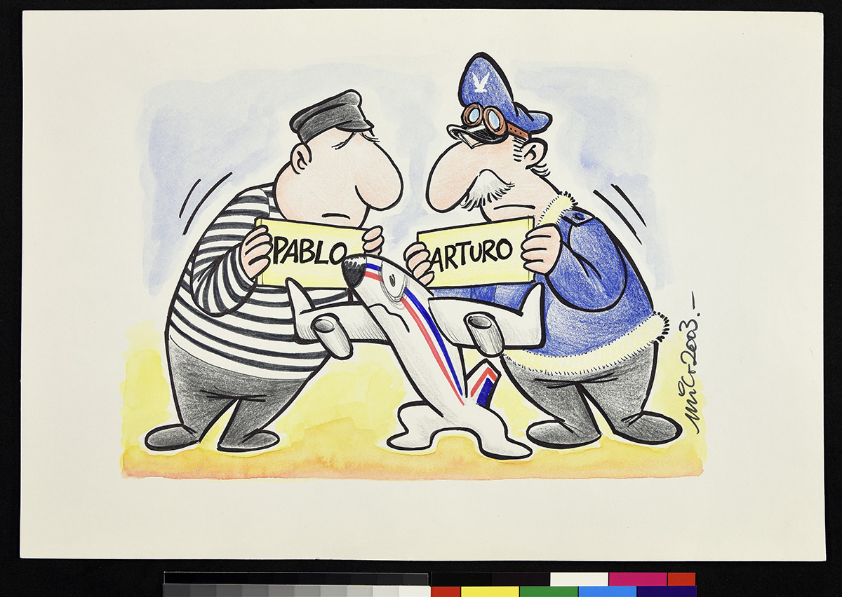 Dibujo de dos hombres se encuentran dialogando dentro de una cancha de fútbol.