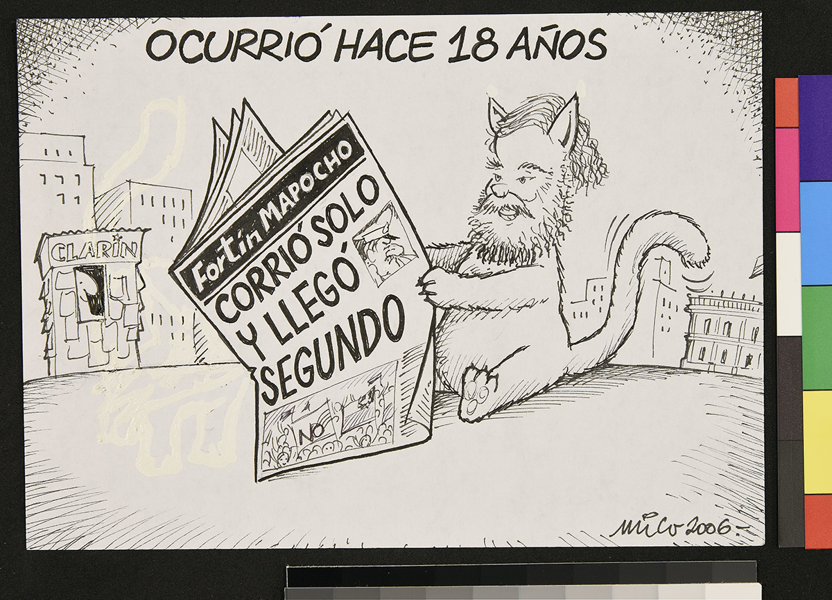 Dibujo de un hombre de pie que habla con otro hombre que está sentado frente a una mesa, con mantel y un lienzo que dice “Demanda colectiva Firme aquí”.