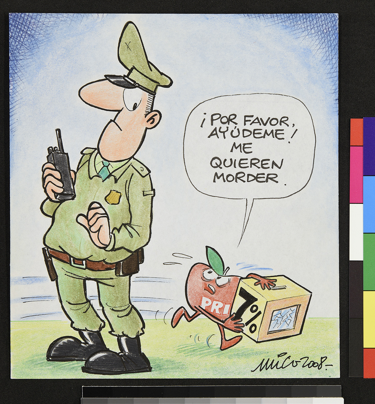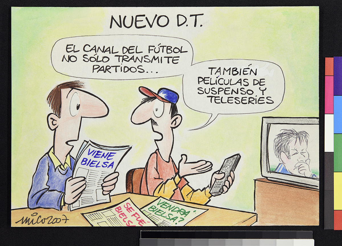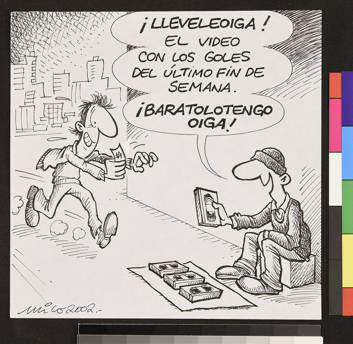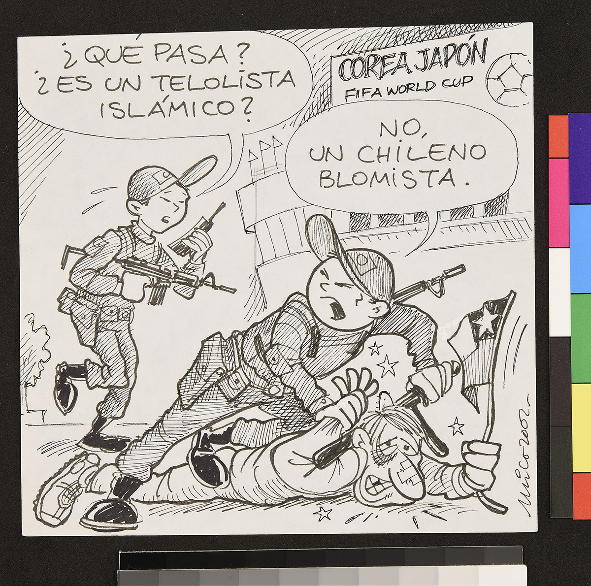 Dibujo de un policia japones que tiene en el suelo a un hincha de la seleccion chilena del fútbol. Otro policía se acerca corriendo con una radio en la mano.