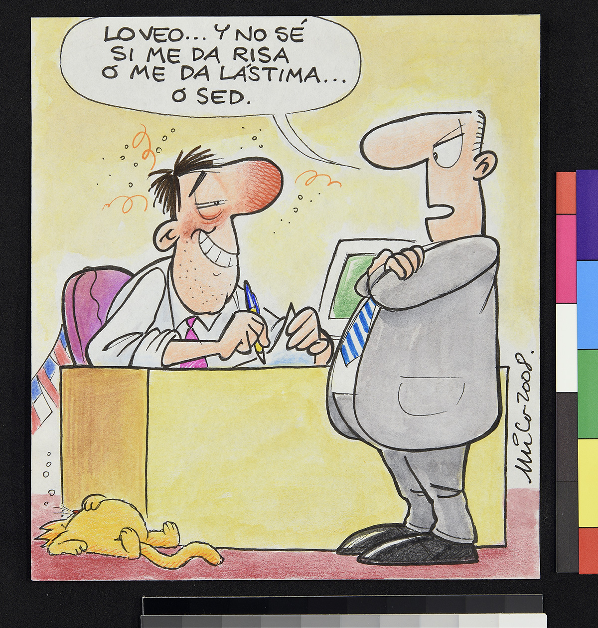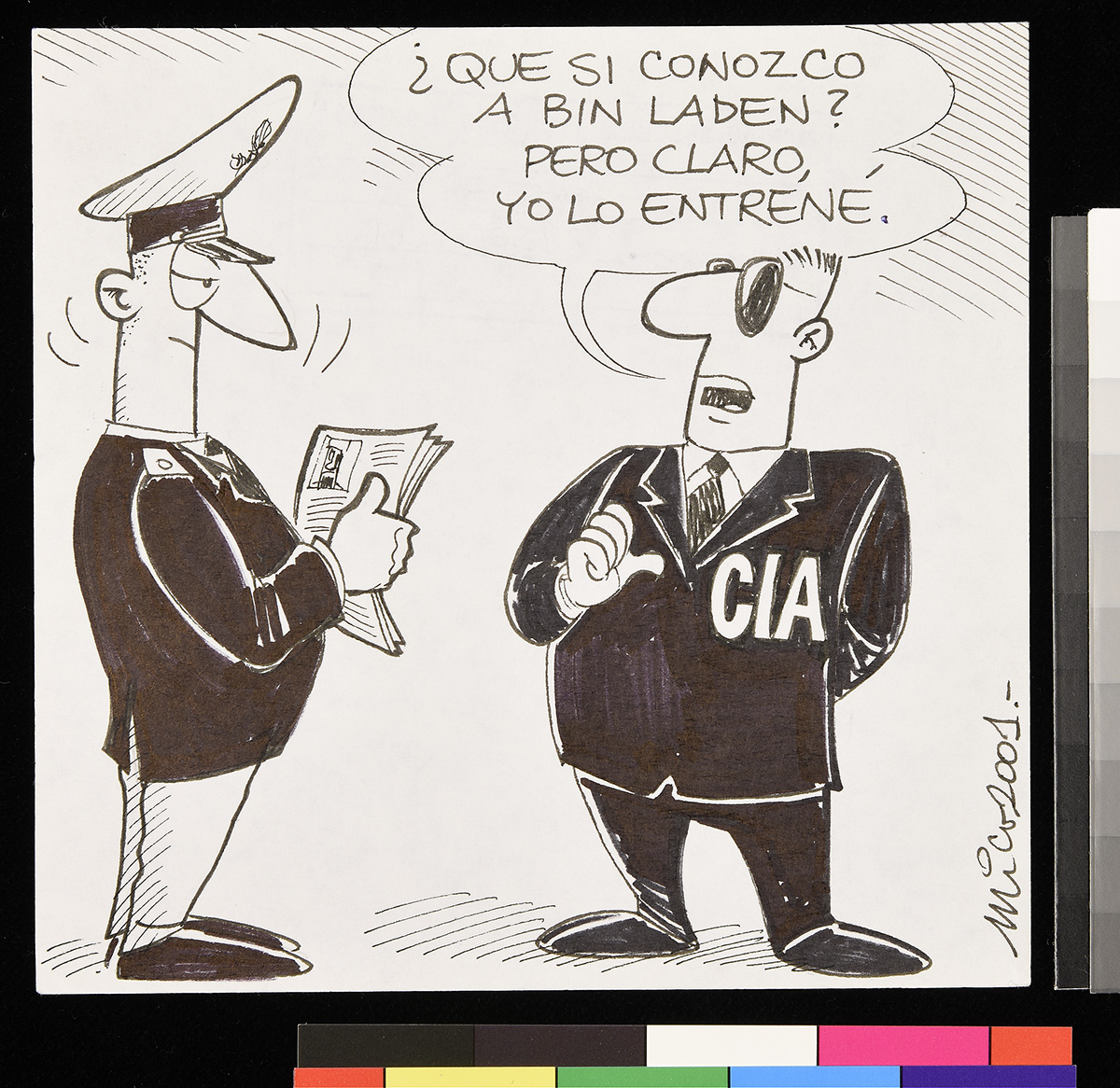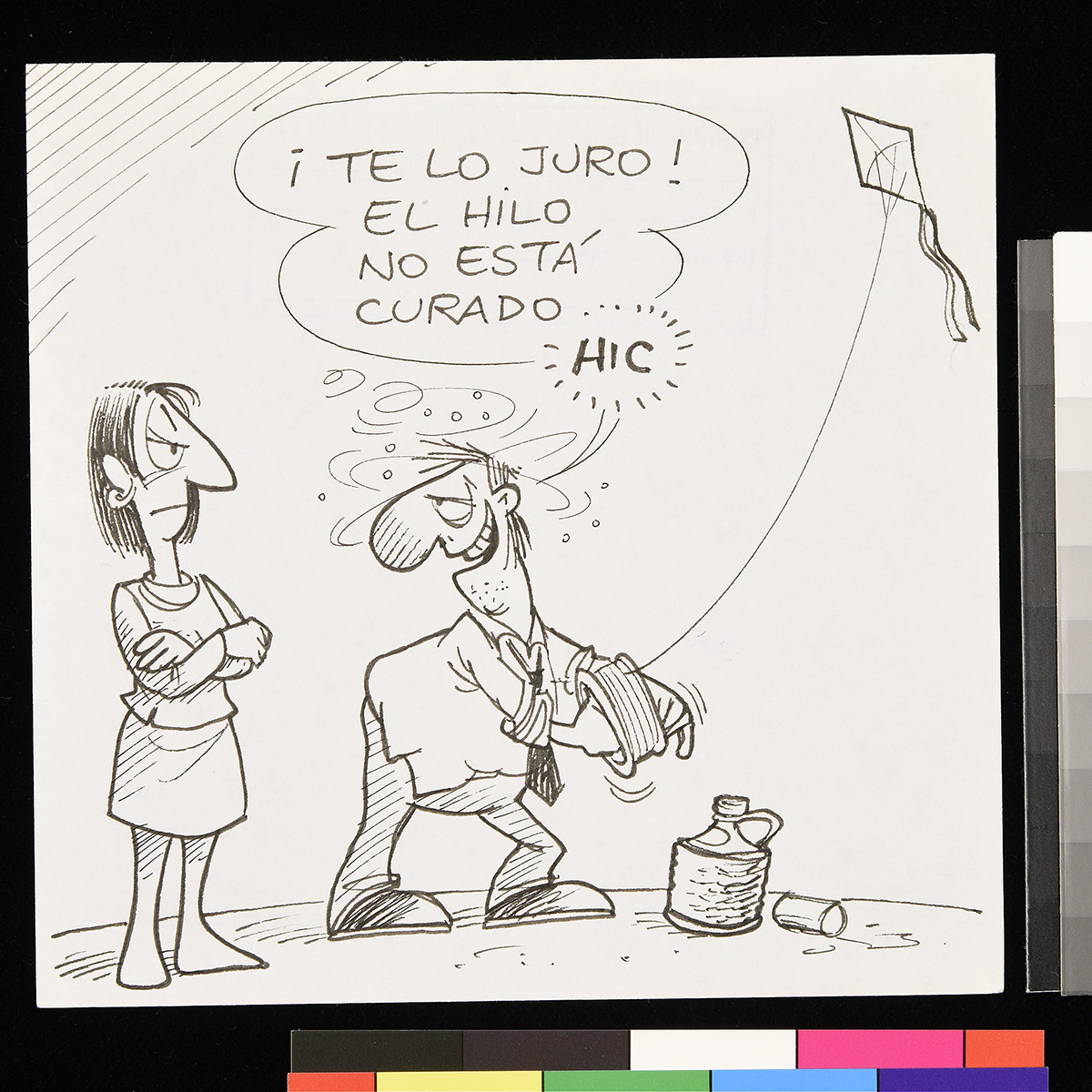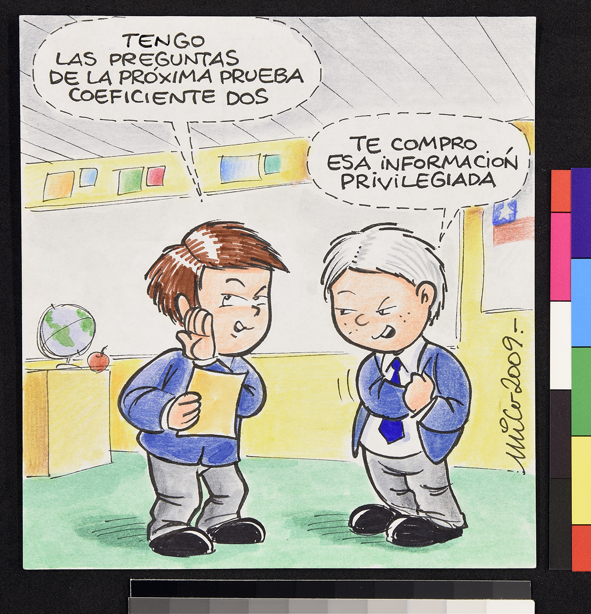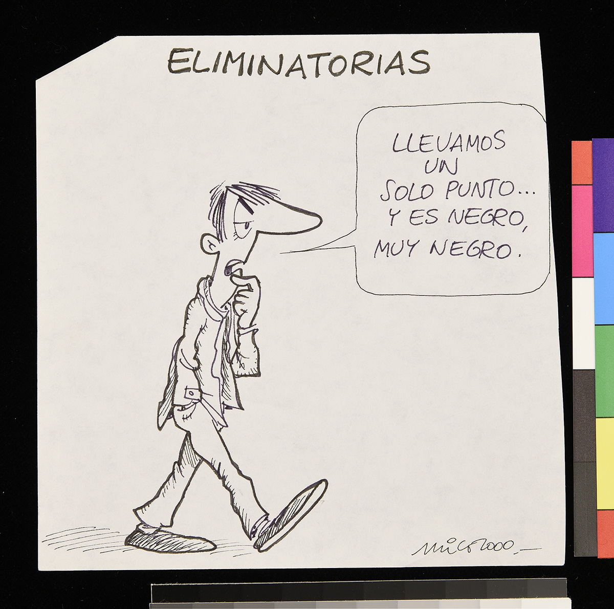 Dibujo de un policia japones que tiene en el suelo a un hincha de la seleccion chilena del fútbol. Otro policía se acerca corriendo con una radio en la mano.