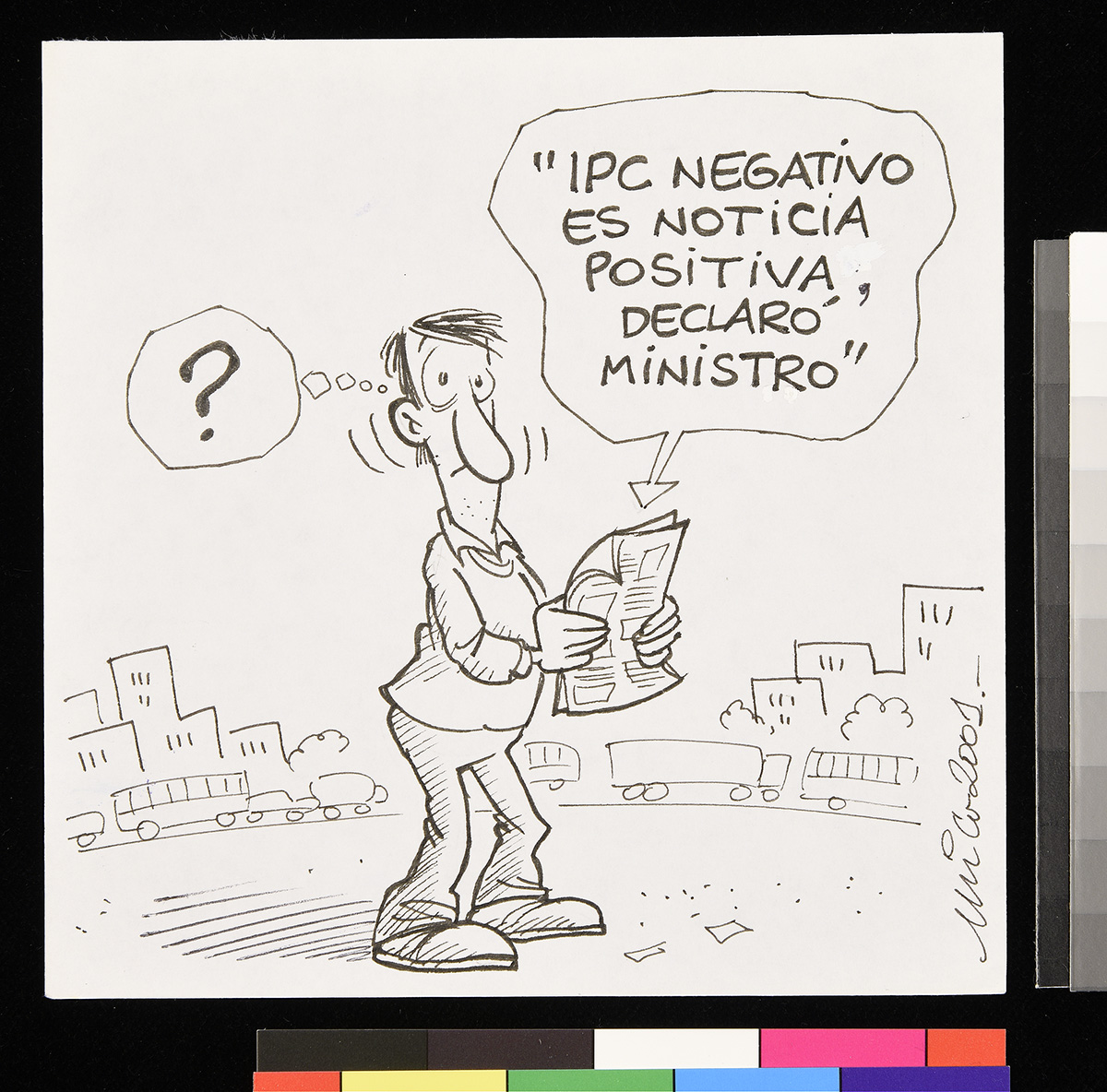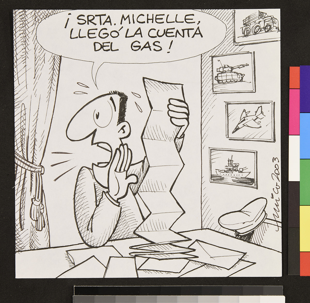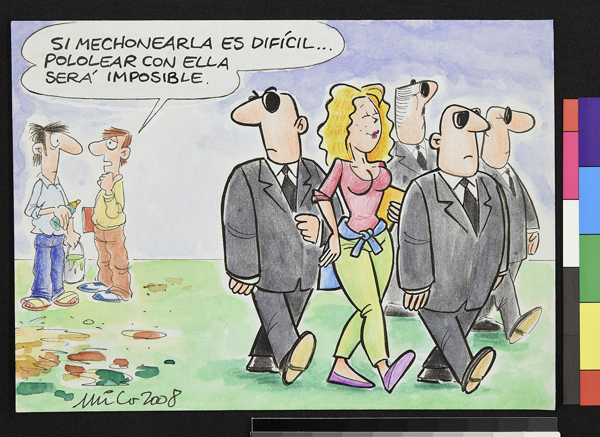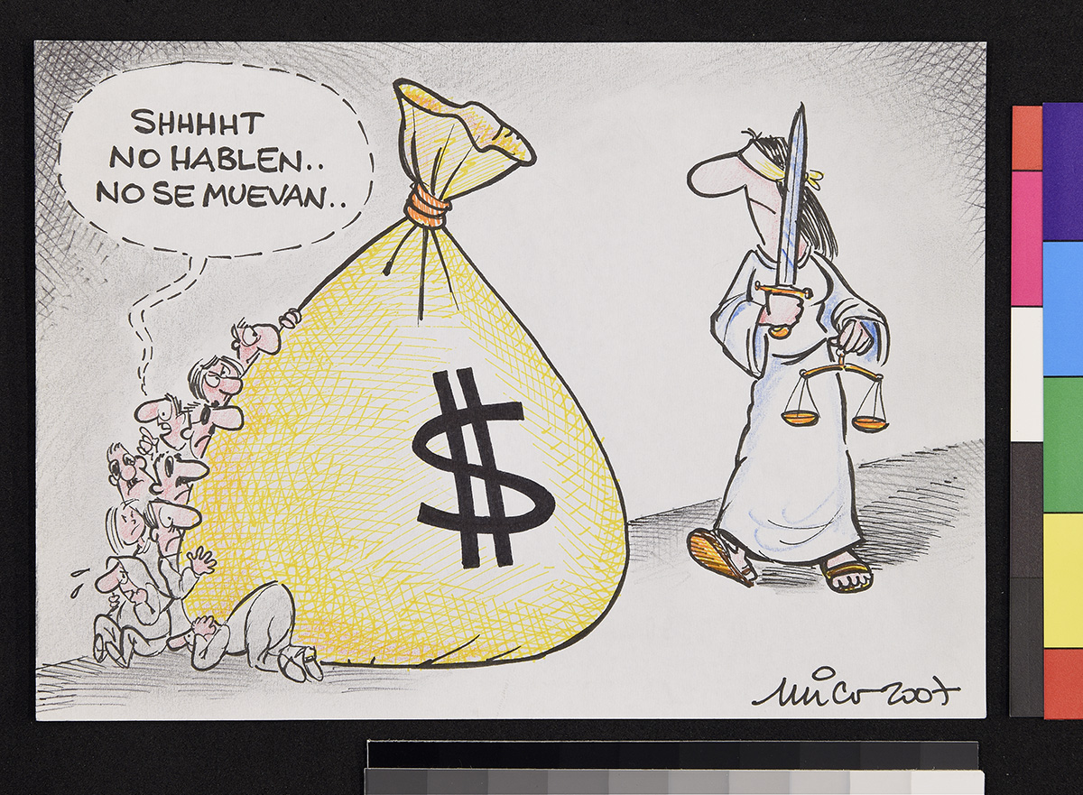 Dibujo de un policia japones que tiene en el suelo a un hincha de la seleccion chilena del fútbol. Otro policía se acerca corriendo con una radio en la mano.