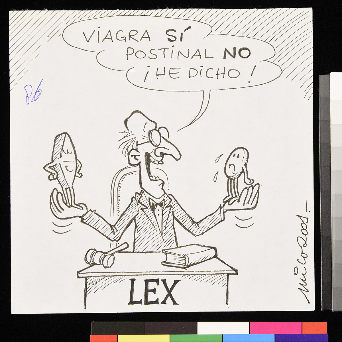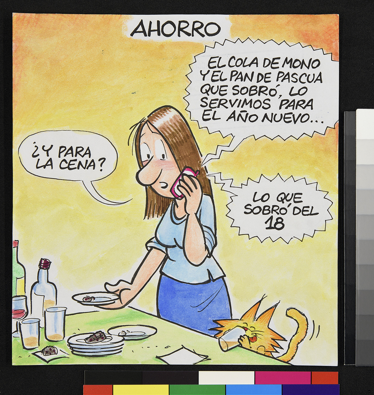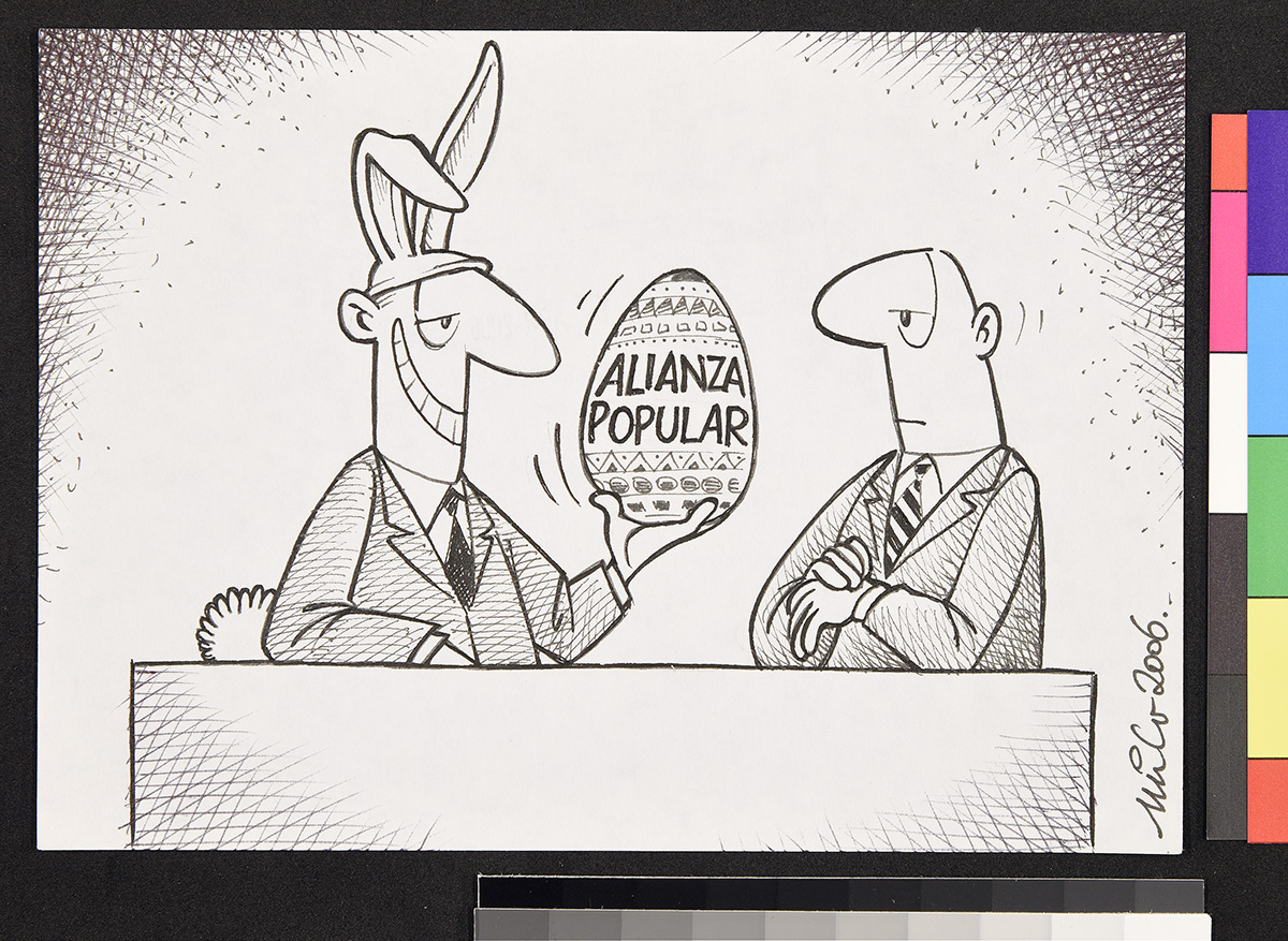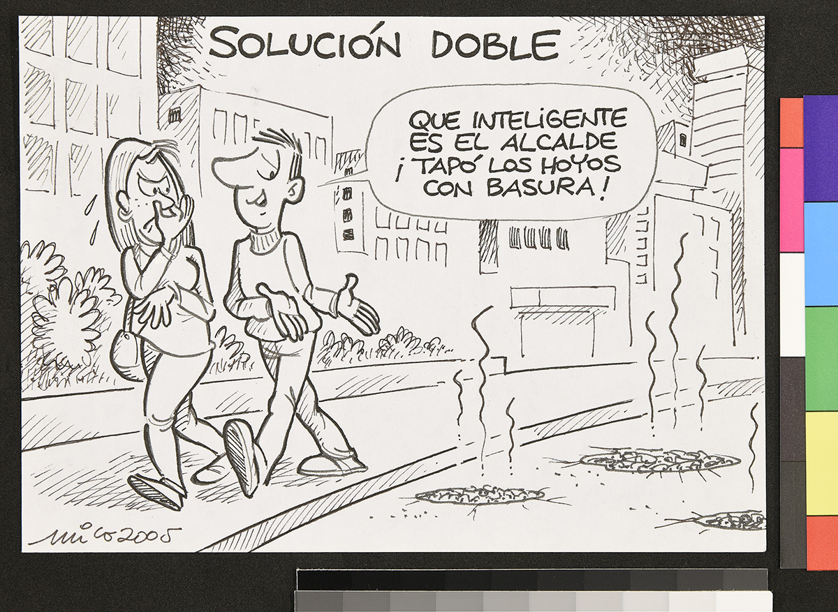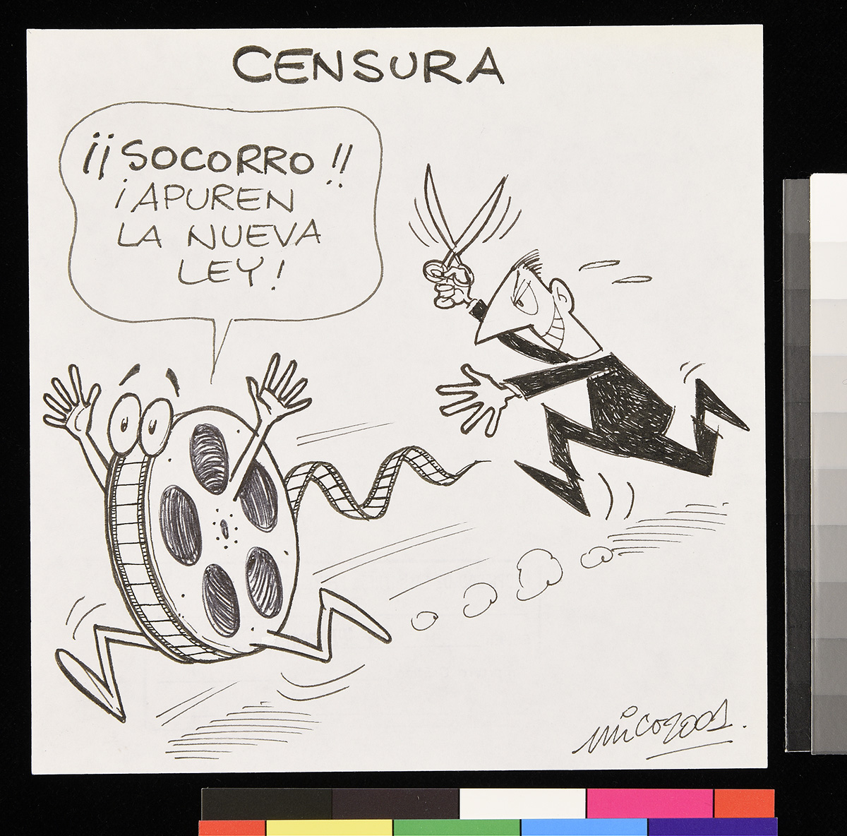 Dibujo de un policia japones que tiene en el suelo a un hincha de la seleccion chilena del fútbol. Otro policía se acerca corriendo con una radio en la mano.