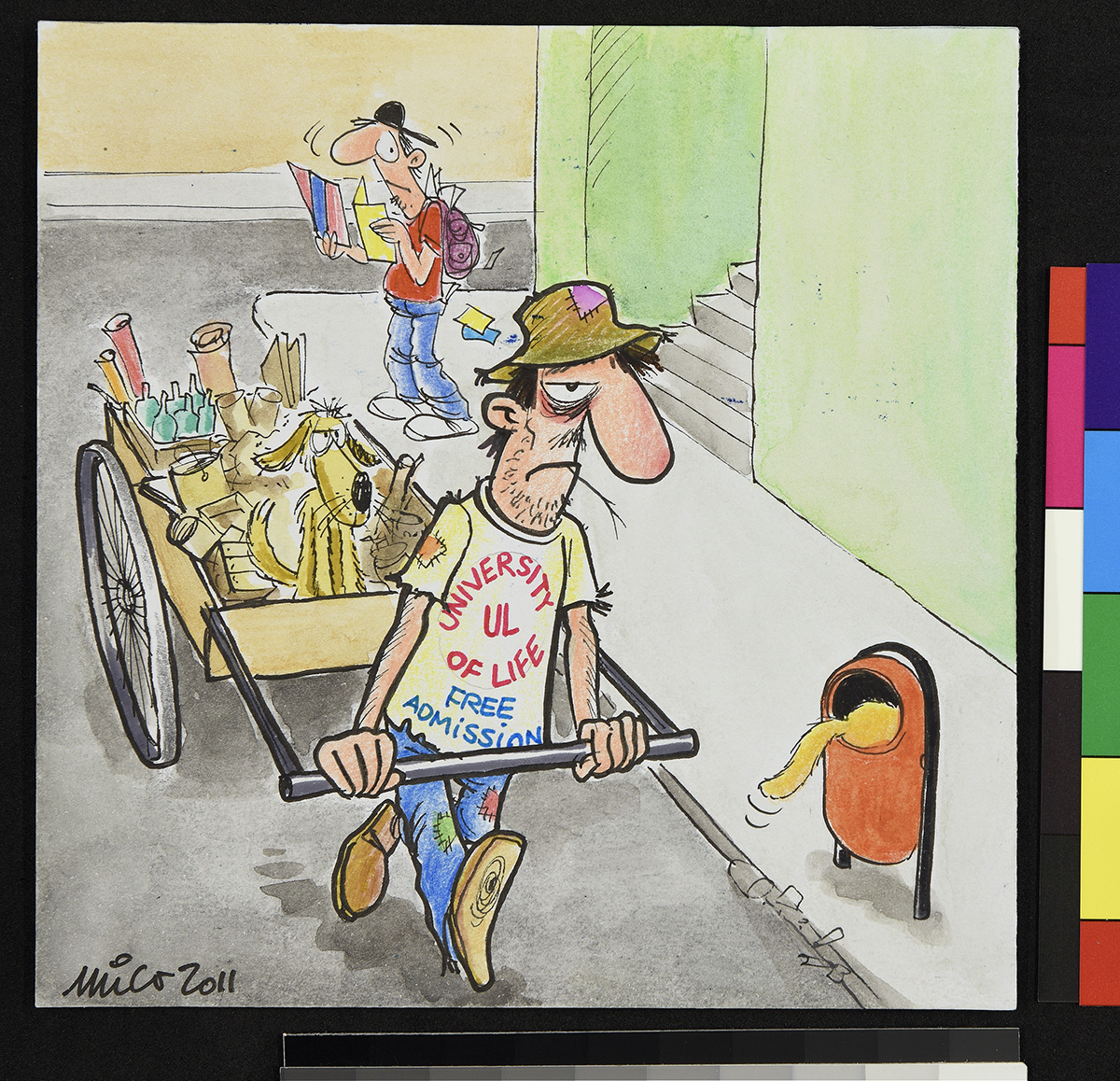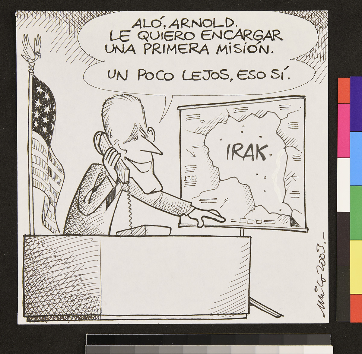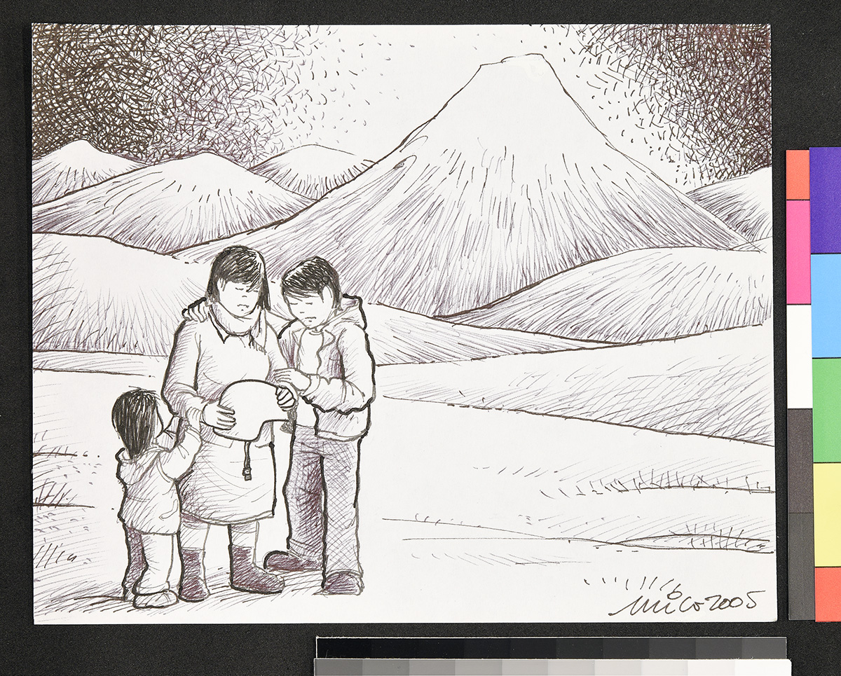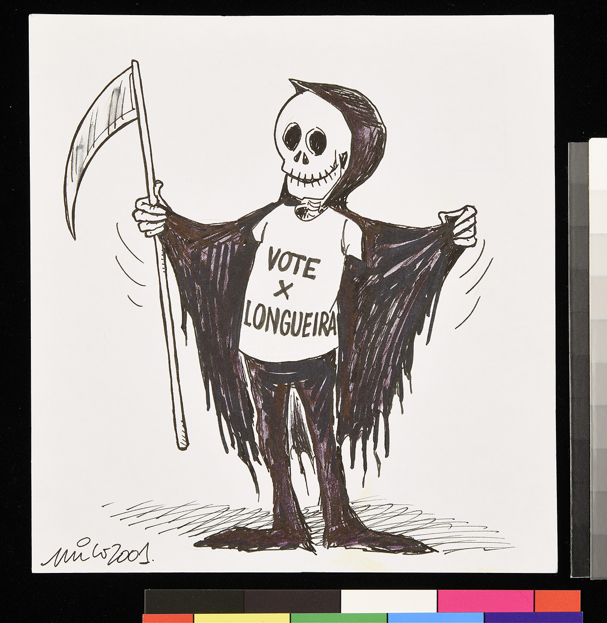 Dibujo de un policia japones que tiene en el suelo a un hincha de la seleccion chilena del fútbol. Otro policía se acerca corriendo con una radio en la mano.