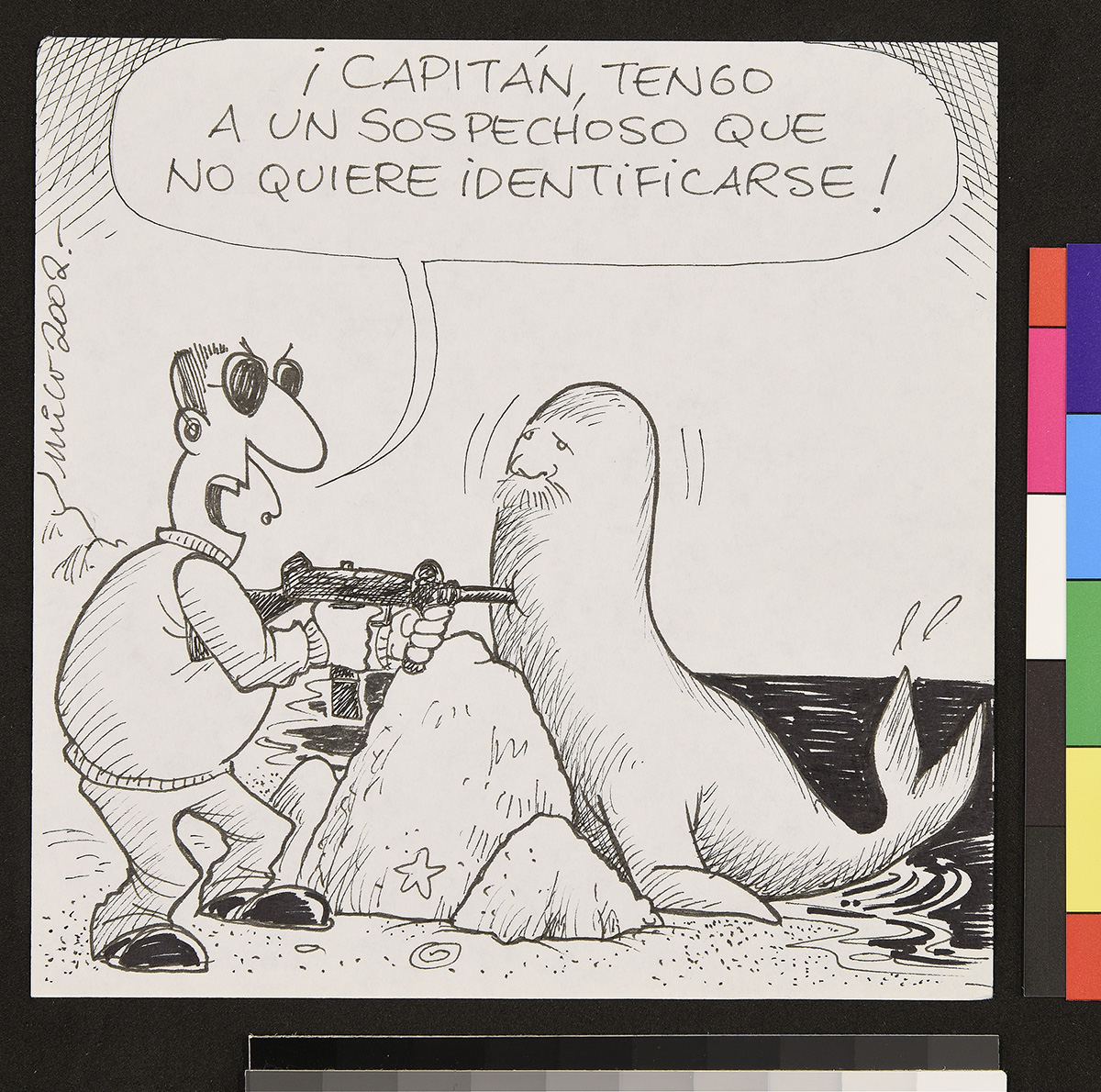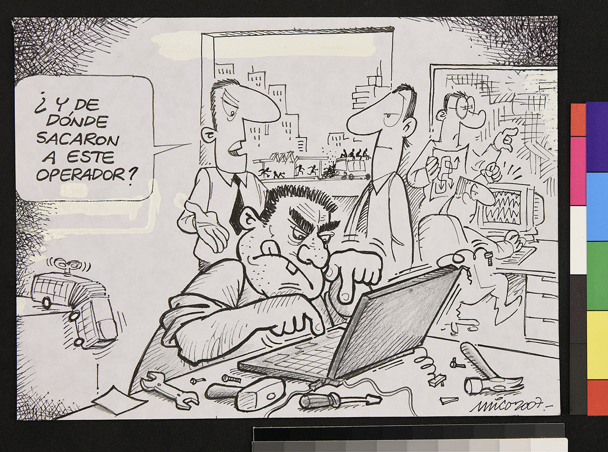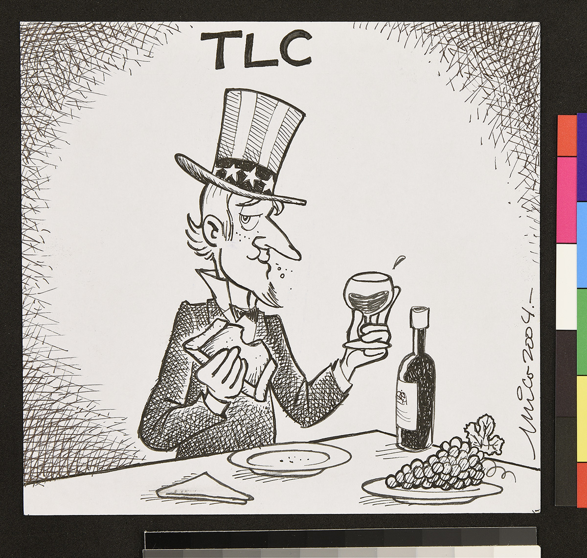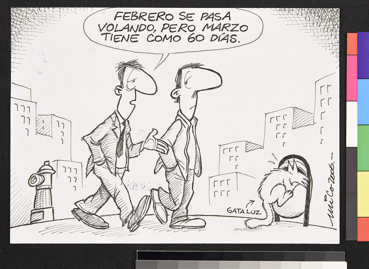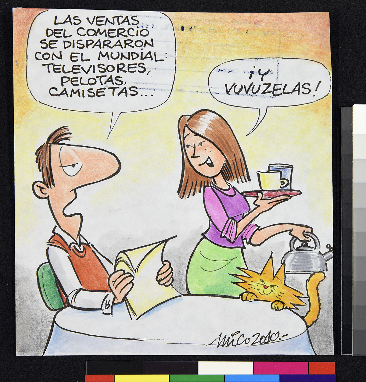 Dibujo de un hombre que mira un periódico que sostiene en sus manos mientras está sentado frente a una mesa en un restaurante. Junto a él hay una mujer que sostiene un vaso en su mano izquierda.