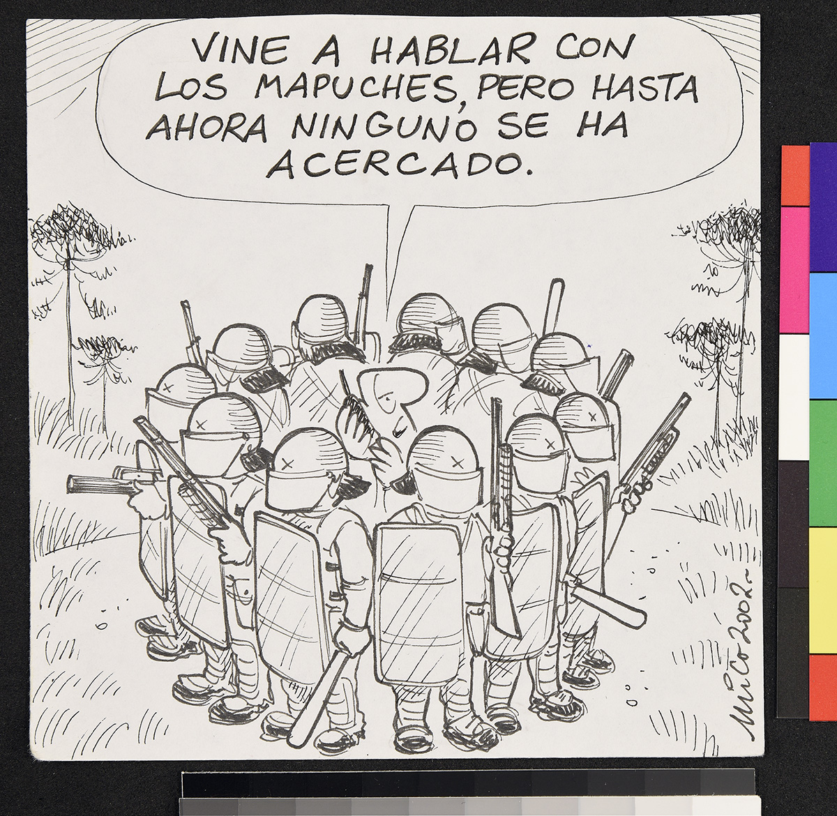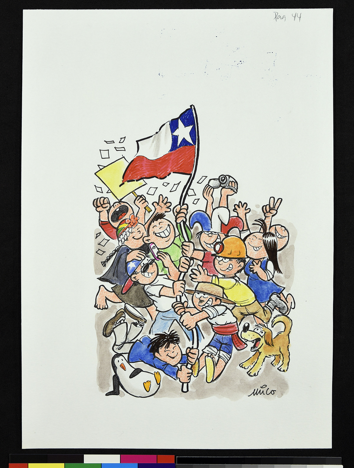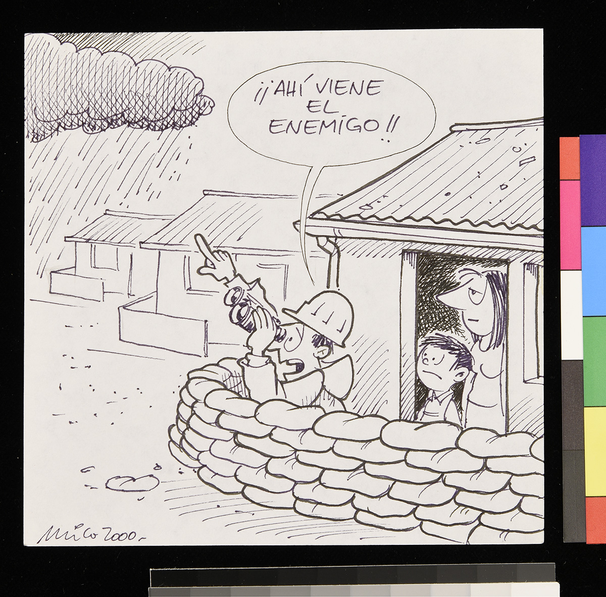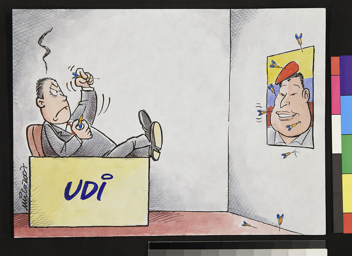 Dibujo de un hombre que mira un periódico que sostiene en sus manos mientras está sentado frente a una mesa en un restaurante. Junto a él hay una mujer que sostiene un vaso en su mano izquierda.