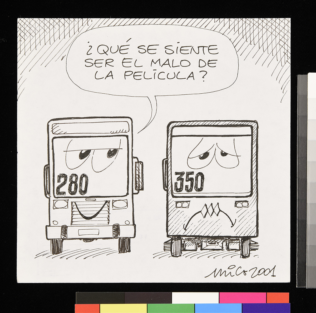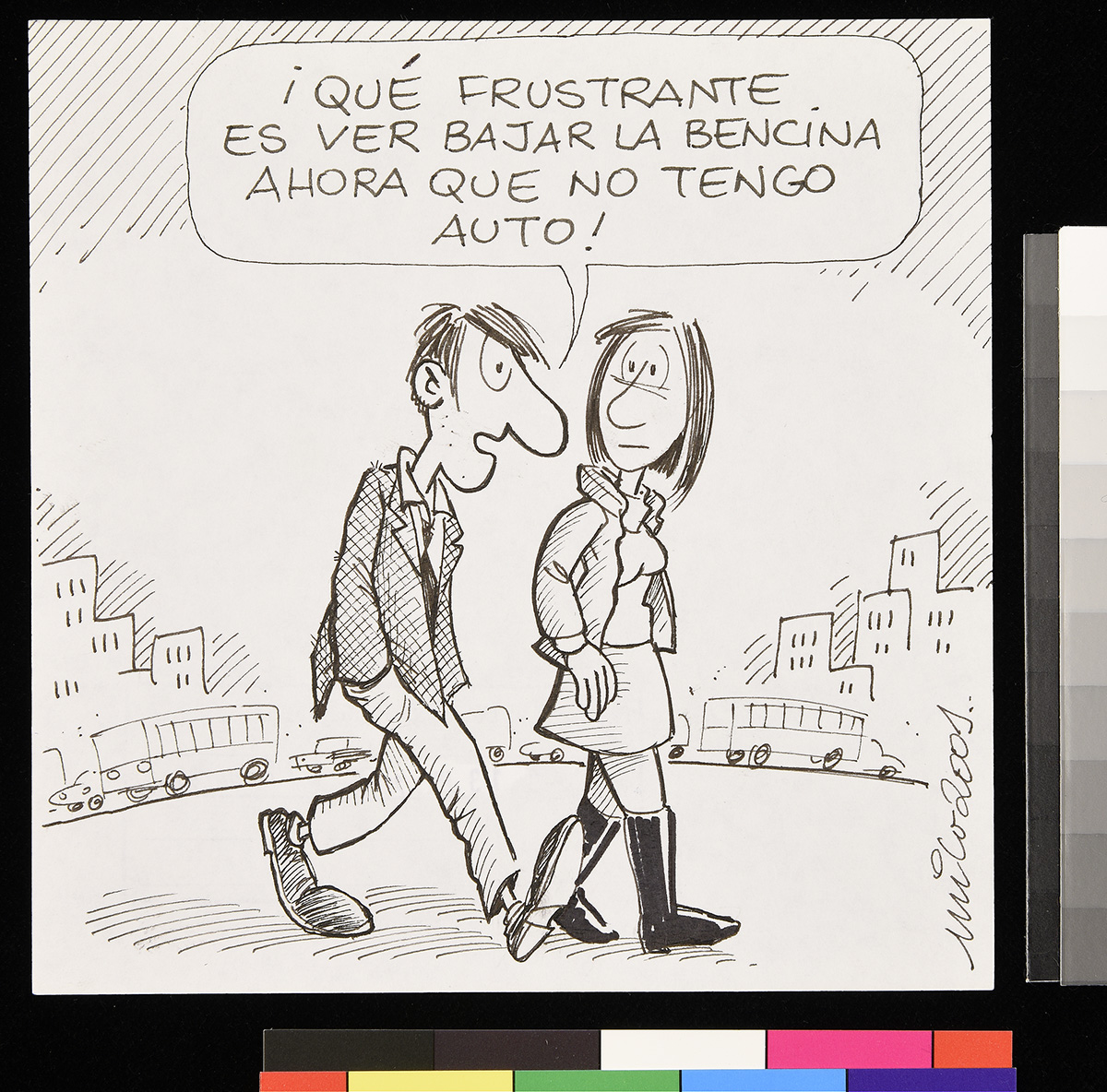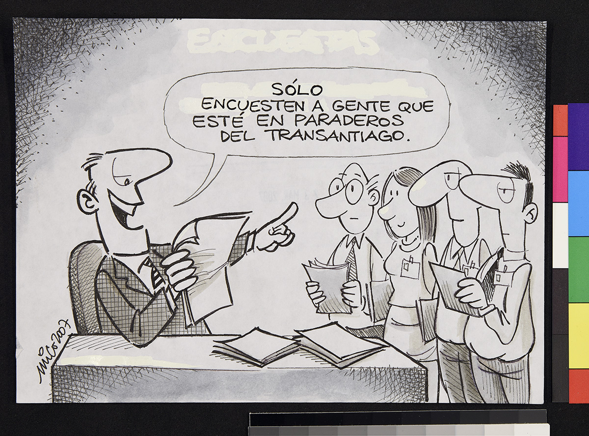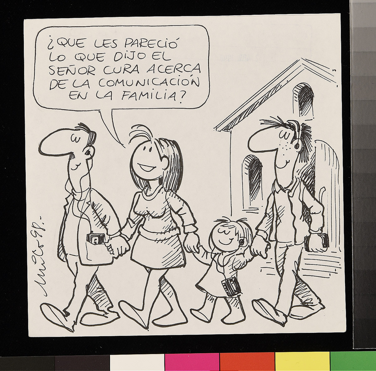 Dibujo de una familia, donde todos van de la mano, pero tres de ellos ocupan auriculares con reproductores de música.