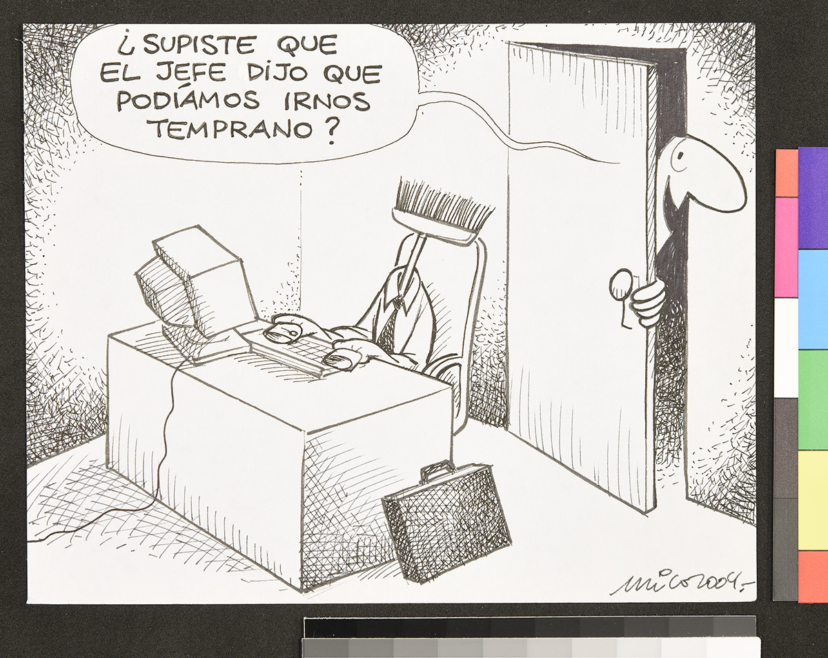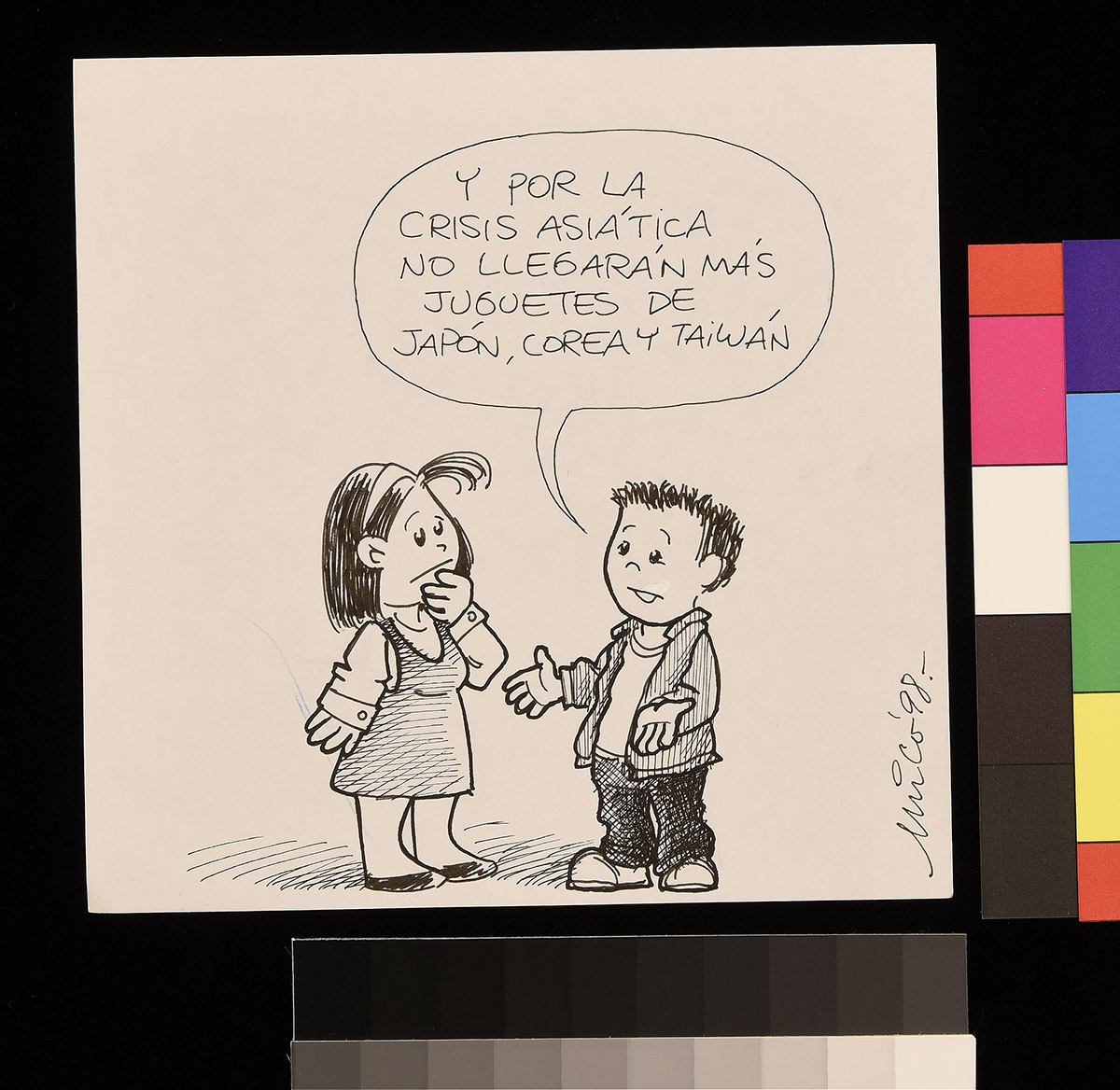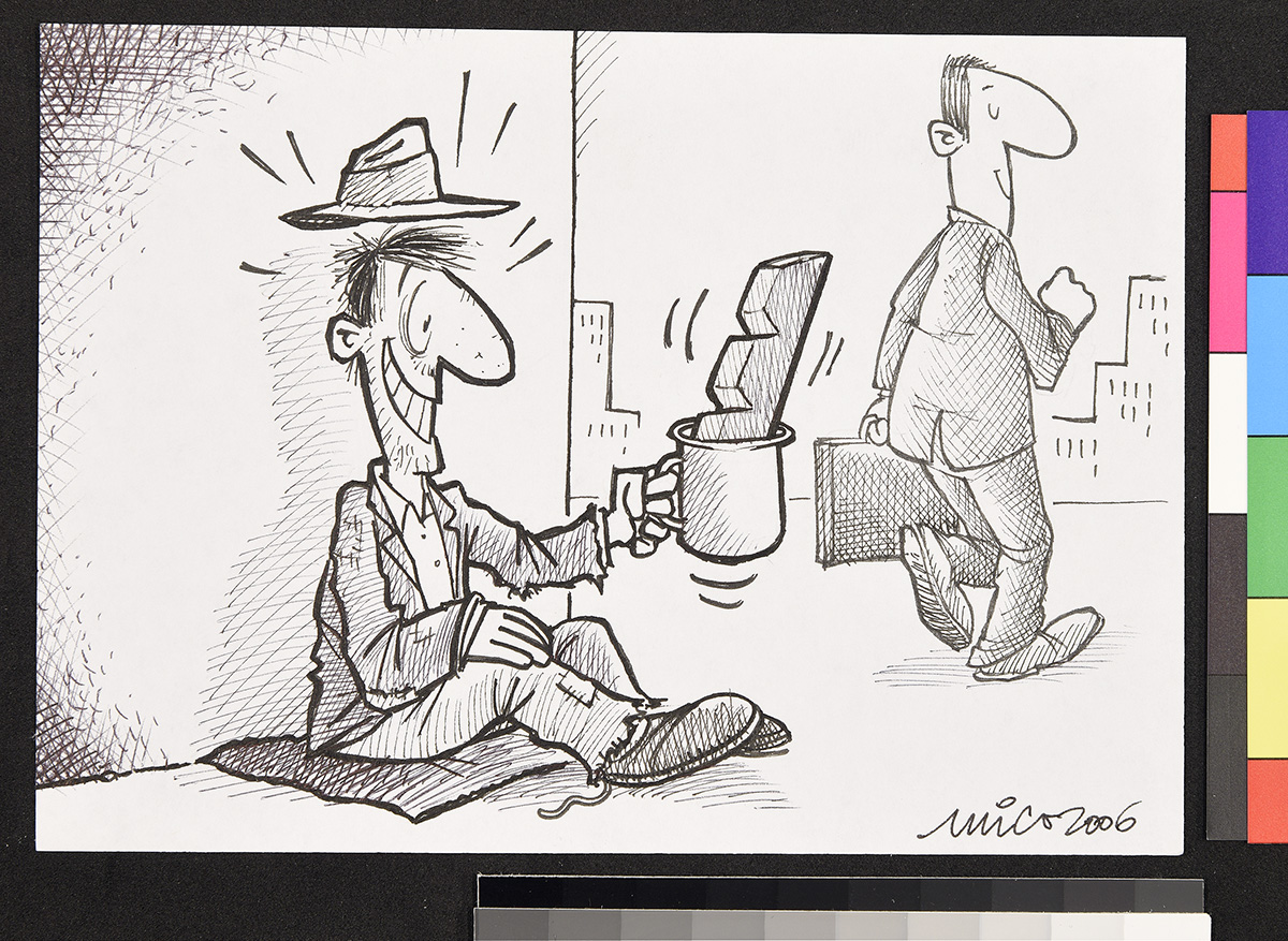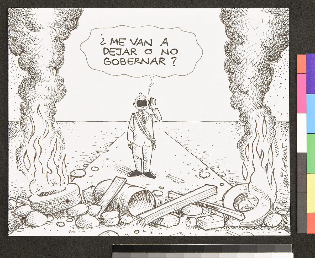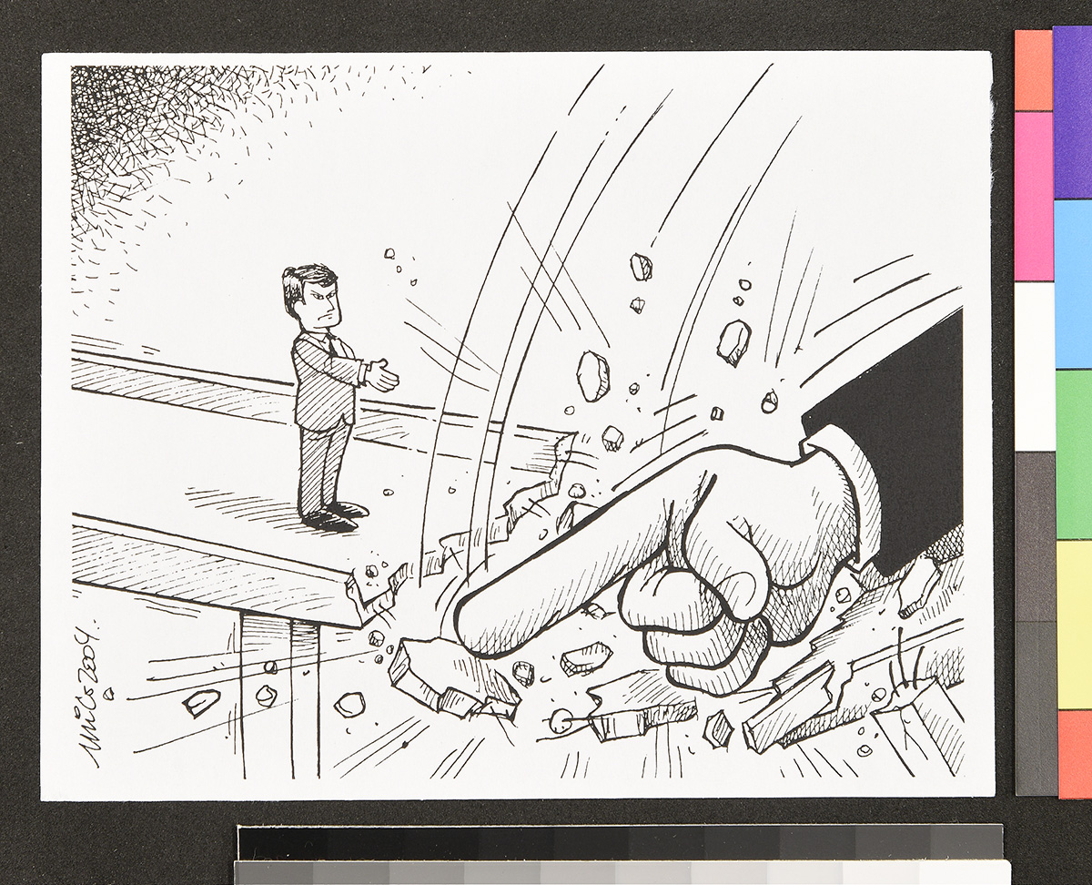 Dibujo de varios hombres en fila, sosteniendo una pancarta en apoyo a una campaña política, que tiene dos banderas de Estados Unidos en la parte superior.
