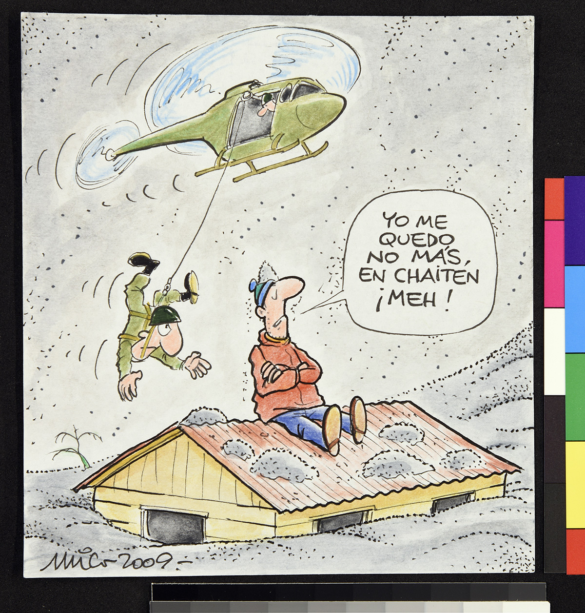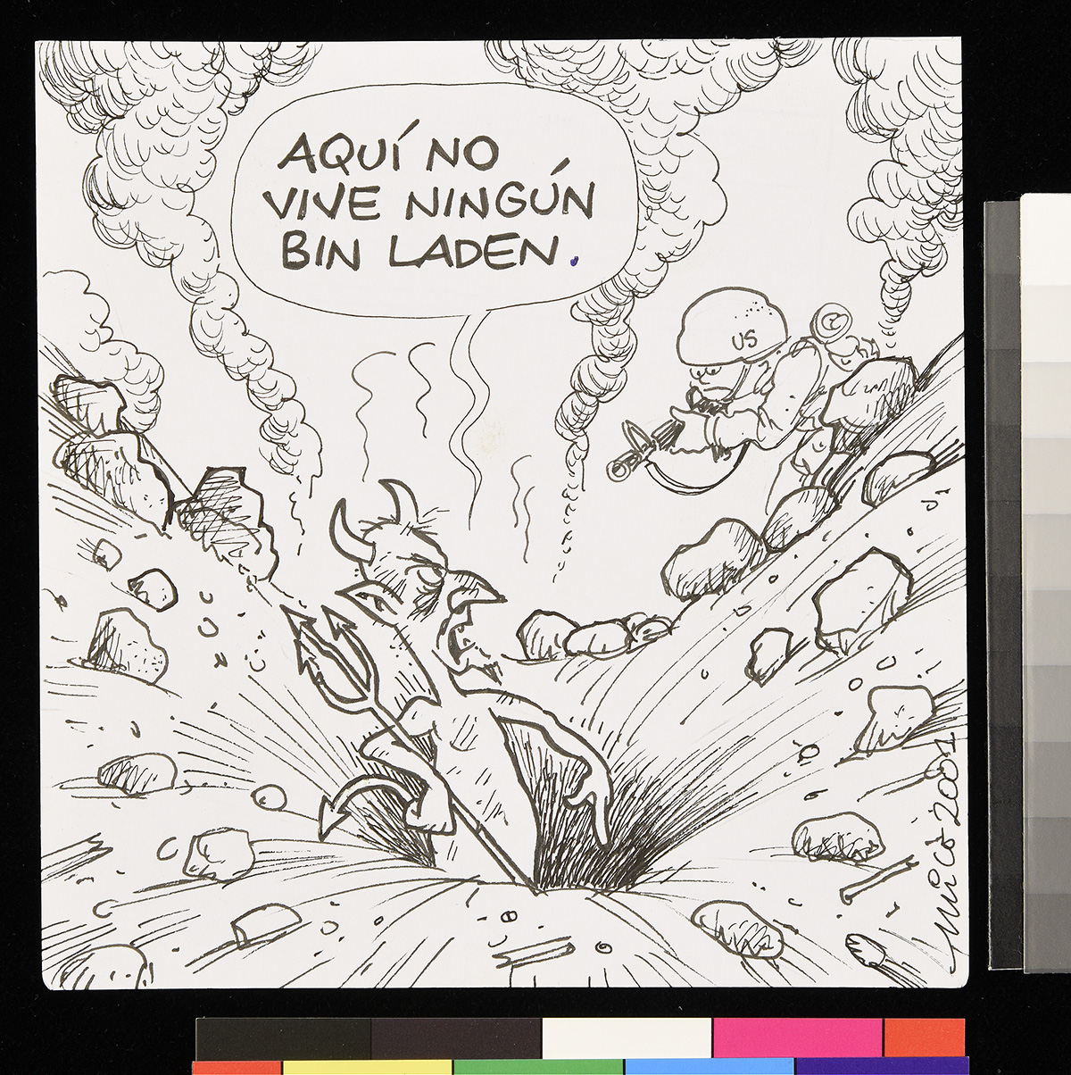 Dibujo de un hombre entregando un currículum a un guardia presidencial