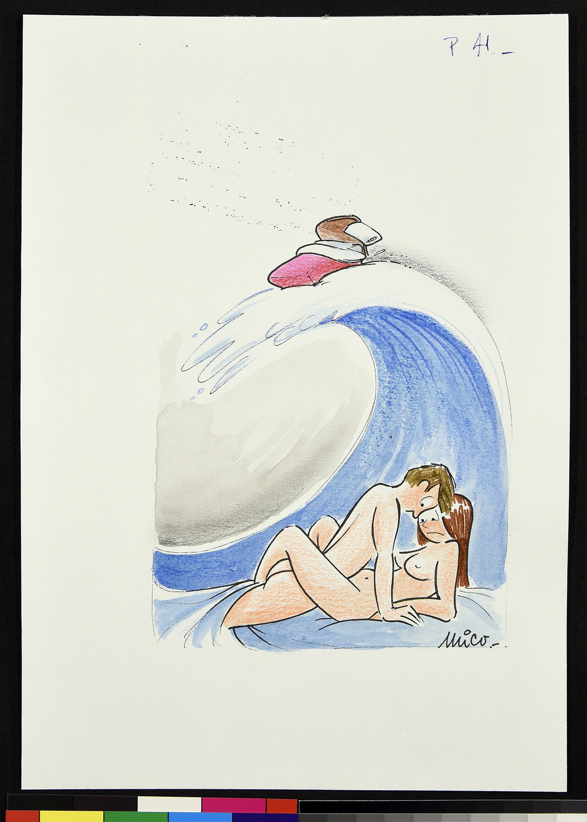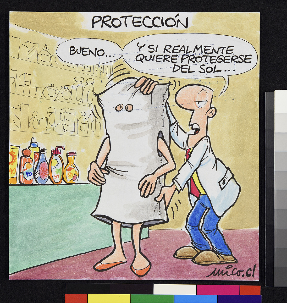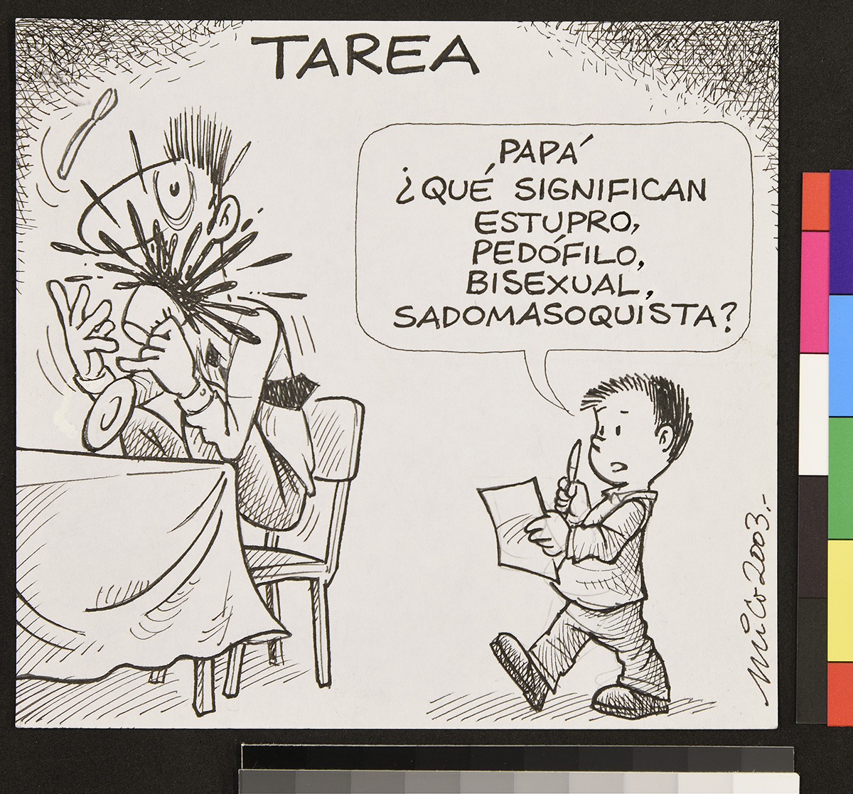 Dibujo de un hombre de lentes oscuros disfrazado de Chapulín Colorado, que ingresa por una puerta hacia una habitación donde se encuentra un sillón del cual está sentado un hombre que tiene un bastón colgando del brazo derecho.