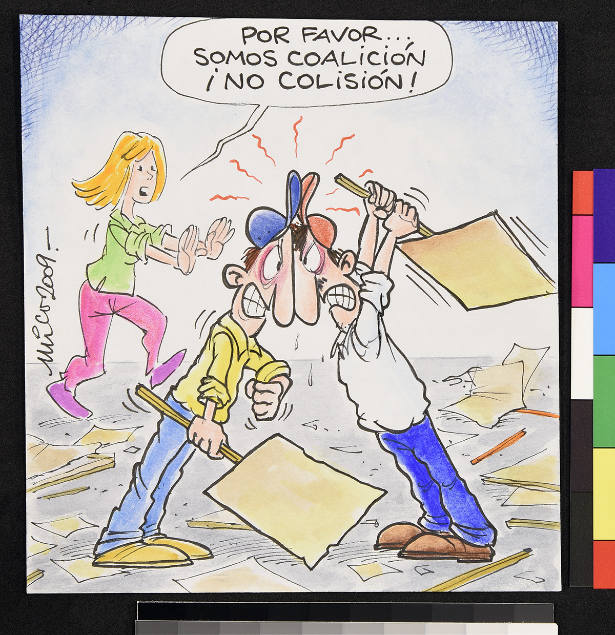 Dibujo de una mujer embarazada que va sentada sobre un burro, mientras a su lado se encuentra un hombre de pie que lleva las riendas del burro y un bastón. Son detenidos por un soldado que está armado, junto a la entrada con una gran muralla y un letrero que indica una dirección que dice “Belén”.