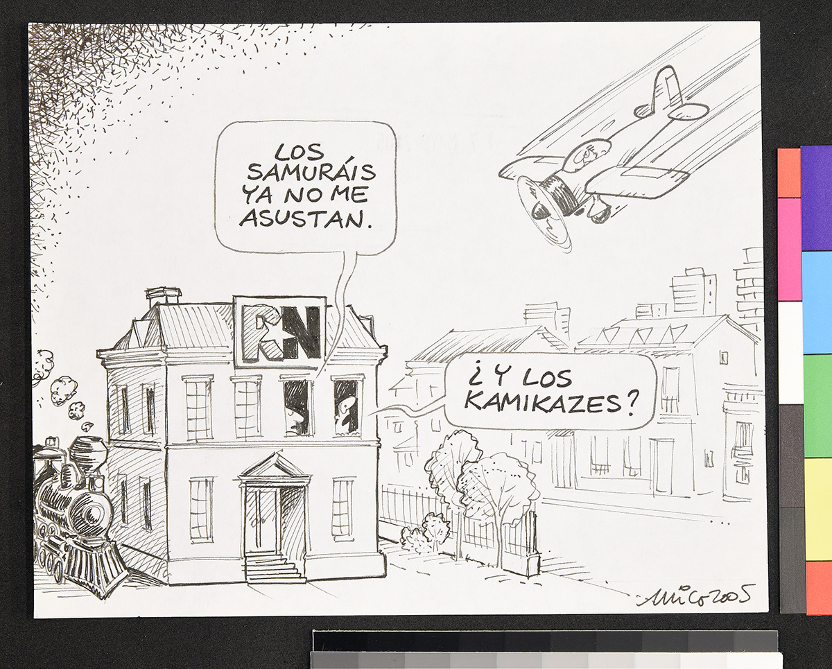 Dibujo de un hombre que apunta con sus manos su espalda, de donde se encuentra clavado un cuchillo de donde en el puñal tiene escrito “UDI”. Un hombre junto a él mira espantado.