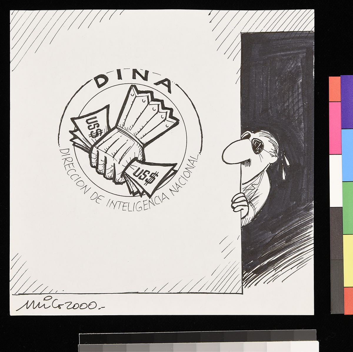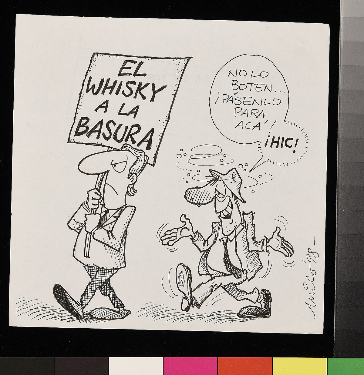 Dibujo de dos hombres haciendo fila en la entrada de la oficina de un alcalde.