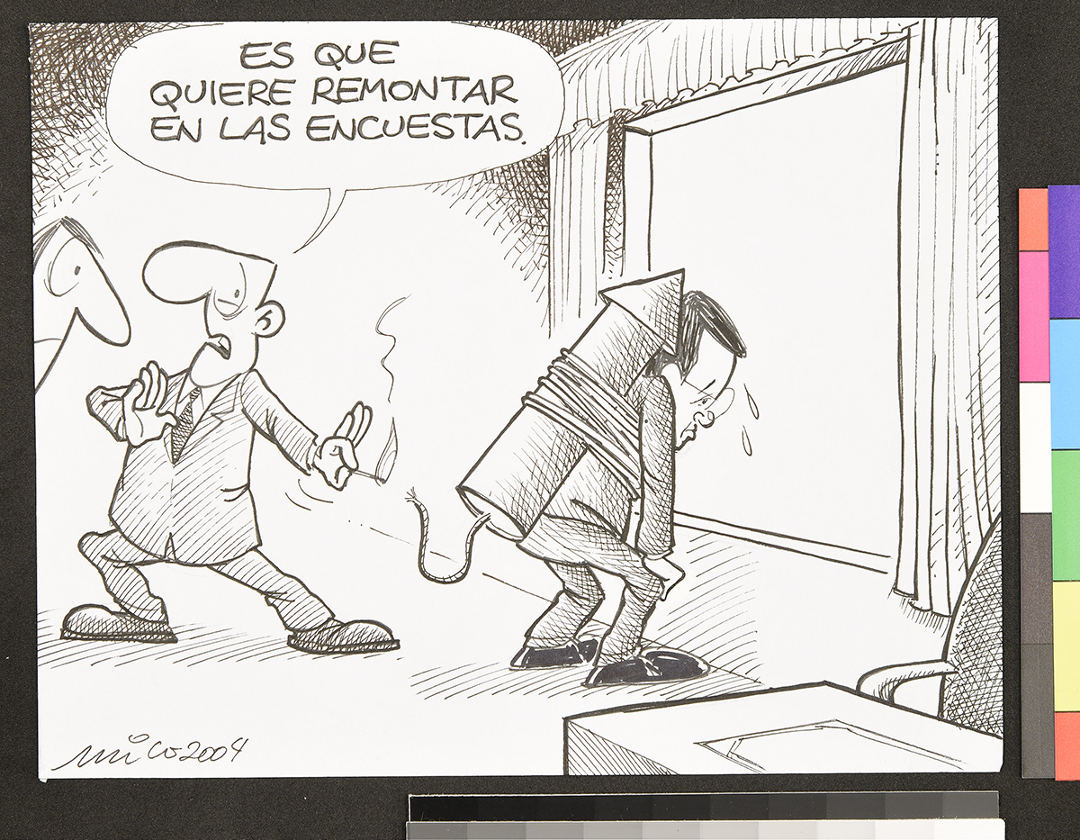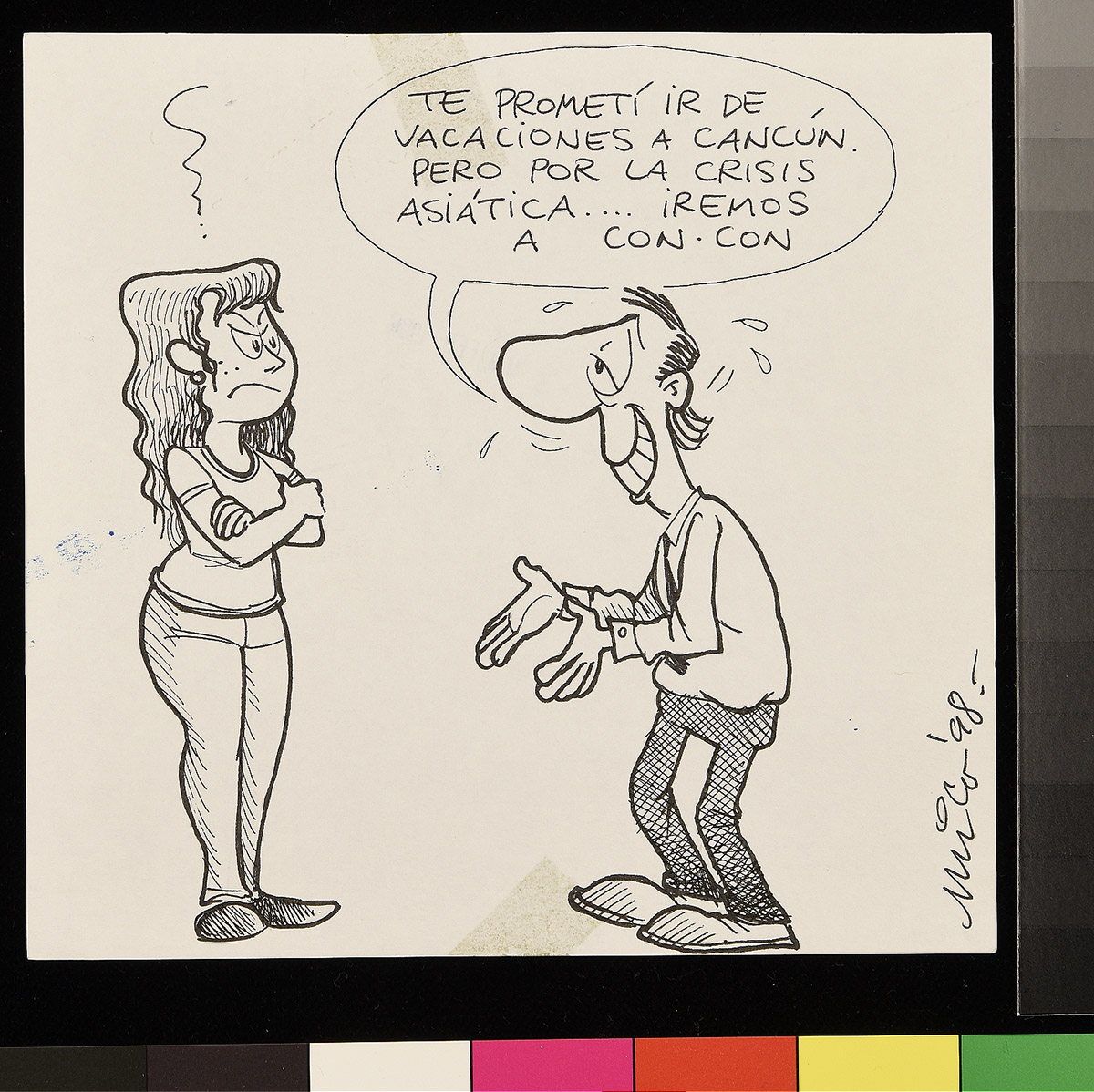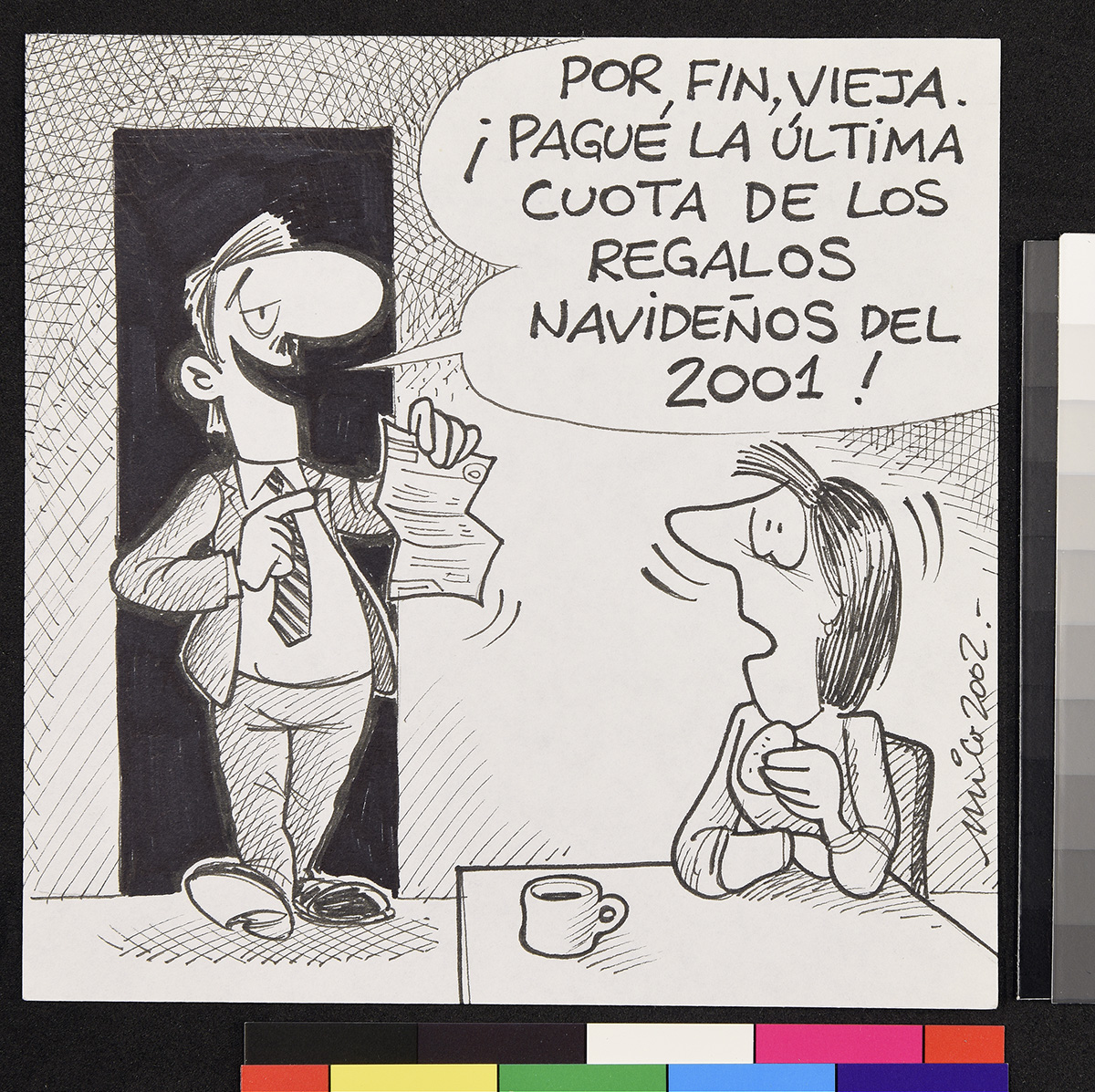 Dibujo de un hombre que camina con muchos regalos en sus manos, sin percatarse que pisa un objeto en el suelo. Un niño a su lado grita y corre para advertir lo sucedido.