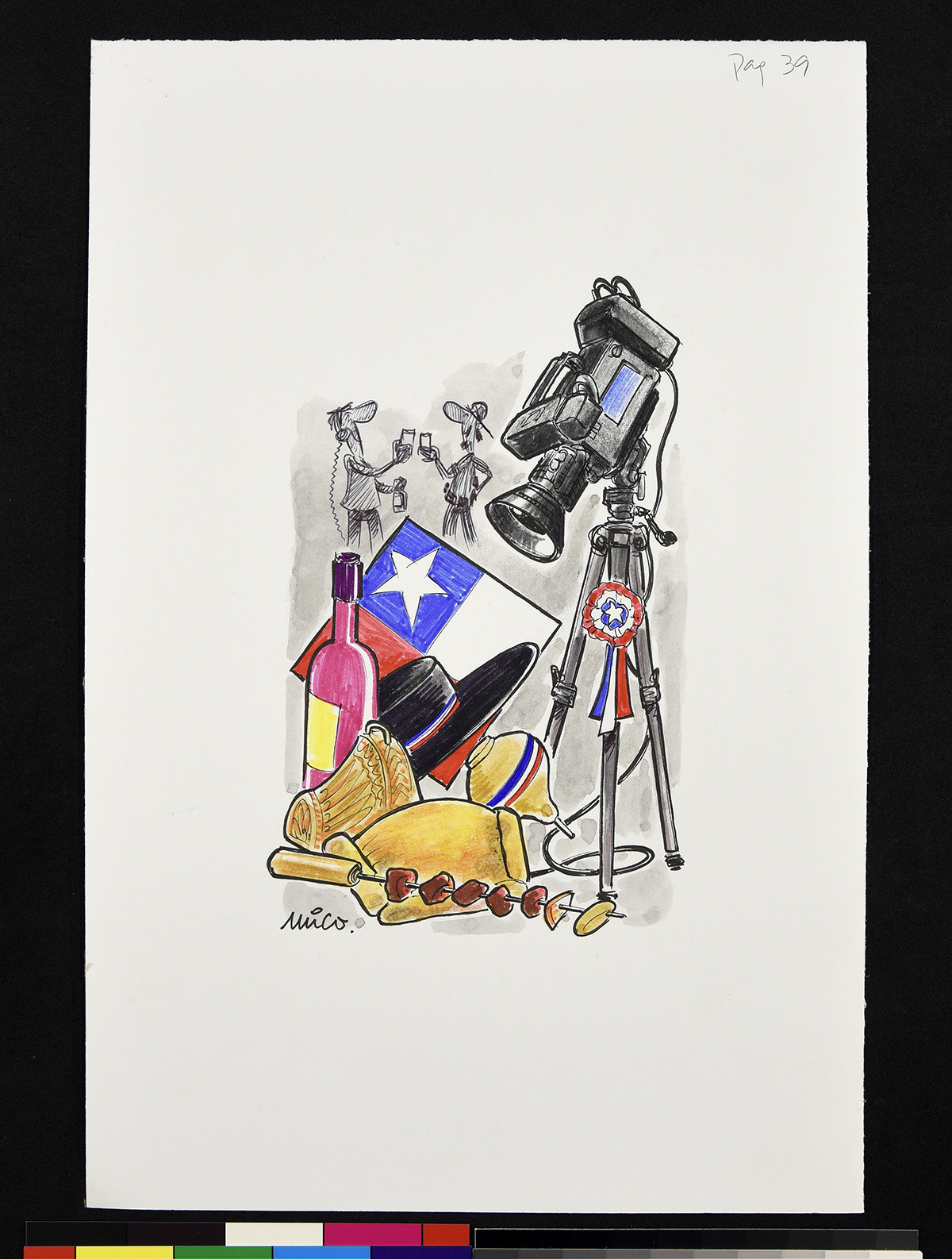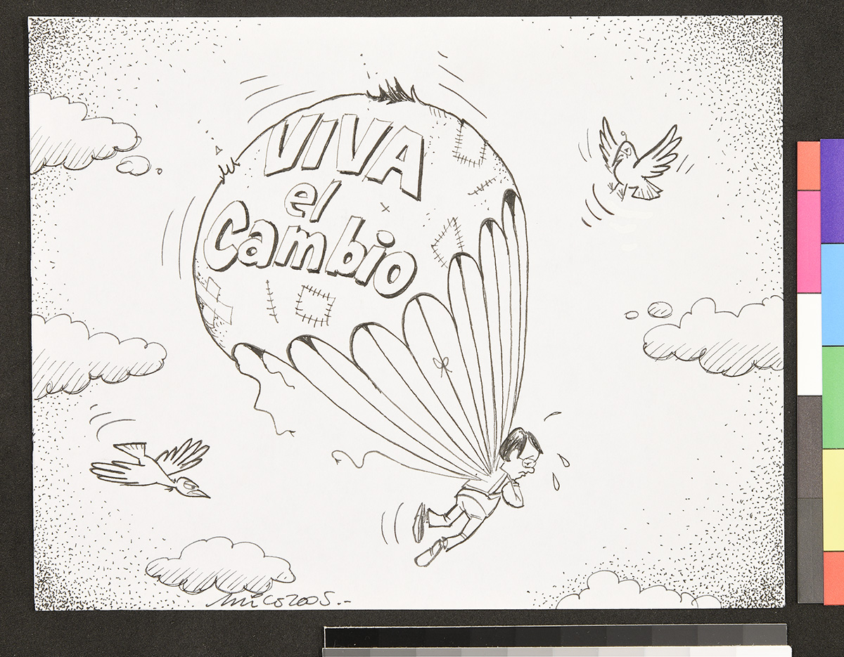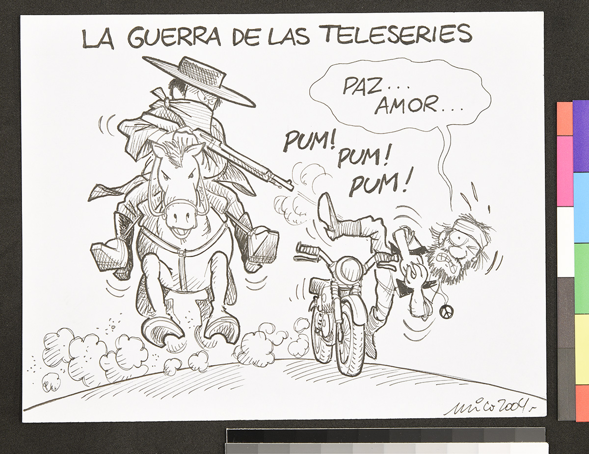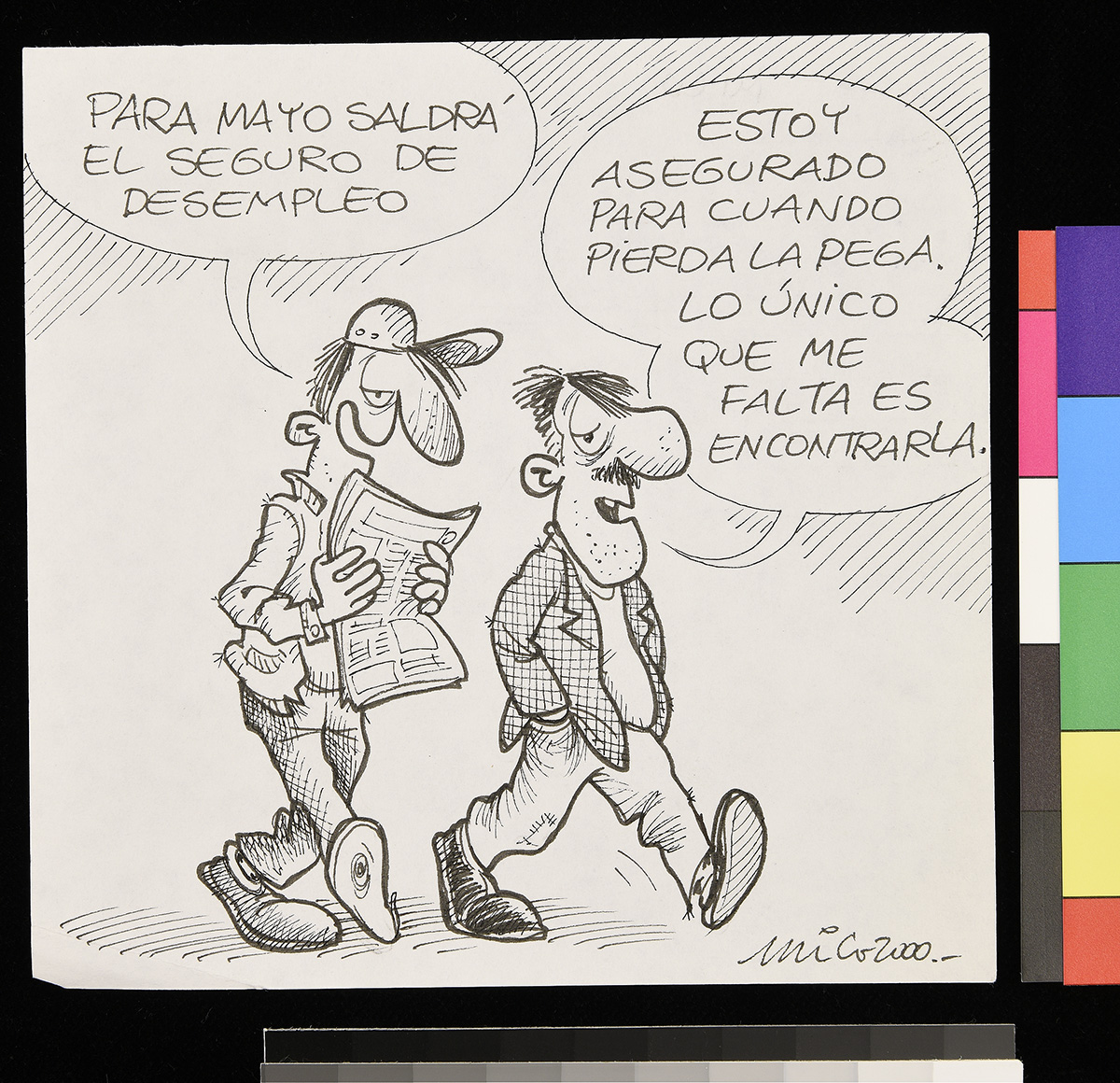 Dibujo de un hombre que camina con muchos regalos en sus manos, sin percatarse que pisa un objeto en el suelo. Un niño a su lado grita y corre para advertir lo sucedido.