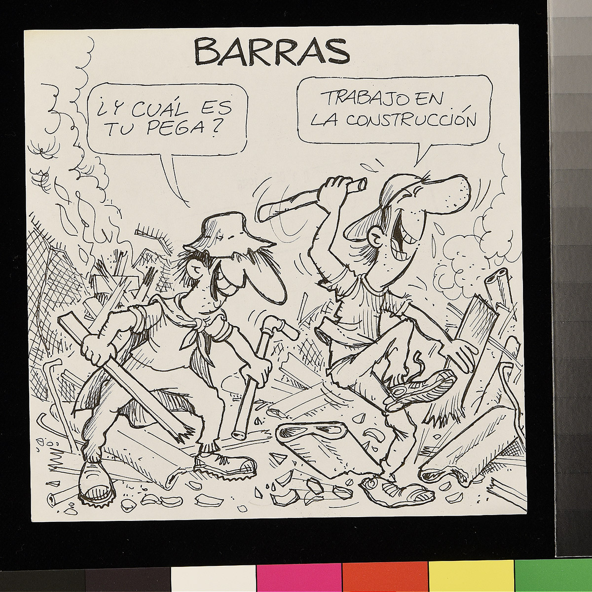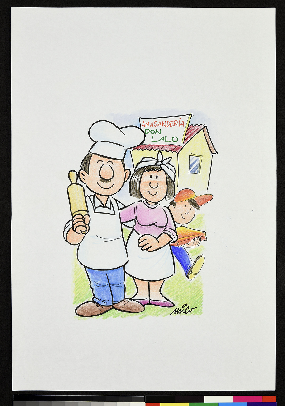 Dibujo de un hombre que está sentado en una silla de oficina, que habla por teléfono mientras sostiene una taza. Le está dando la espalda a un gran panel de control, de donde se pueden ver a cuatro extraterrestres haciendo caras chistosas por una pantalla.