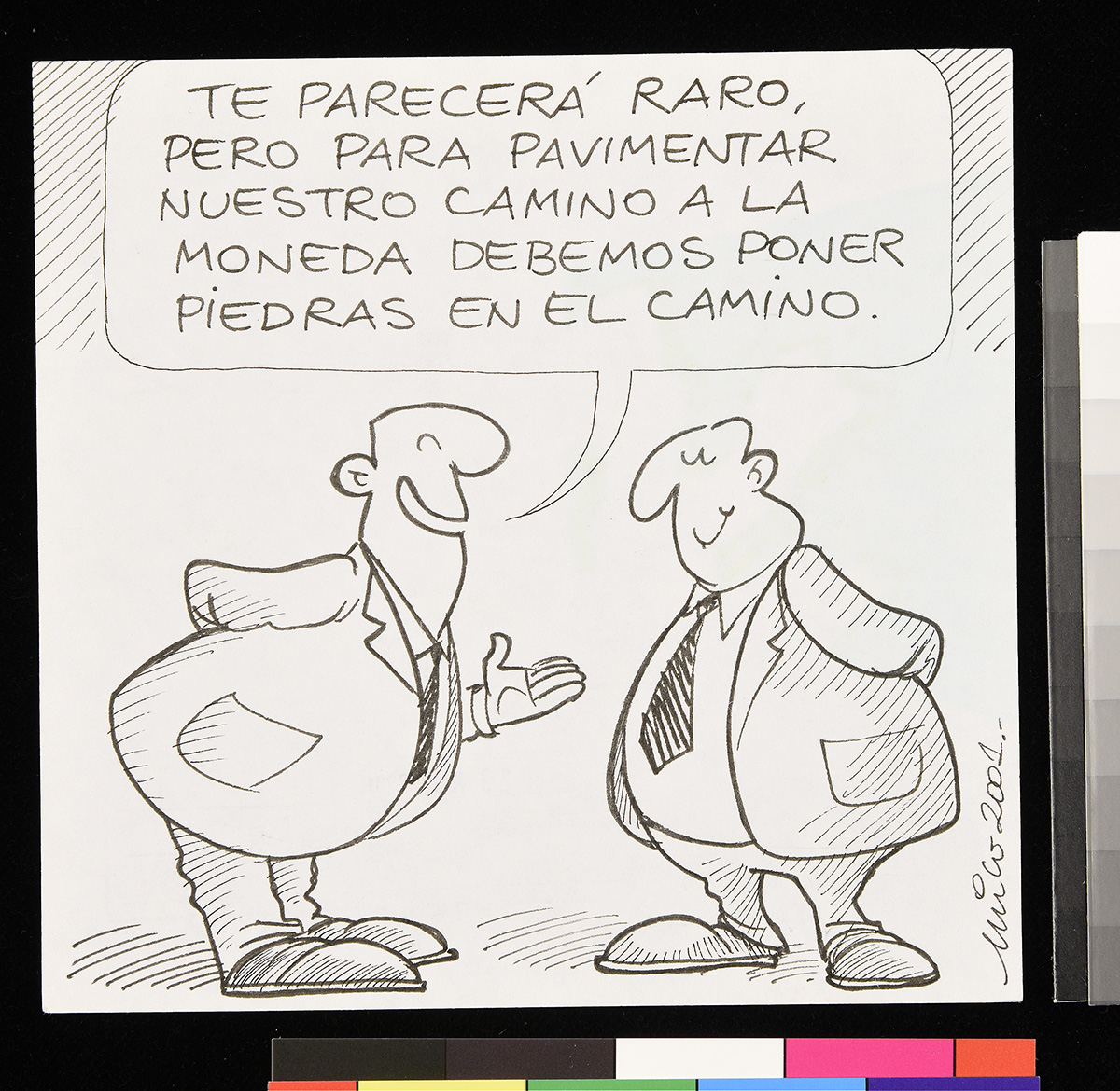 Dibujo de dos jugadores de fútbol, donde uno se encuentra colgado del cuello en el centro del arco con la pelota de fútbol sosteniéndolo desde sus pies, mientras el otro se dispone a pegarle a la pelota con el pie.