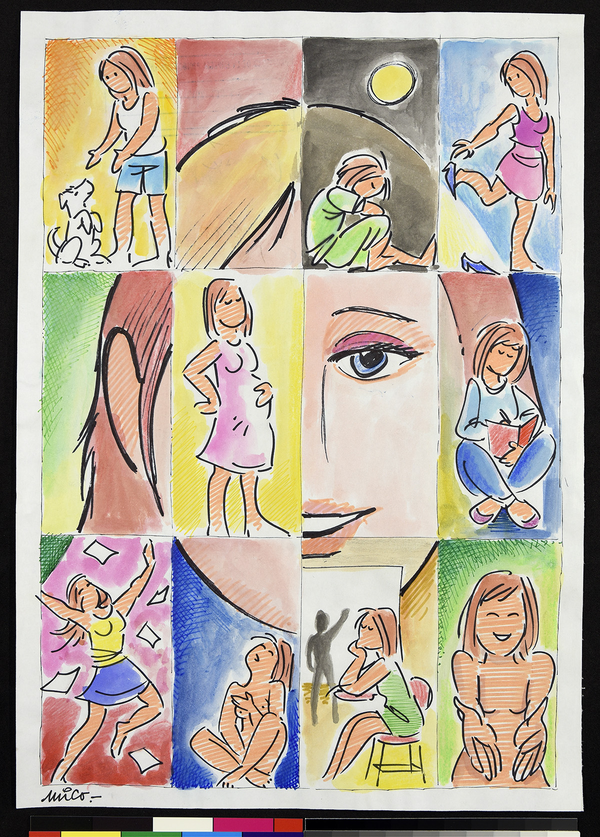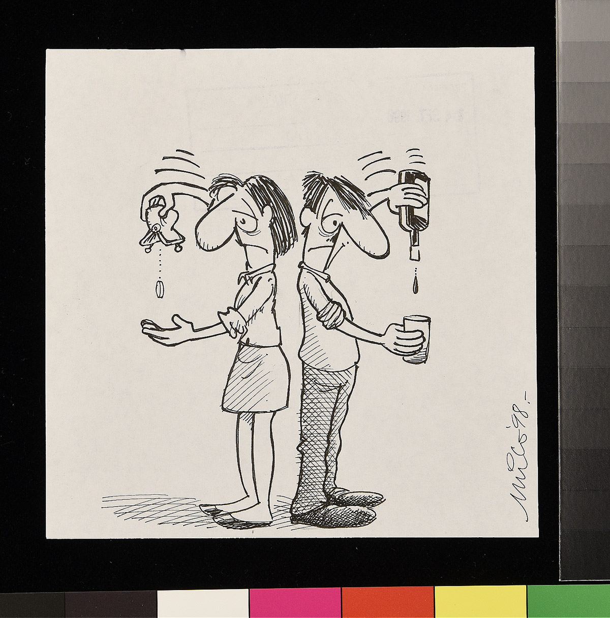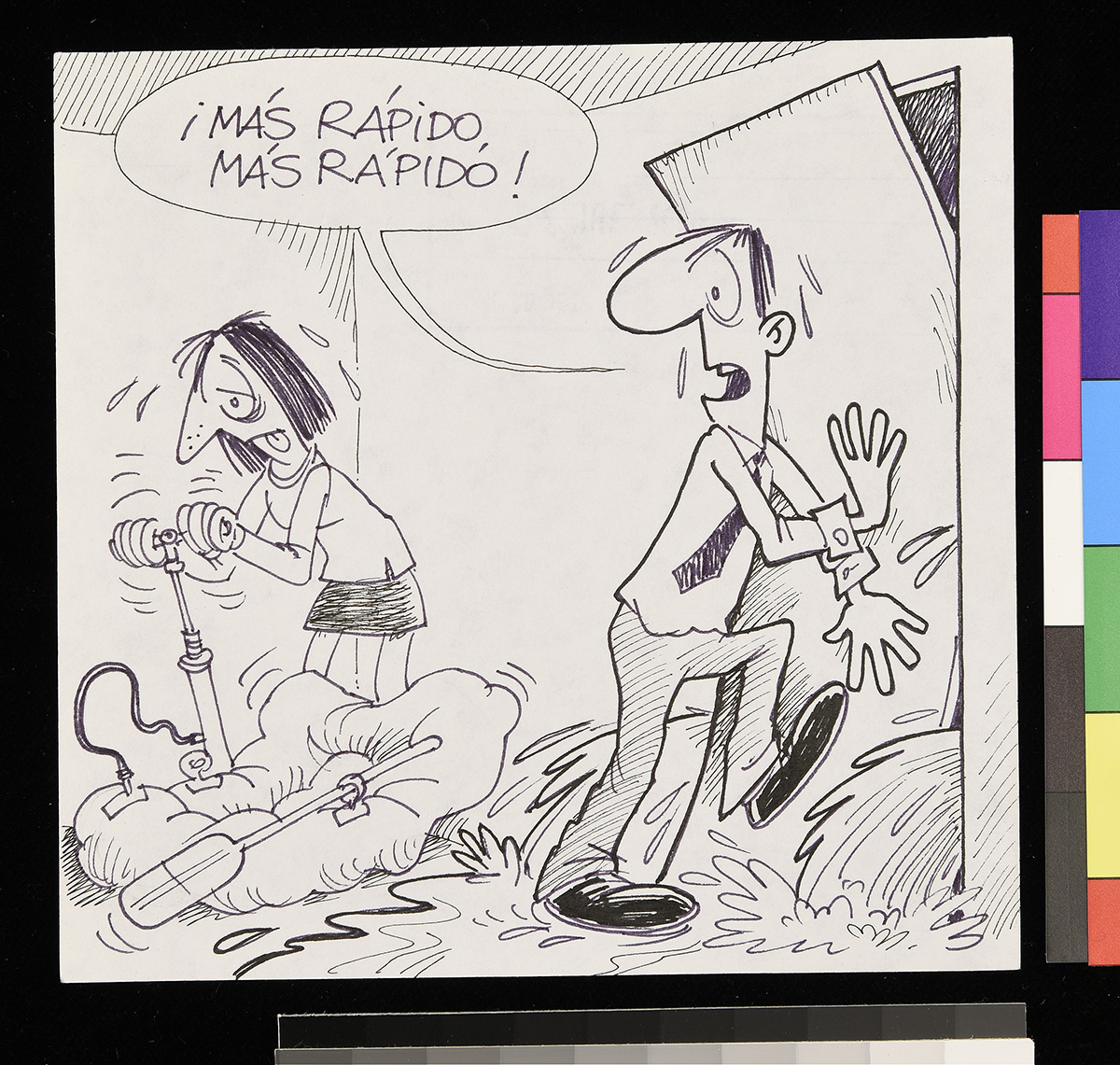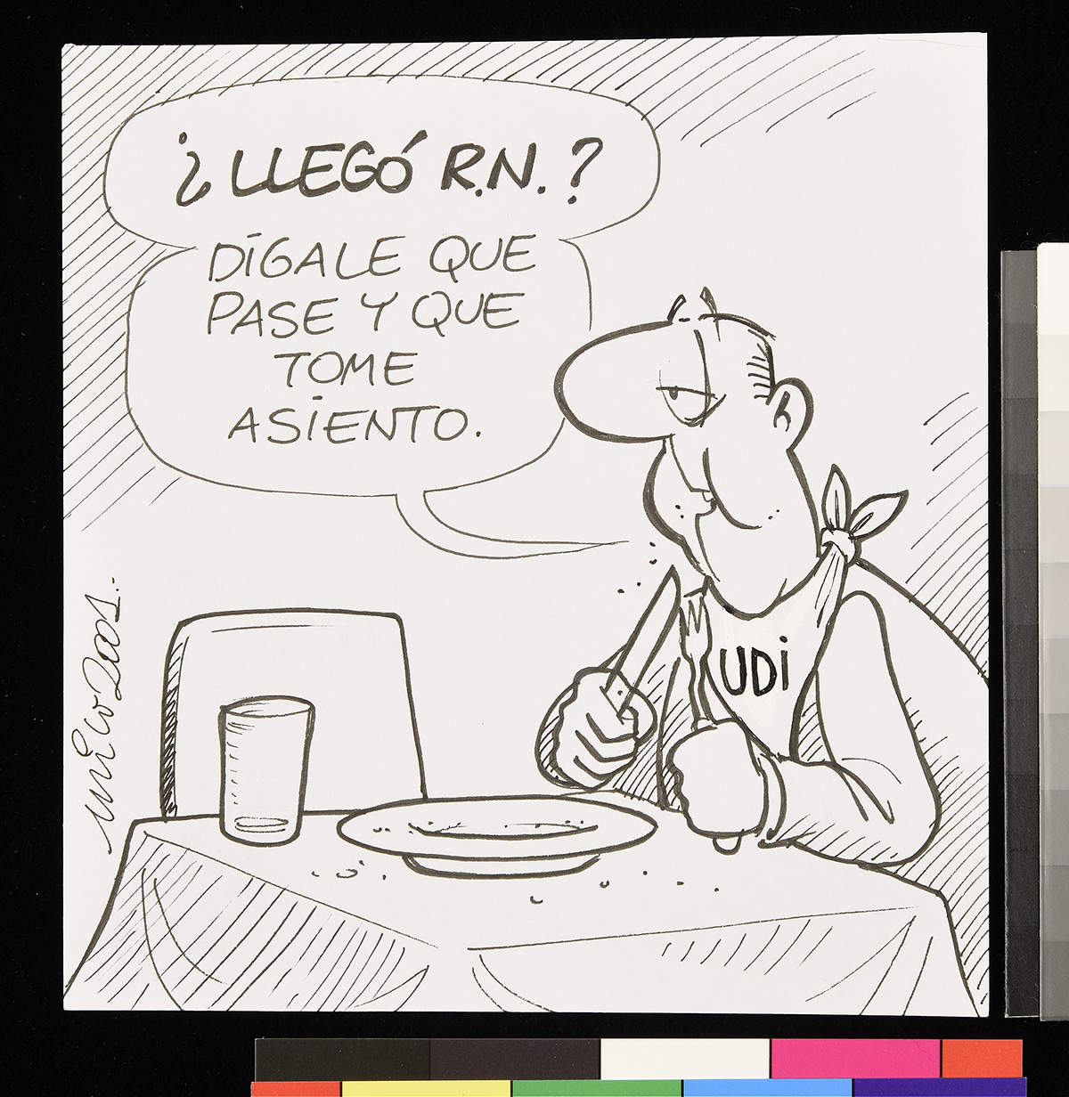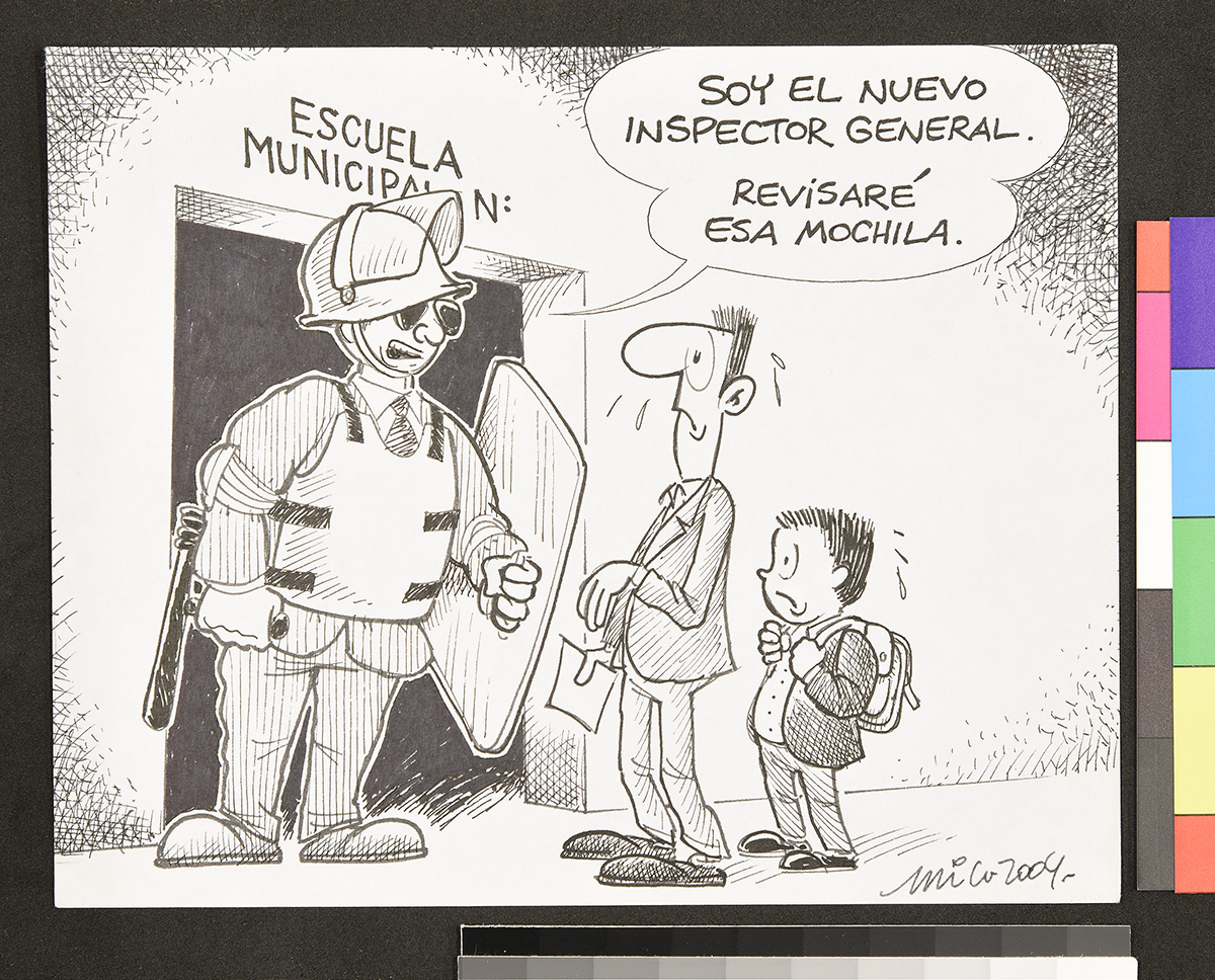 Dibujo de un hombre sentado frente a un mesa comiendo, mientras habla con un niño que sale a la escuela llevando en su mochila un tronco de leña. Un gato come un pan debajo de la mesa.