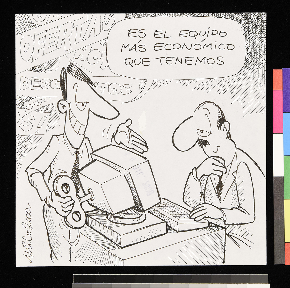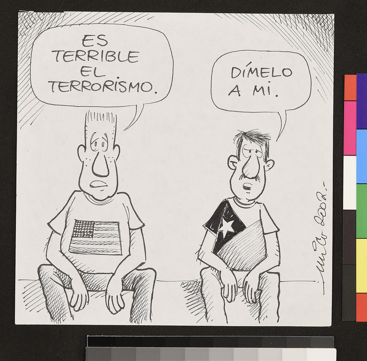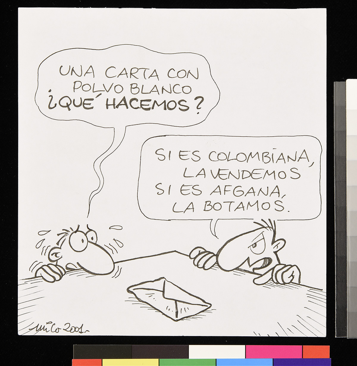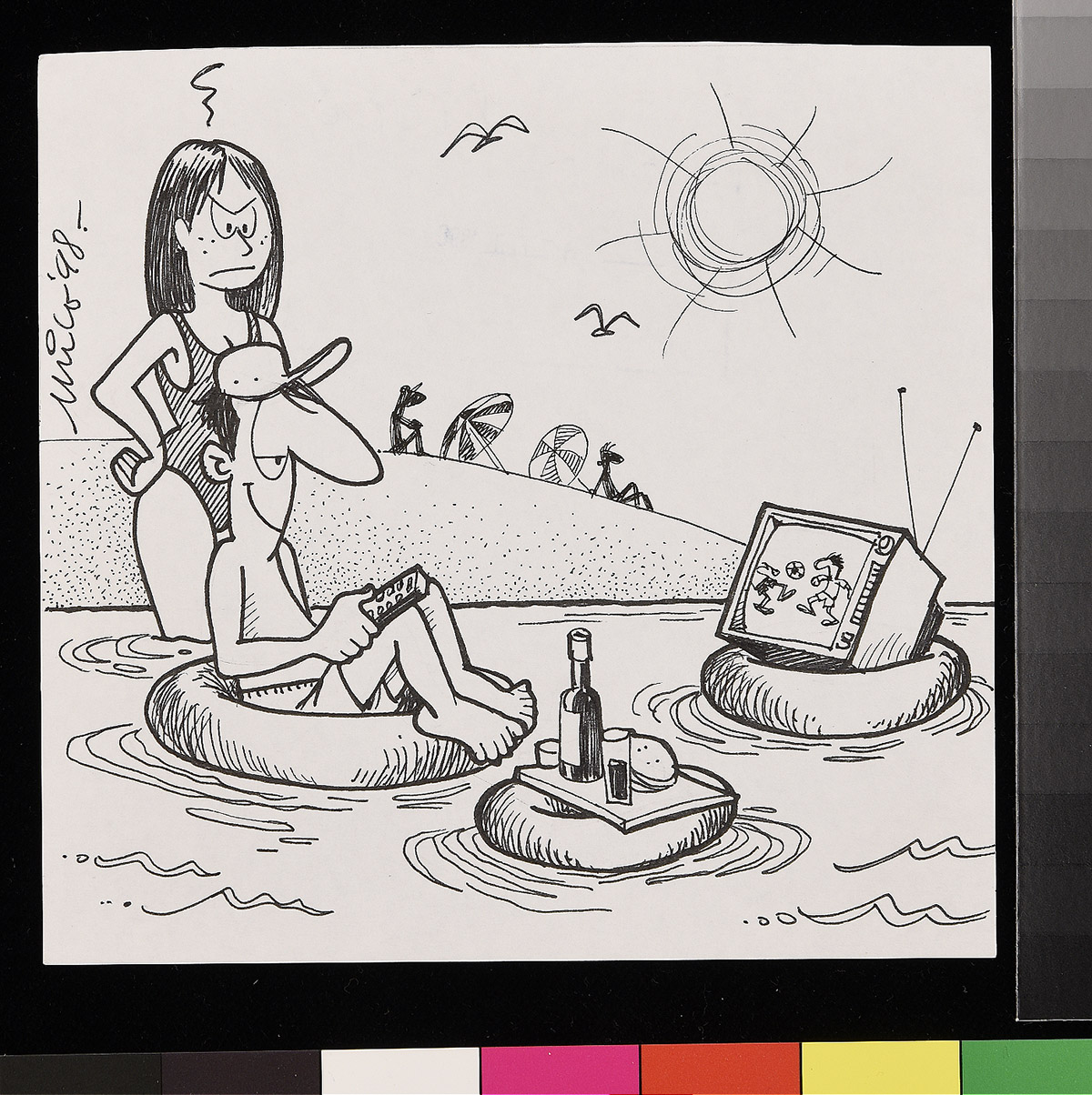 Dibujo de un marino que mira a un hombre frente a él que sostiene una chica y apunta su etiqueta.