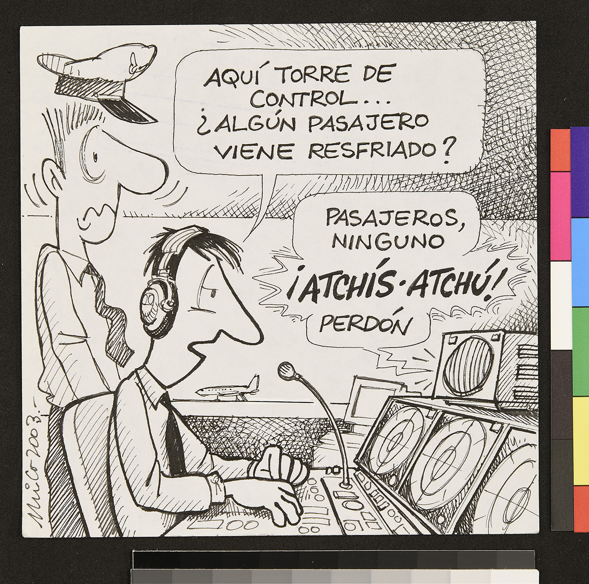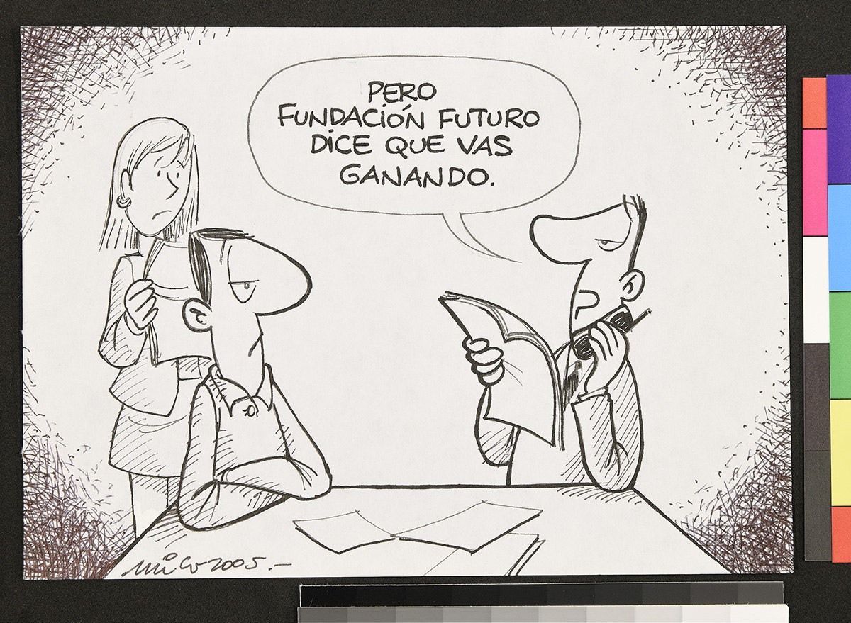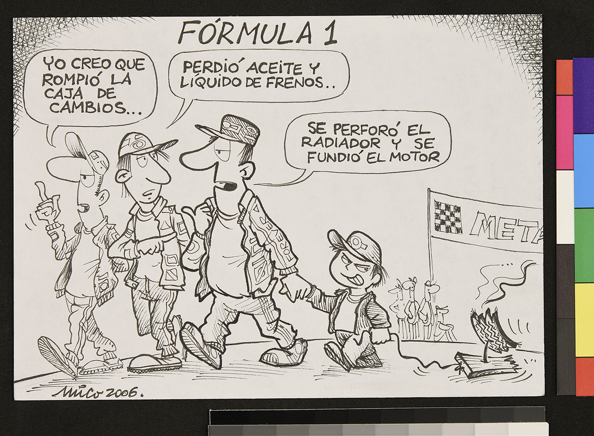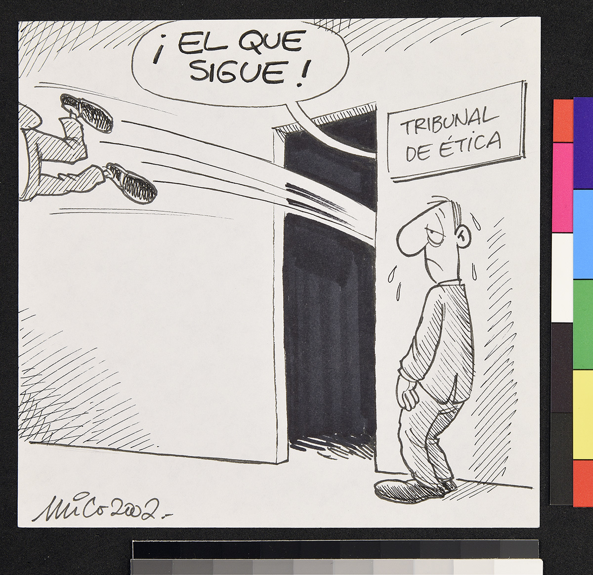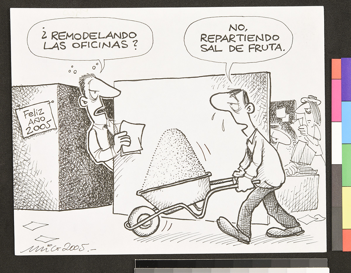 Dibujo de un marino que mira a un hombre frente a él que sostiene una chica y apunta su etiqueta.