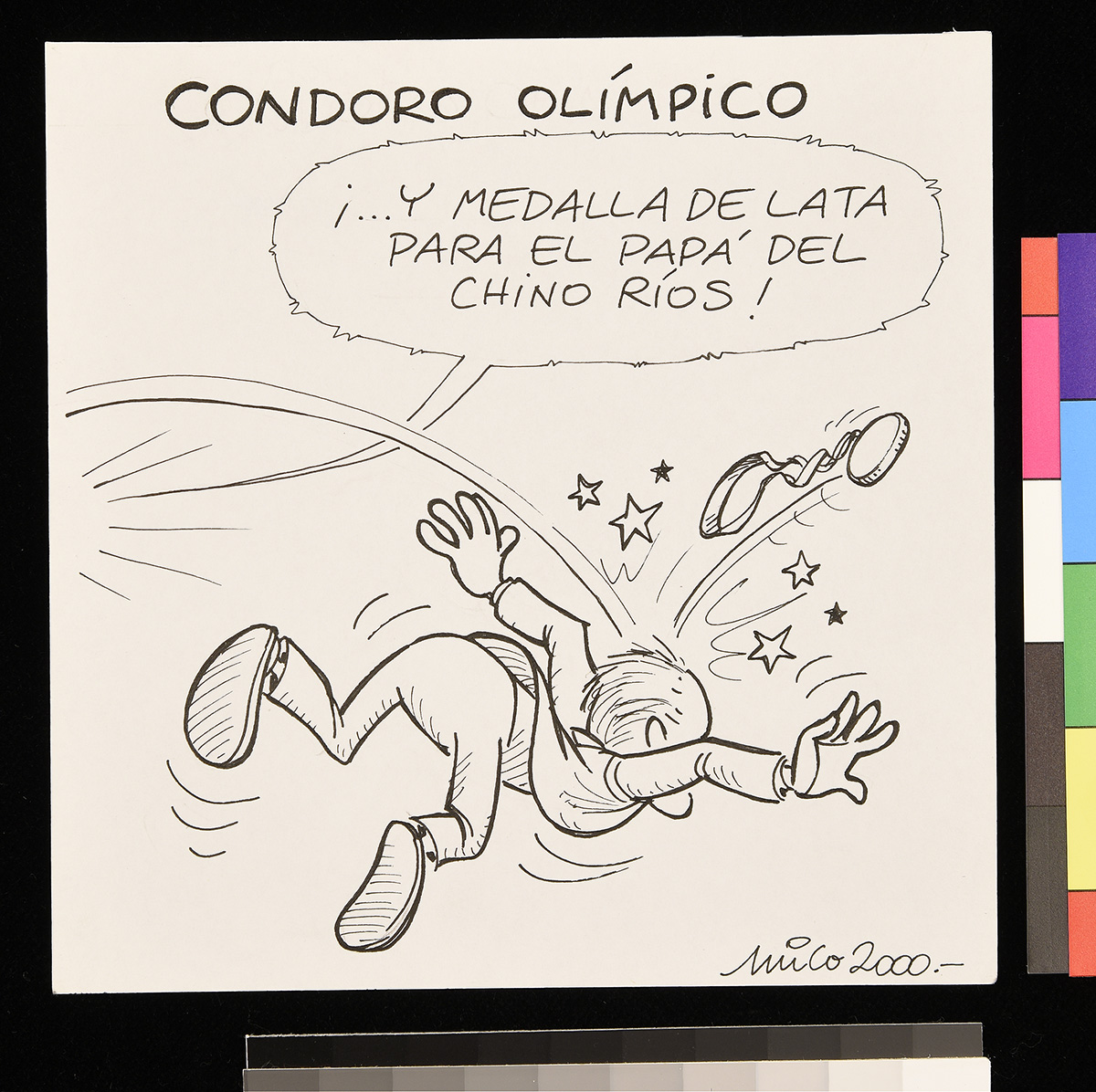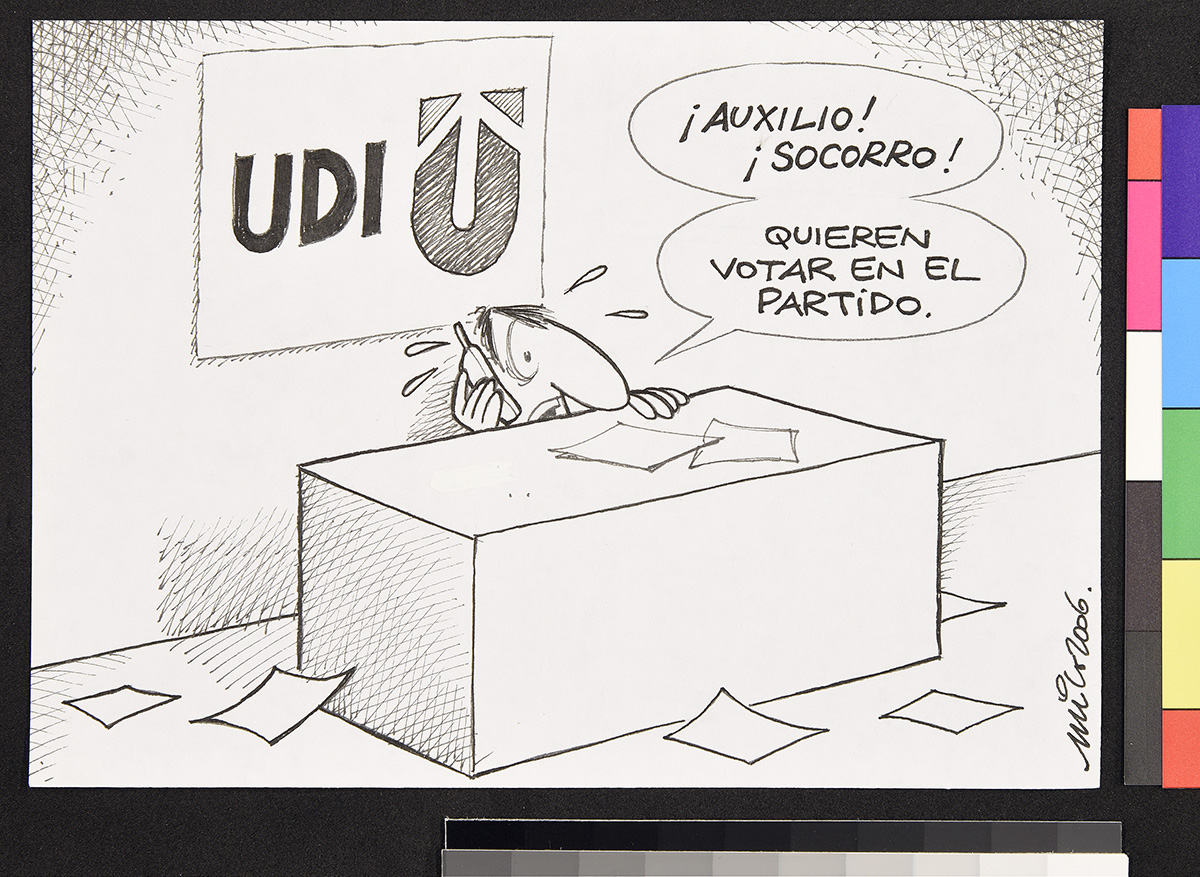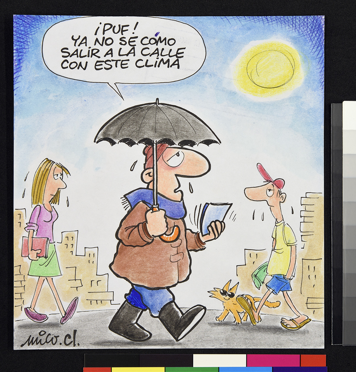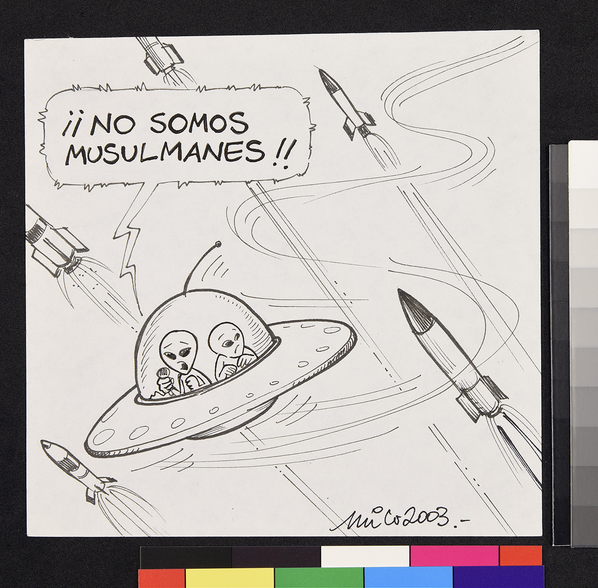 Dibujo de un marino que mira a un hombre frente a él que sostiene una chica y apunta su etiqueta.