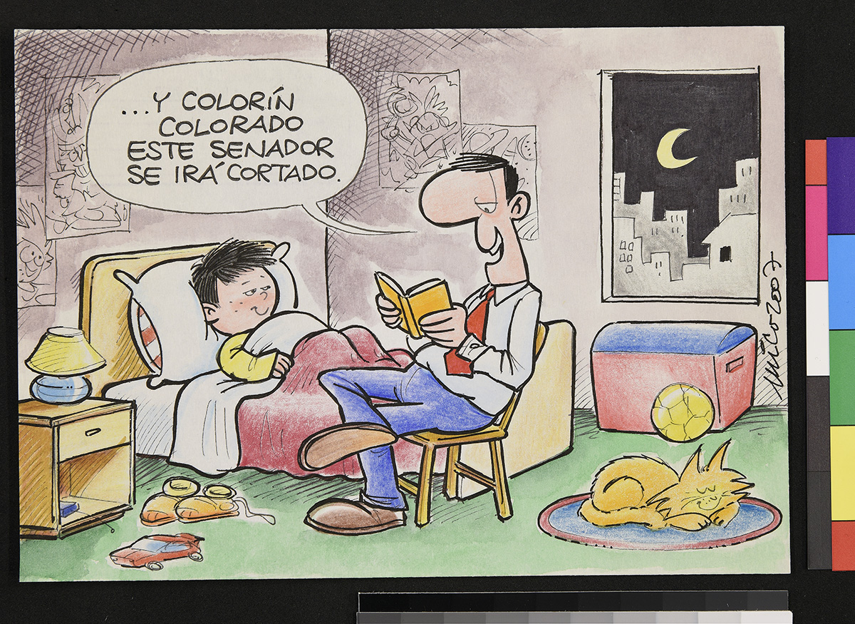 Dibujo de una familia en el living de su hogar, hay un gato con ellos